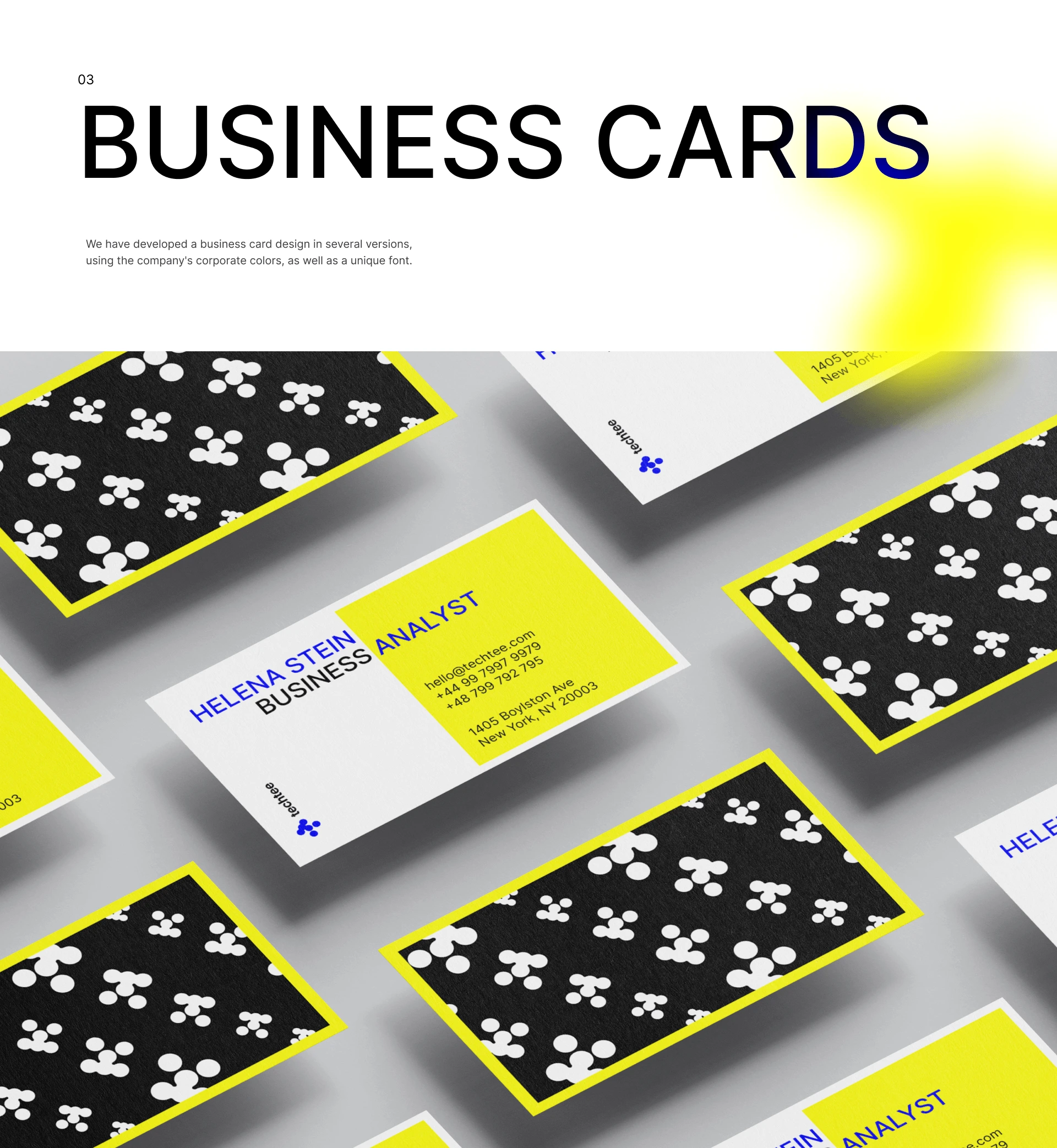 Brand asset development, including business cards in multiple versions using Techeeās corporate color palette and a distinctive typeface