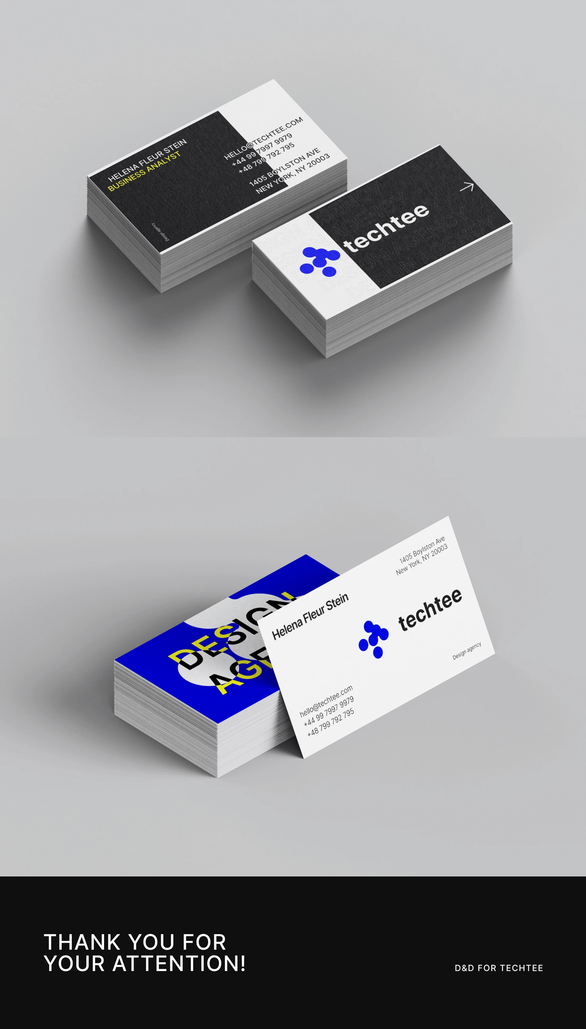 In addition, I designed a custom business card package using Techeeās brand colors and typography. Each version emphasizes visual identity and uniqueness while maintaining brand consistency.