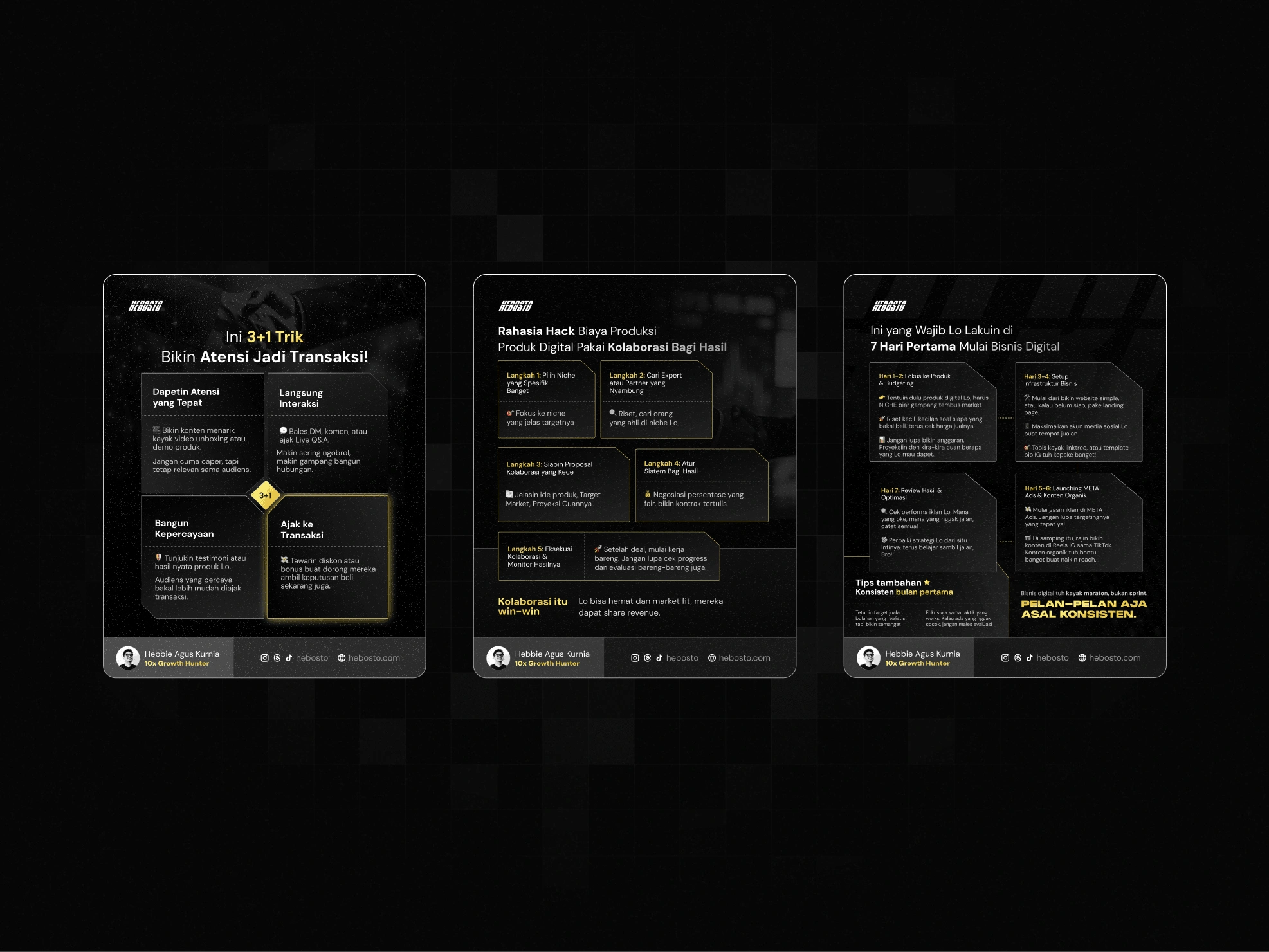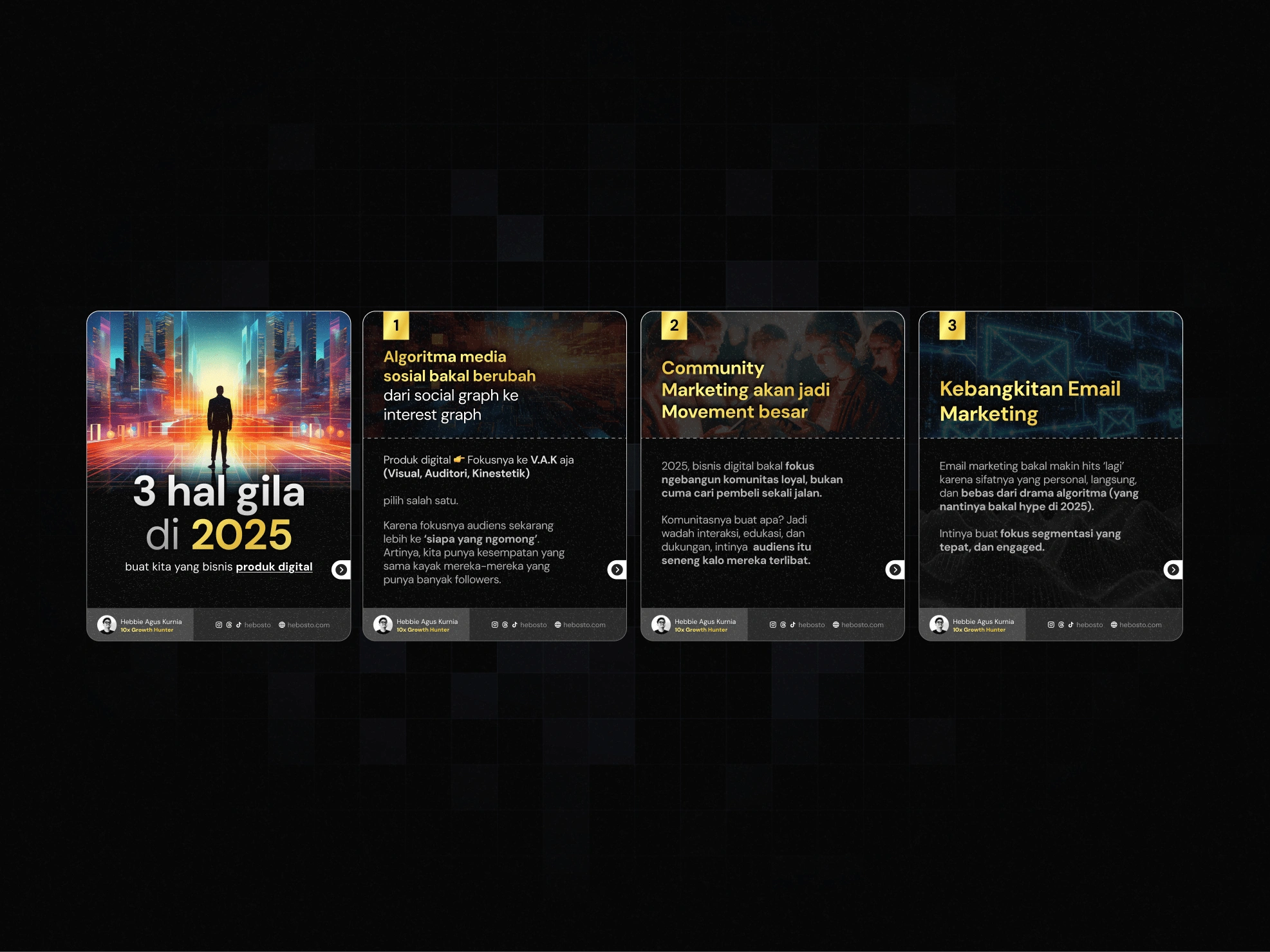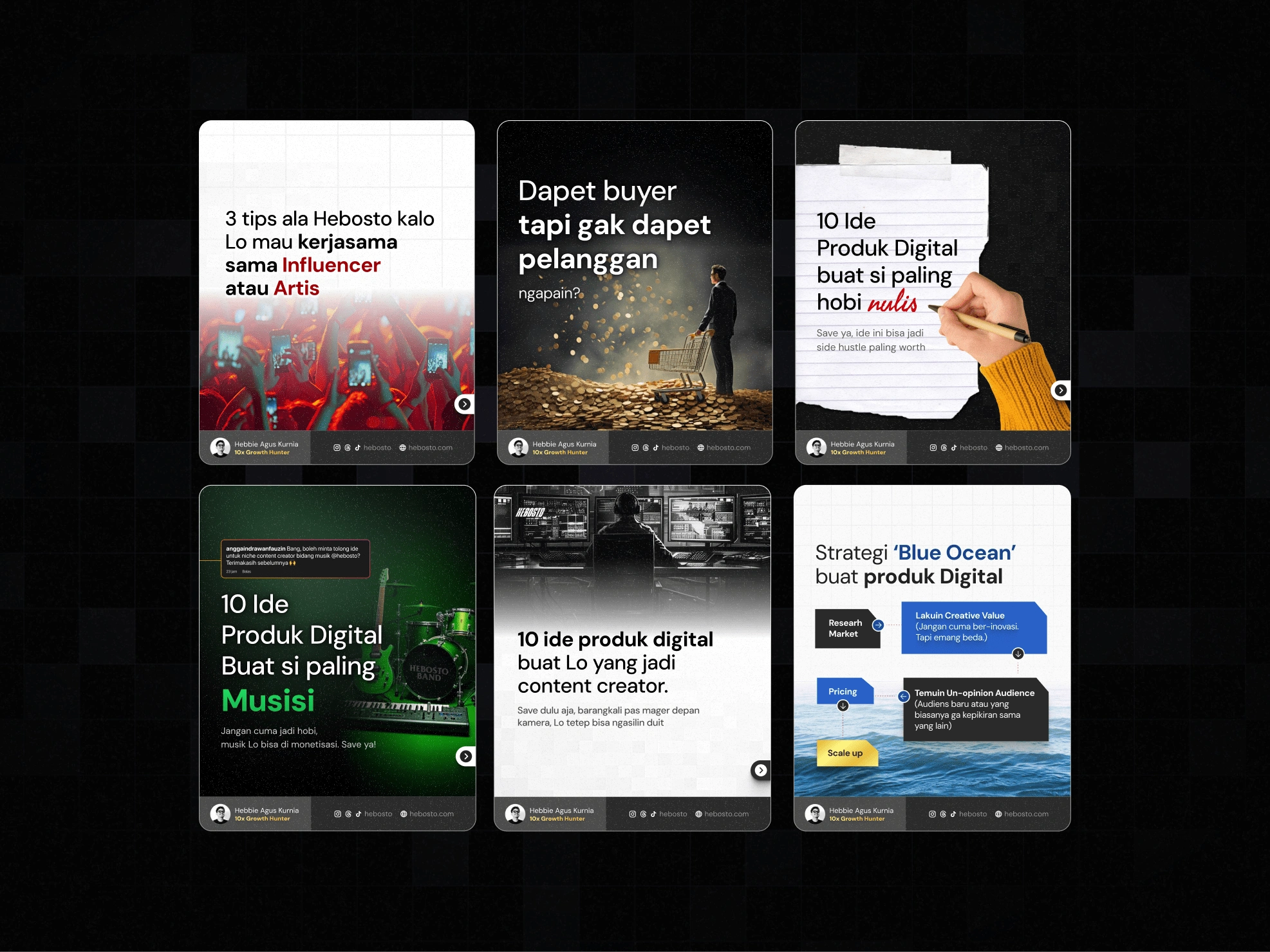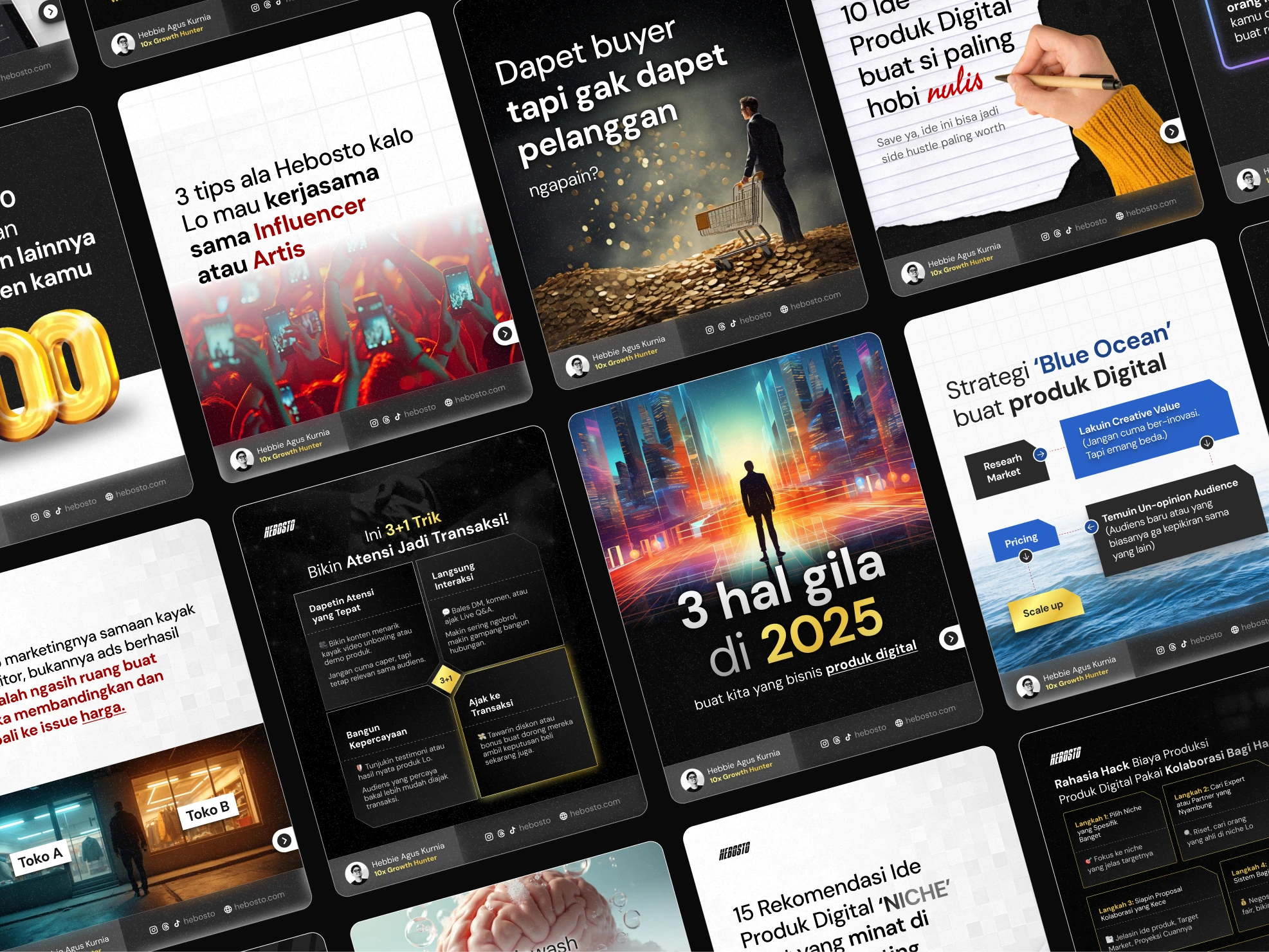 I designed a series of bold and cohesive carousel posts for a business and marketing influencer in Indonesia. Each carousel covered different topics—ranging from marketing tips to business mindset—but maintained a unified visual identity through consistent typography, layout structure, and strong color palettes. This project strengthened my skills in creating educational content that is both visually striking and easy to follow across multiple posts.