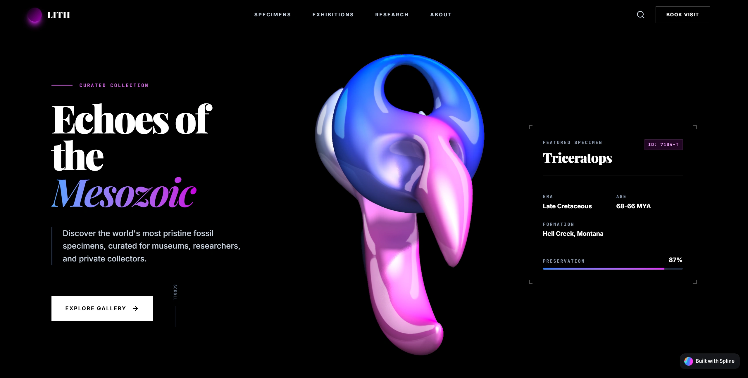 This hero section explores interactivity, design, and visual storytelling. The main feature is a minimal, liquidy Triceratops built in Spline using the shape blend feature. The model rotates and changes shape smoothly. Users can pan and orbit around it to see it from different angles and explore its details.