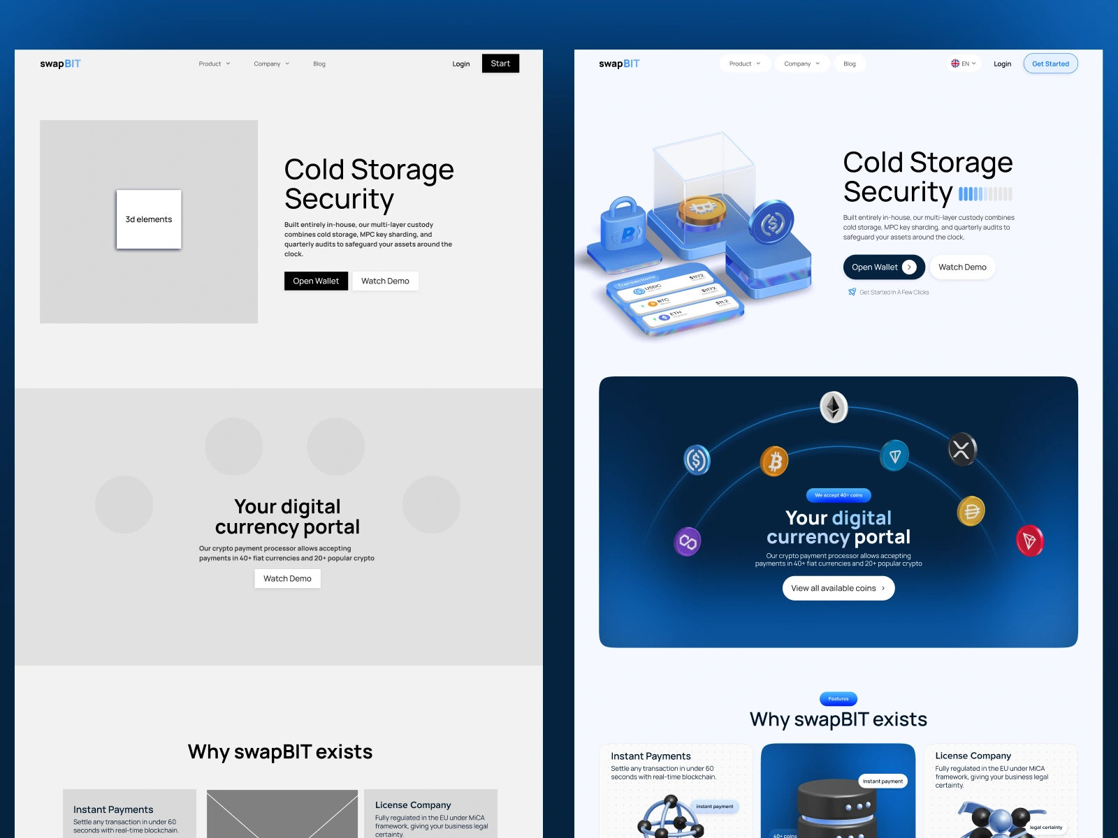 Landing page design for a crypto cold storage platform. Clean light UI with bold dark-blue accent sections and 3D hero elements — balancing trust and visual impact. Modular section structure easily adaptable to any fintech or SaaS product.
