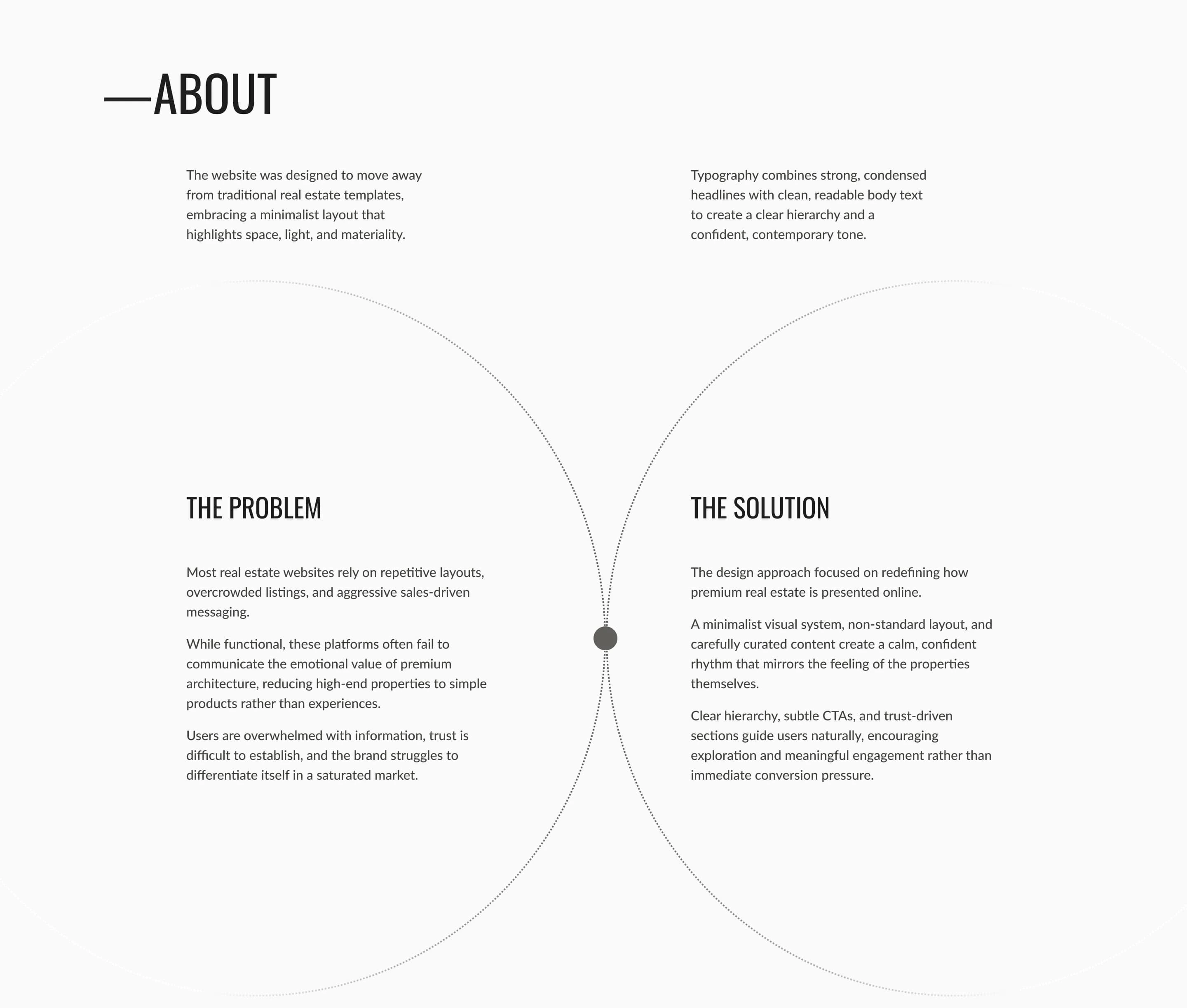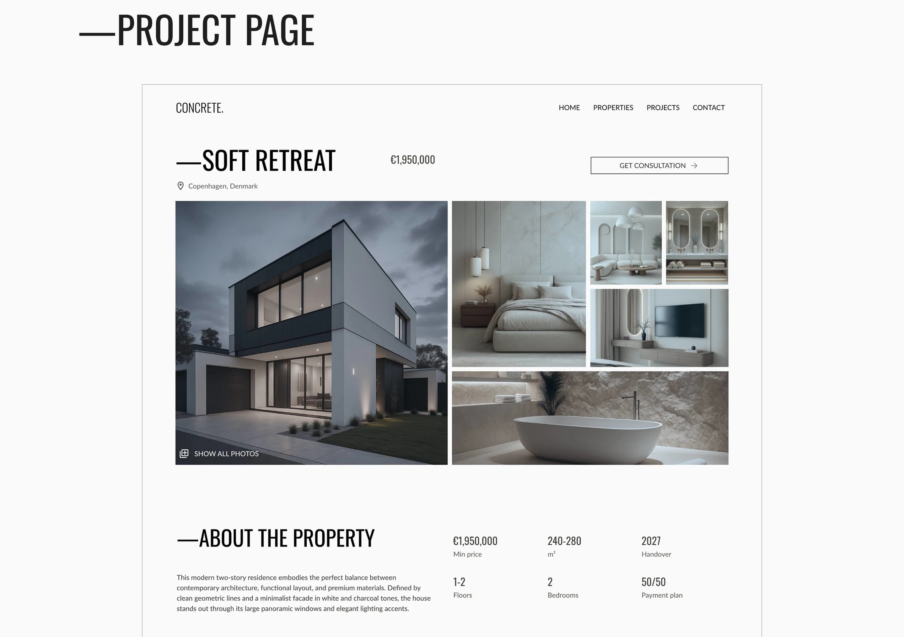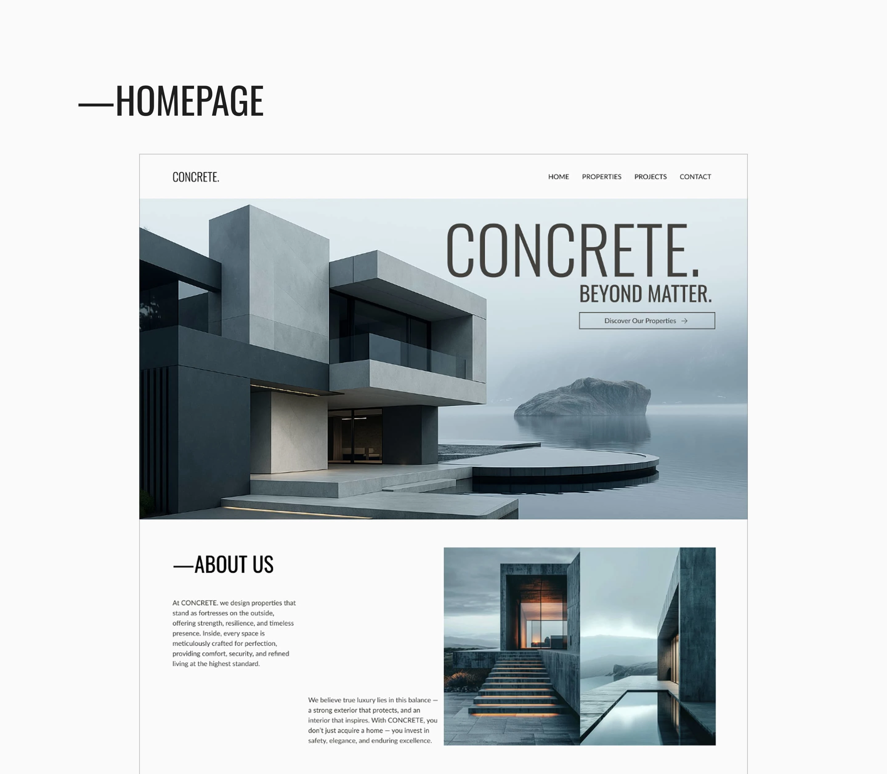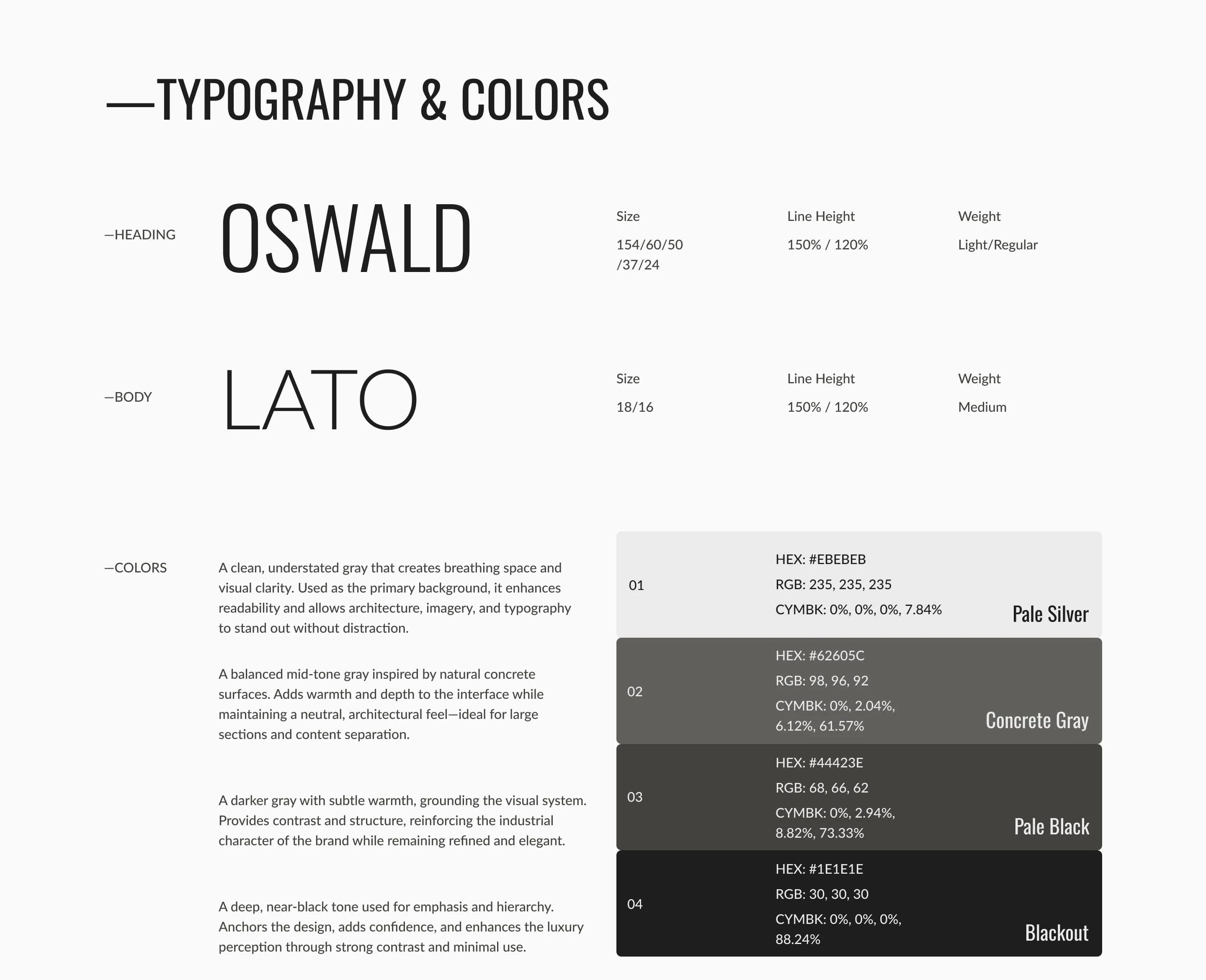 The typography and color system were designed to reinforce the project's architectural and industrial feel. I paired Oswald, a strong and condensed sans-serif, for headings to create a bold, confident statement, with Lato for body text to ensure maximum readability and a contemporary tone. The color palette follows a monochromatic, neutral approach—featuring 'Pale Silver' for breathing space and 'Concrete Gray' for structural depth. This understated selection allows the imagery and architectural details to remain the focal point, while providing a clean, sophisticated backdrop that feels both grounded and high-end.
