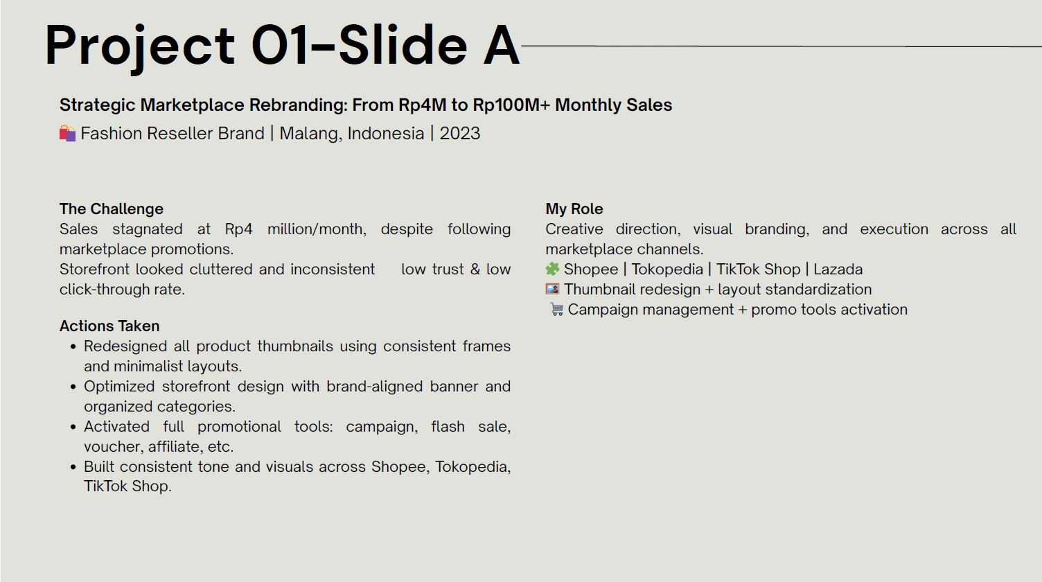 Rebranded marketplace presence, boosting sales from Rp4M to Rp100M+.