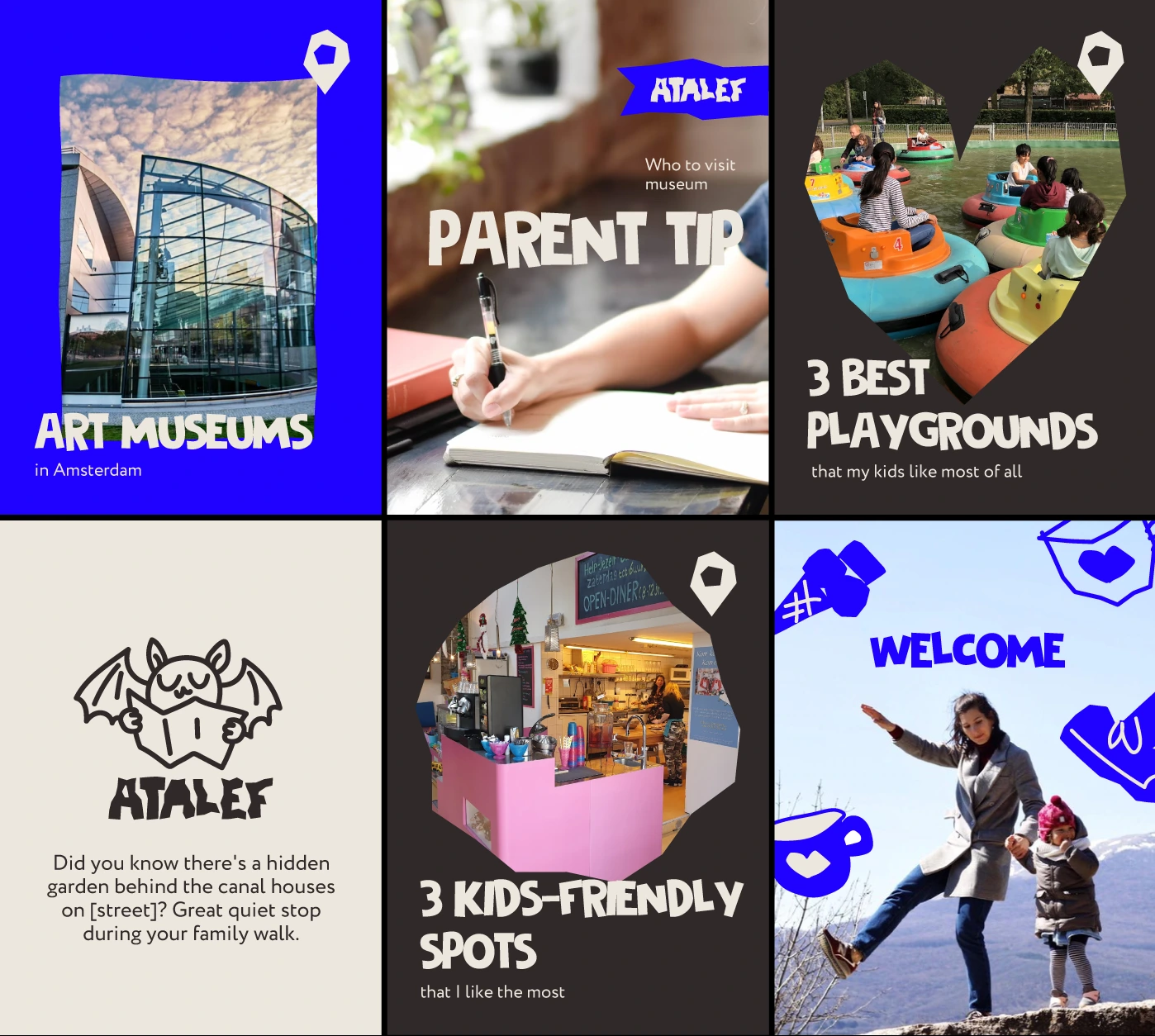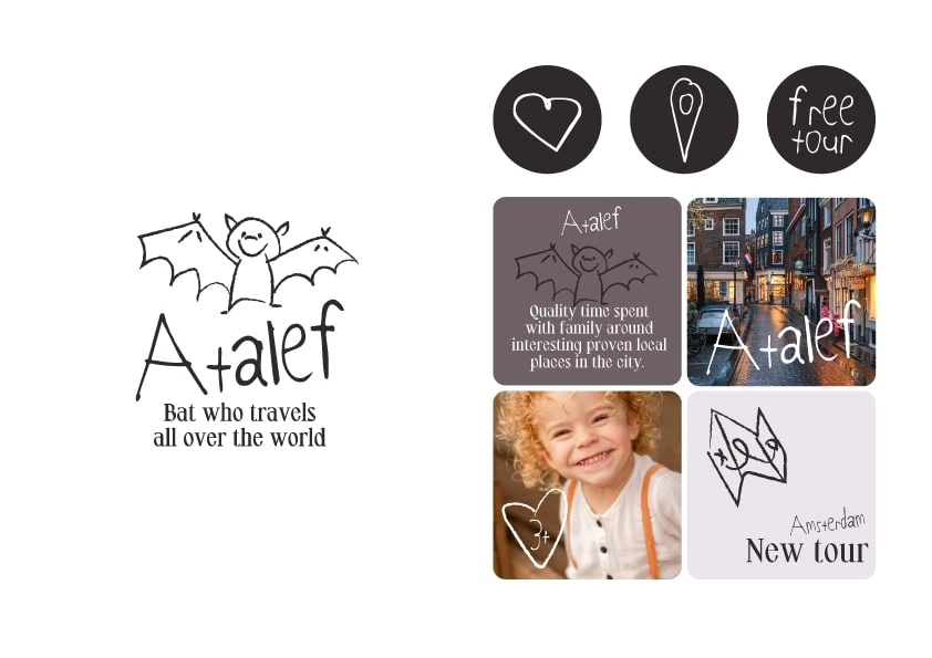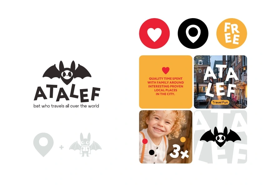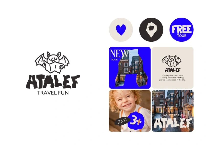 1/ Paper Cutout. The logo is based on contrast: a bold, blocky typeface that looks like it was cut out of paper by a child, paired with a naively drawn, cheerful character. This combination delivers a simple, clear message: we offer fun, meaningful routes and know how to make great memories with kids.