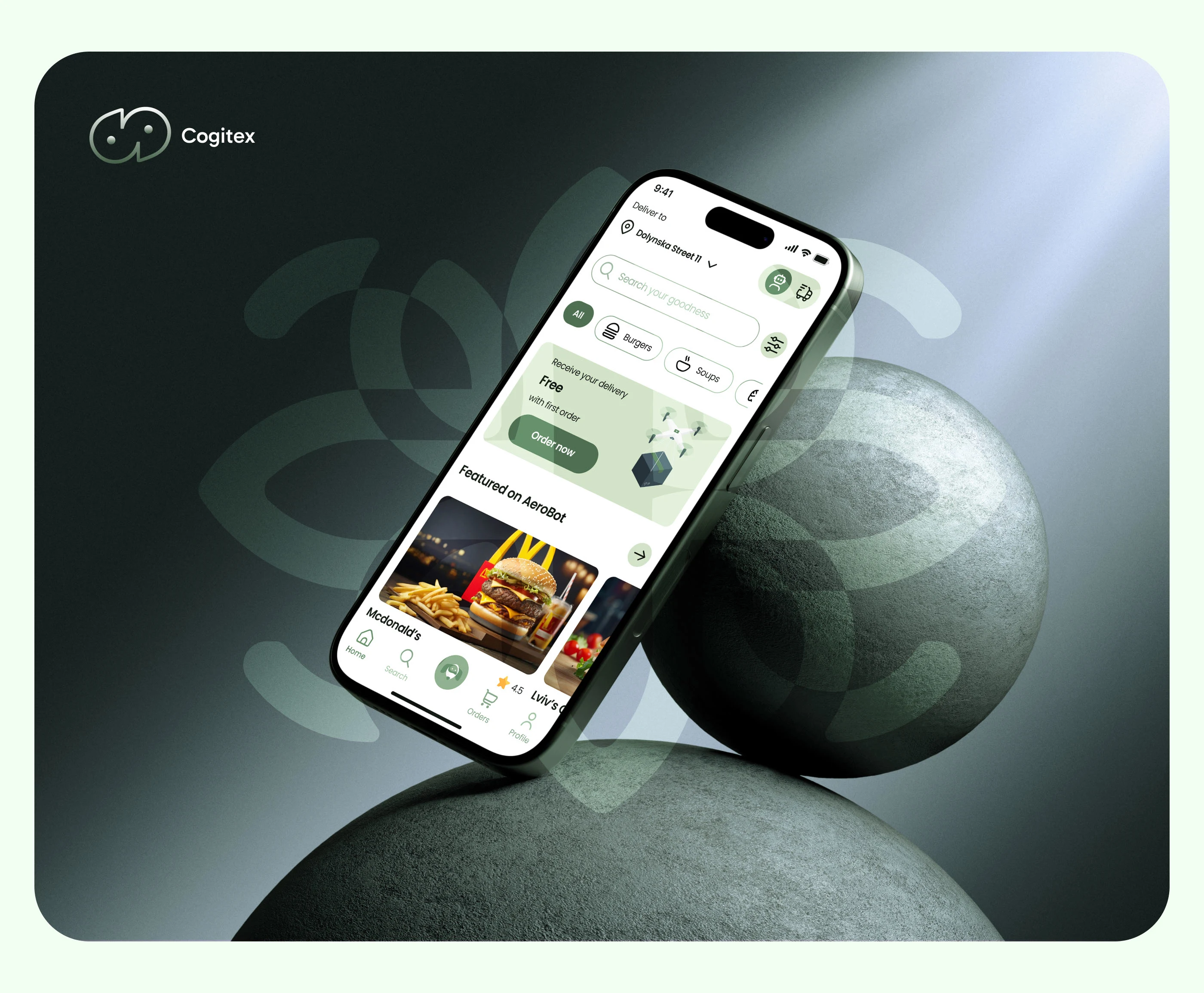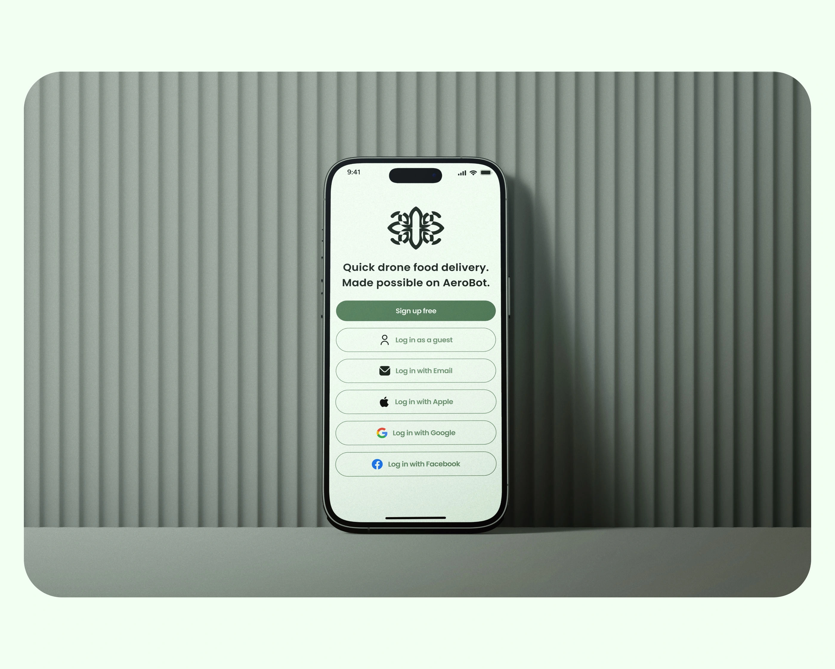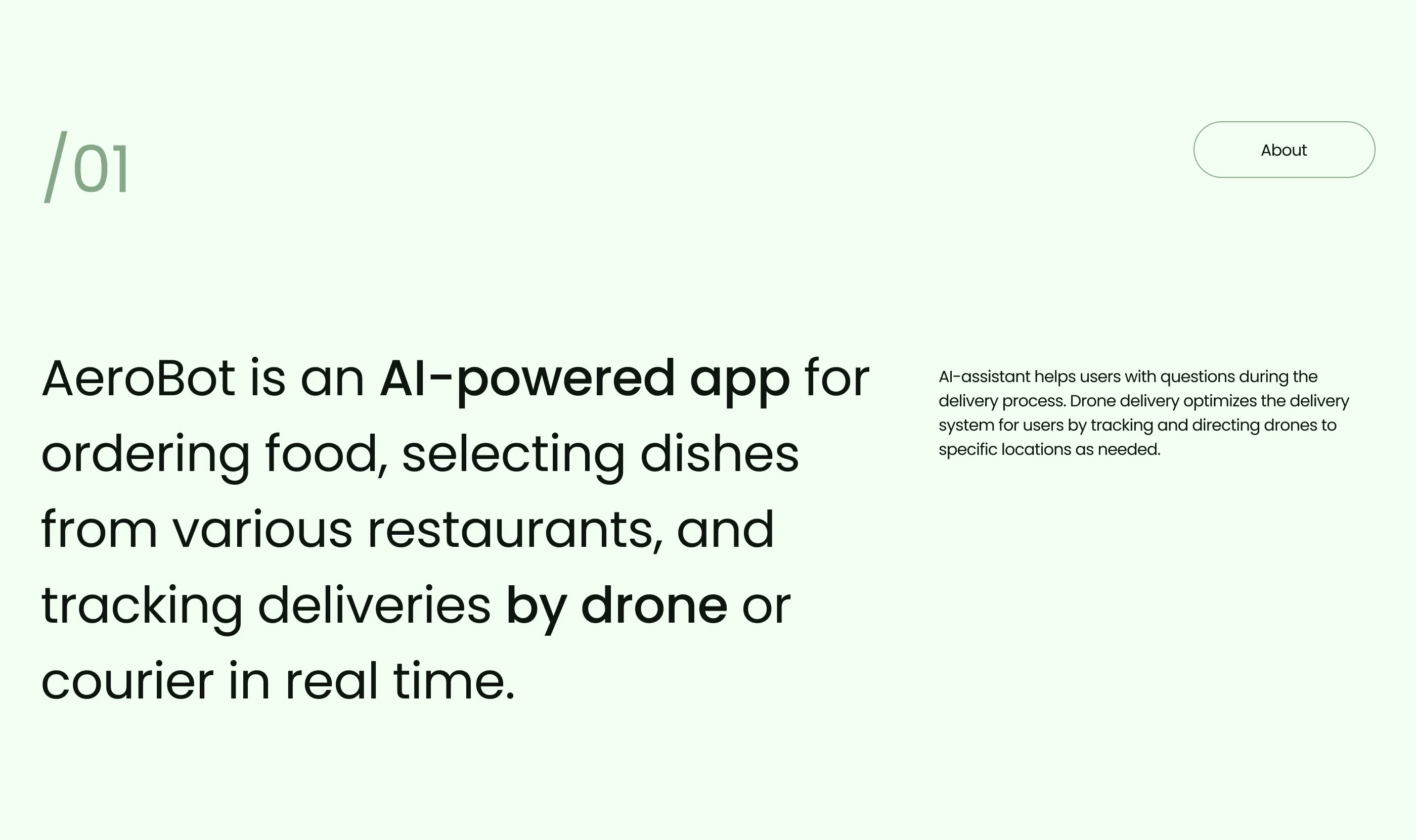 AeroBot is an AI-powered app for ordering food, selecting dishes from various restaurants, and tracking deliveries by drone or courier in real-time.