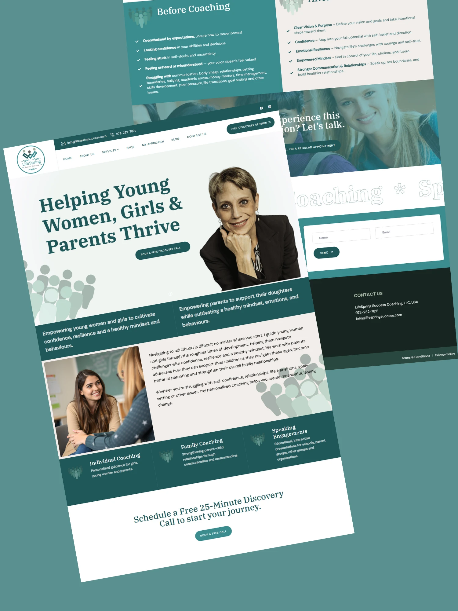 For this project, I designed a modern, professional brand identity and built a fully customized WordPress website for LifeSpring Success Coaching. The project included: