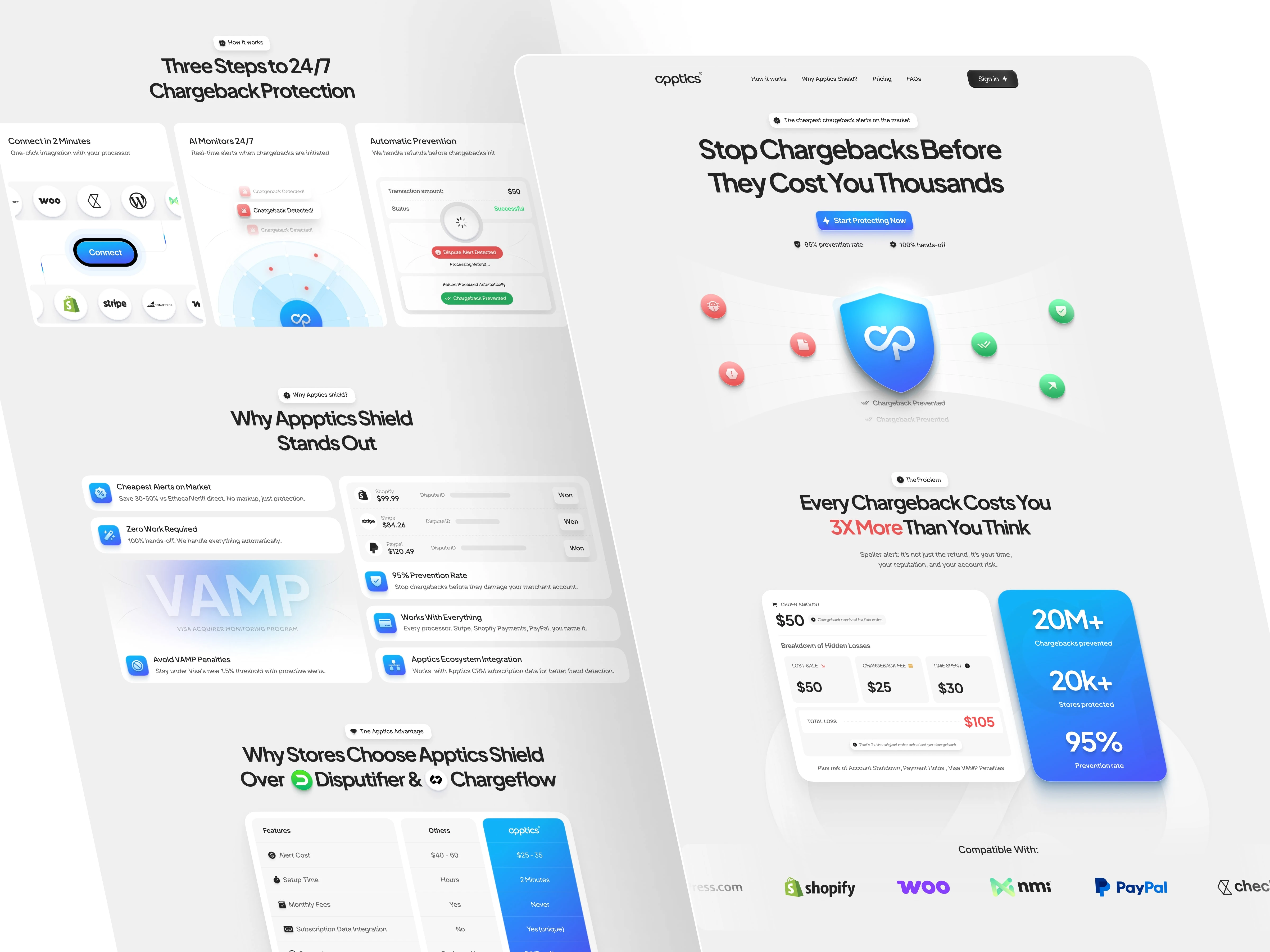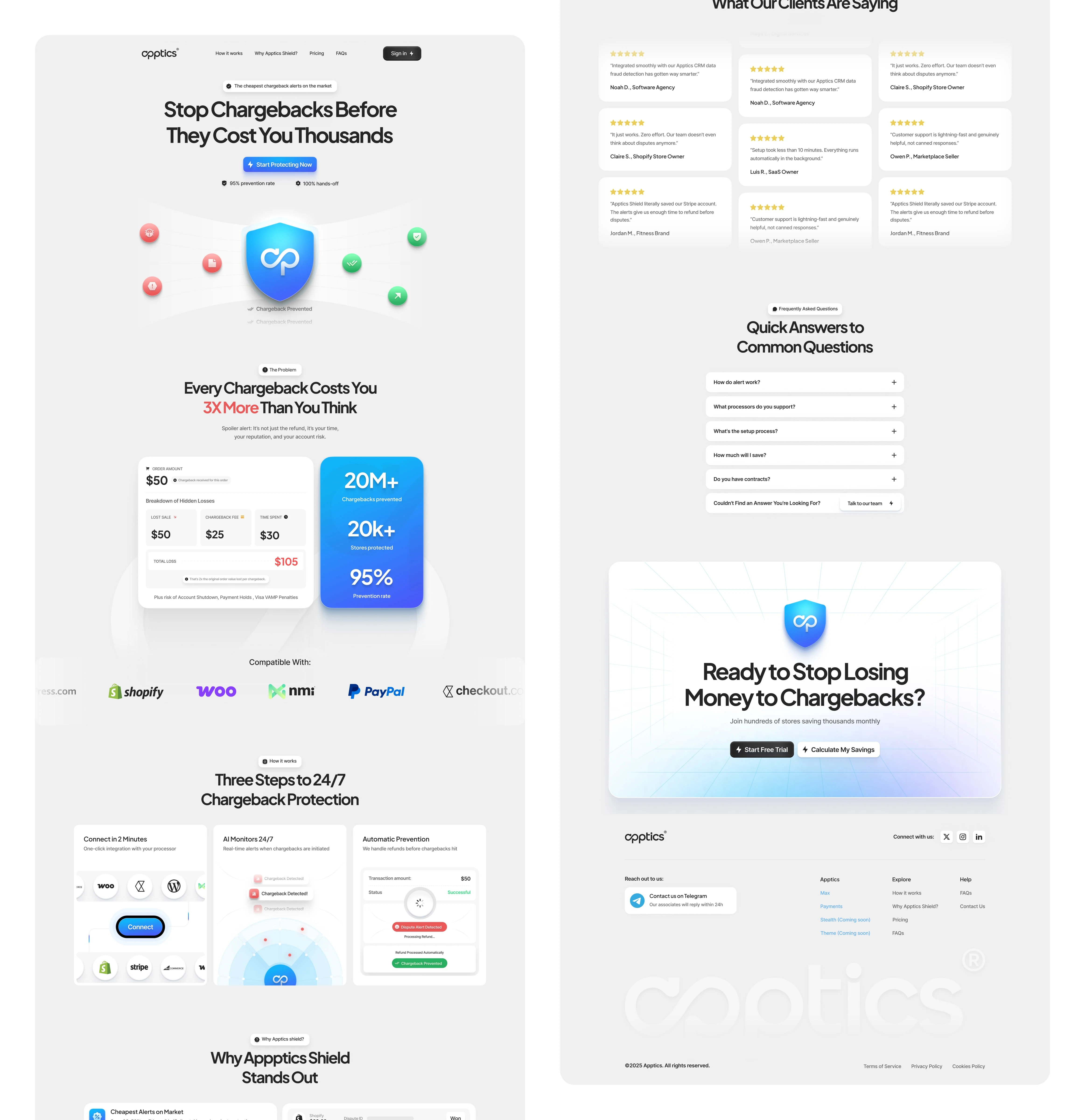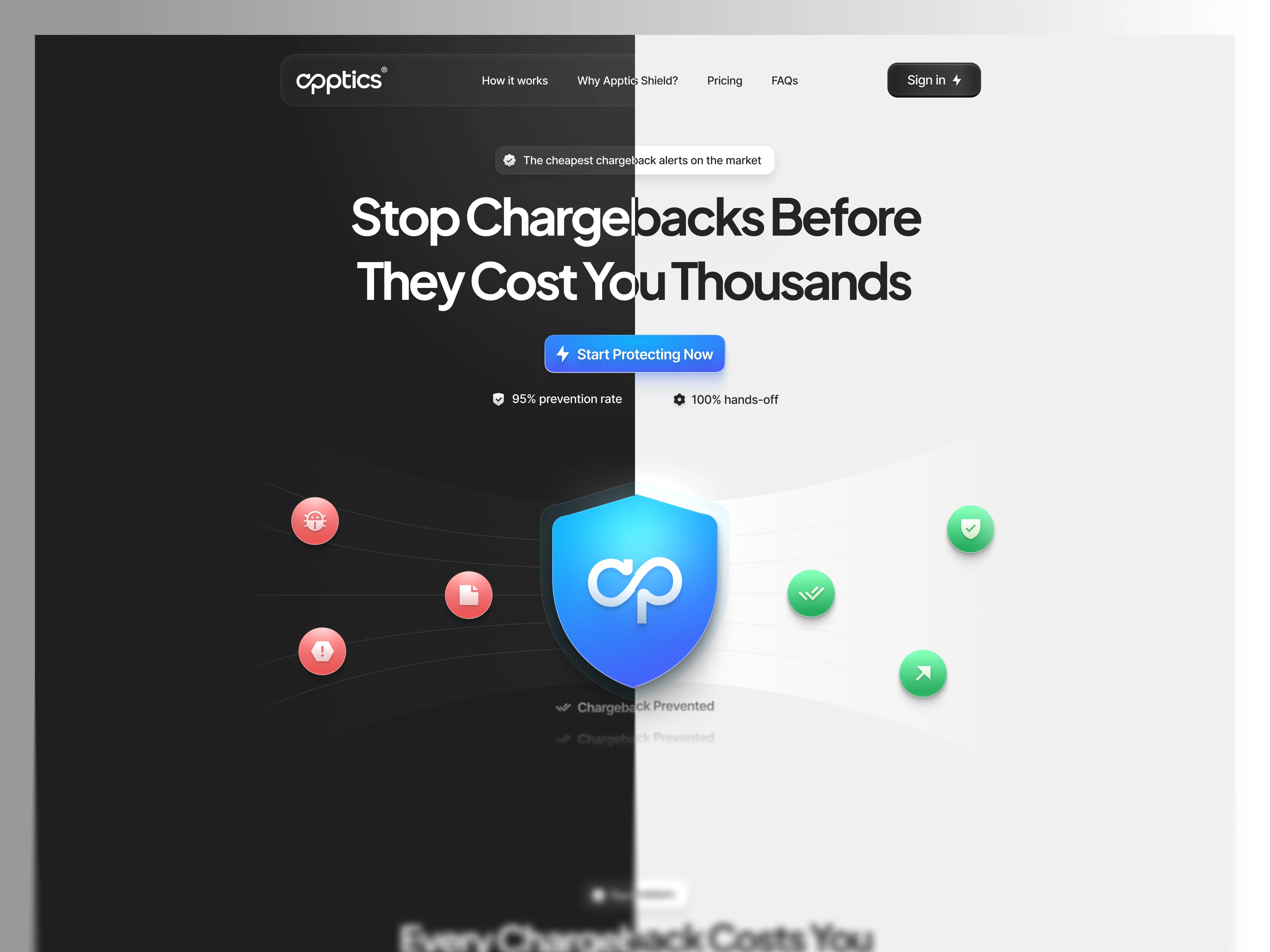 Apptics Shield is a chargeback prevention solution offering the cheapest chargeback alerts on the market with a 95% prevention rate and a fully hands-off experience. This project explores how landing page design can communicate urgency, trust, and value in seconds.