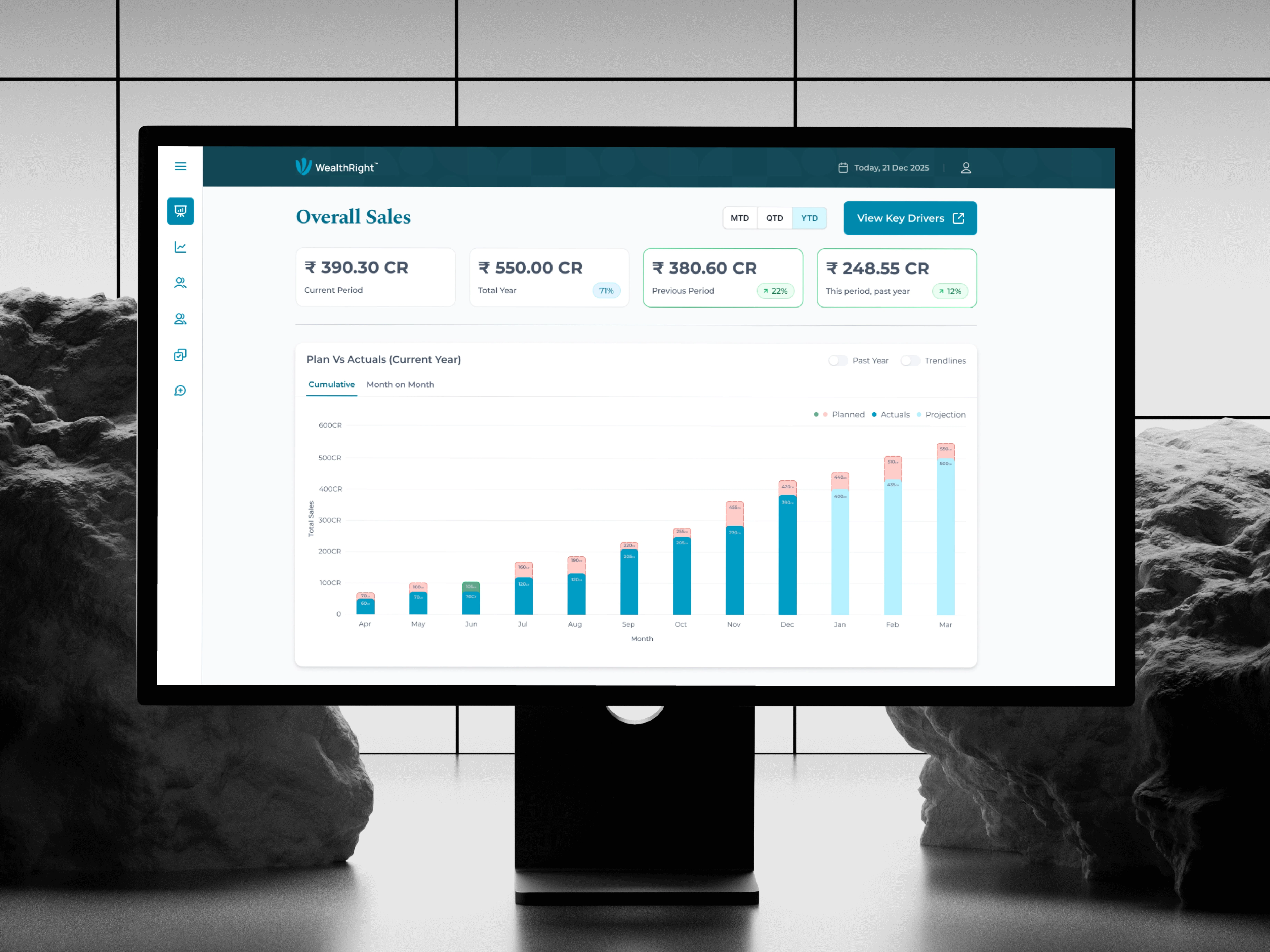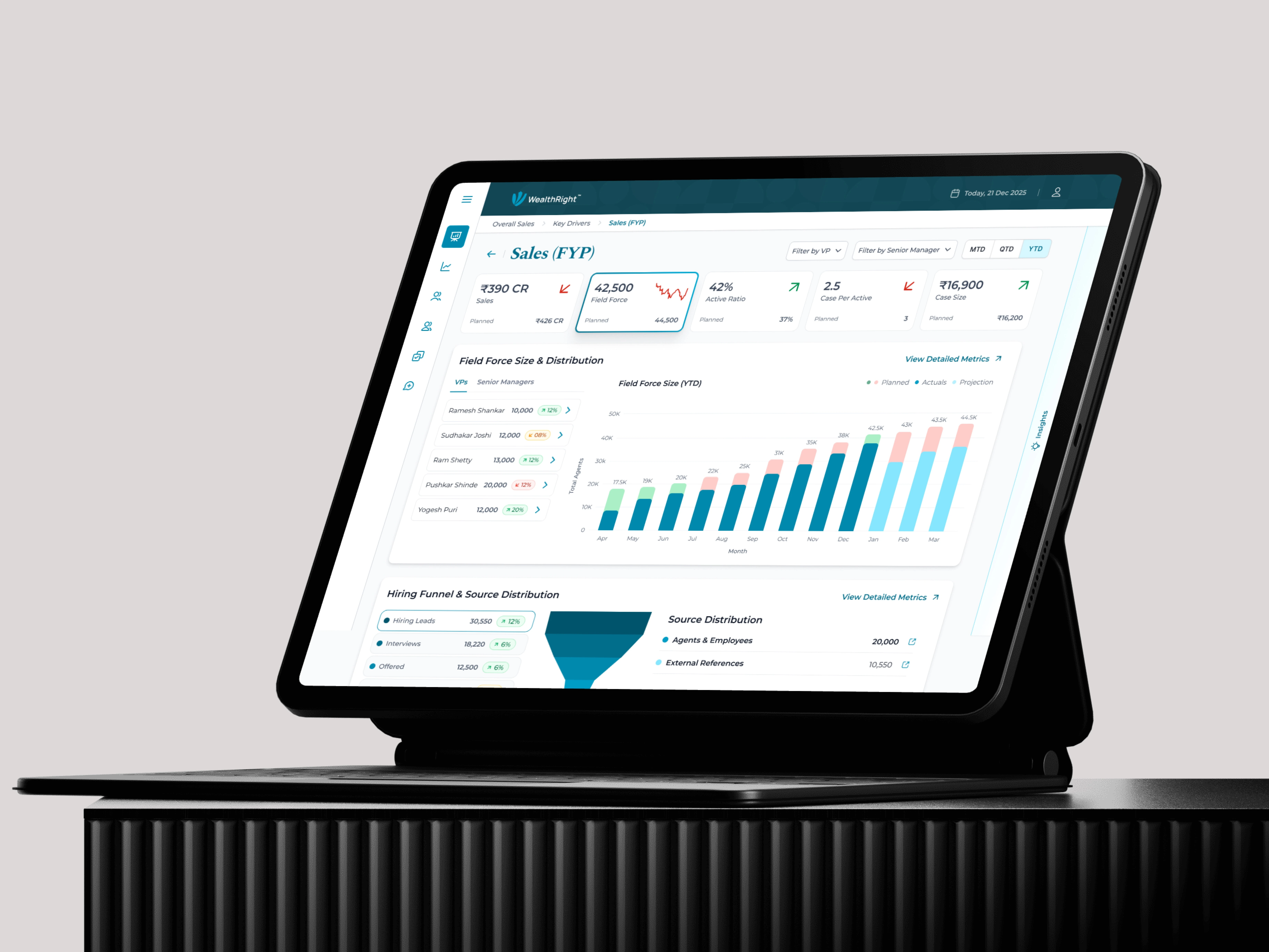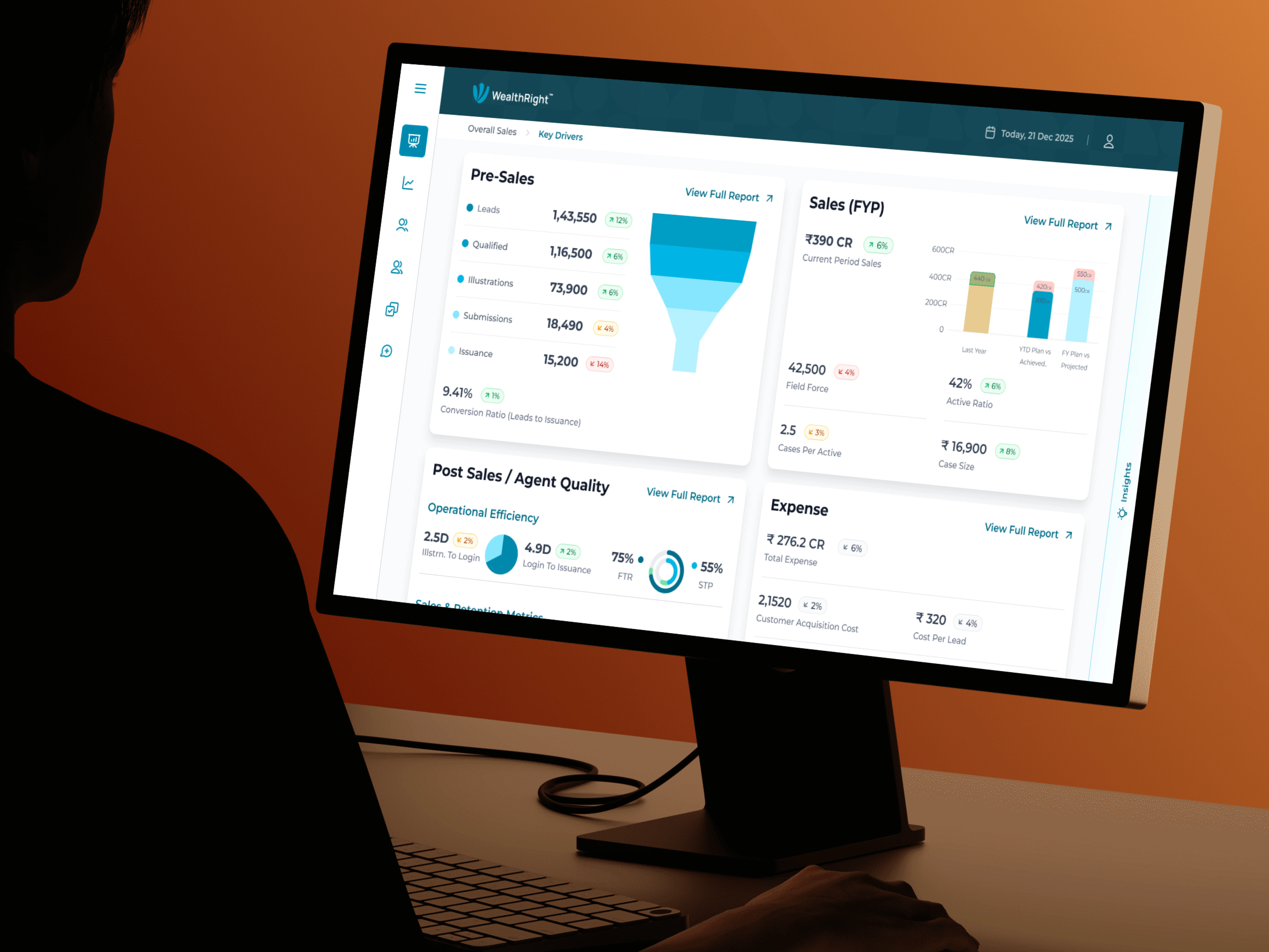 We designed the UX with incredible depth a CXO can look at high-level Zonal Manager numbers, and with just a few clicks, drill all the way down to the Branch Manager, the Agent Manager, and finally to the performance of a single Agent on the ground.