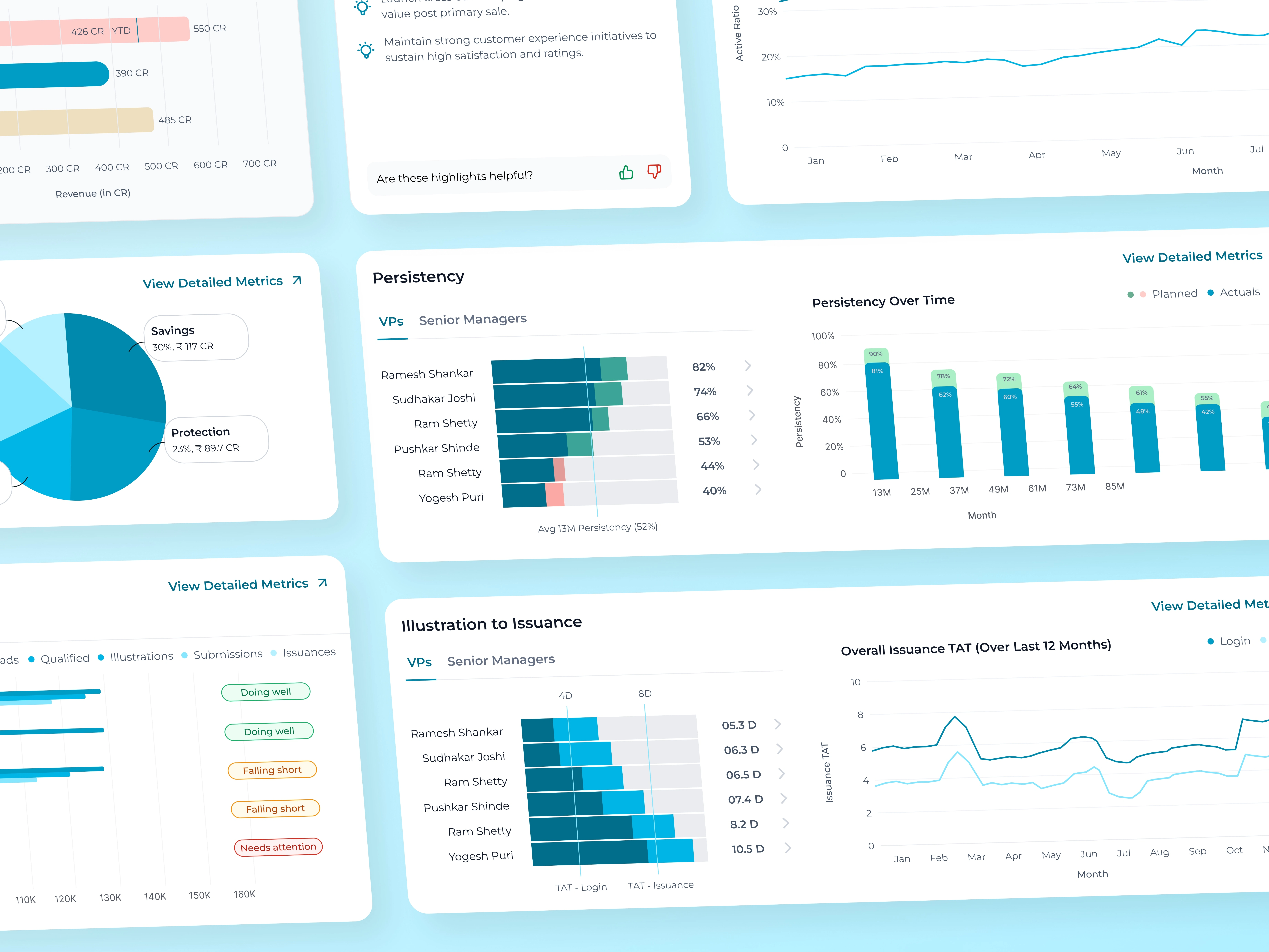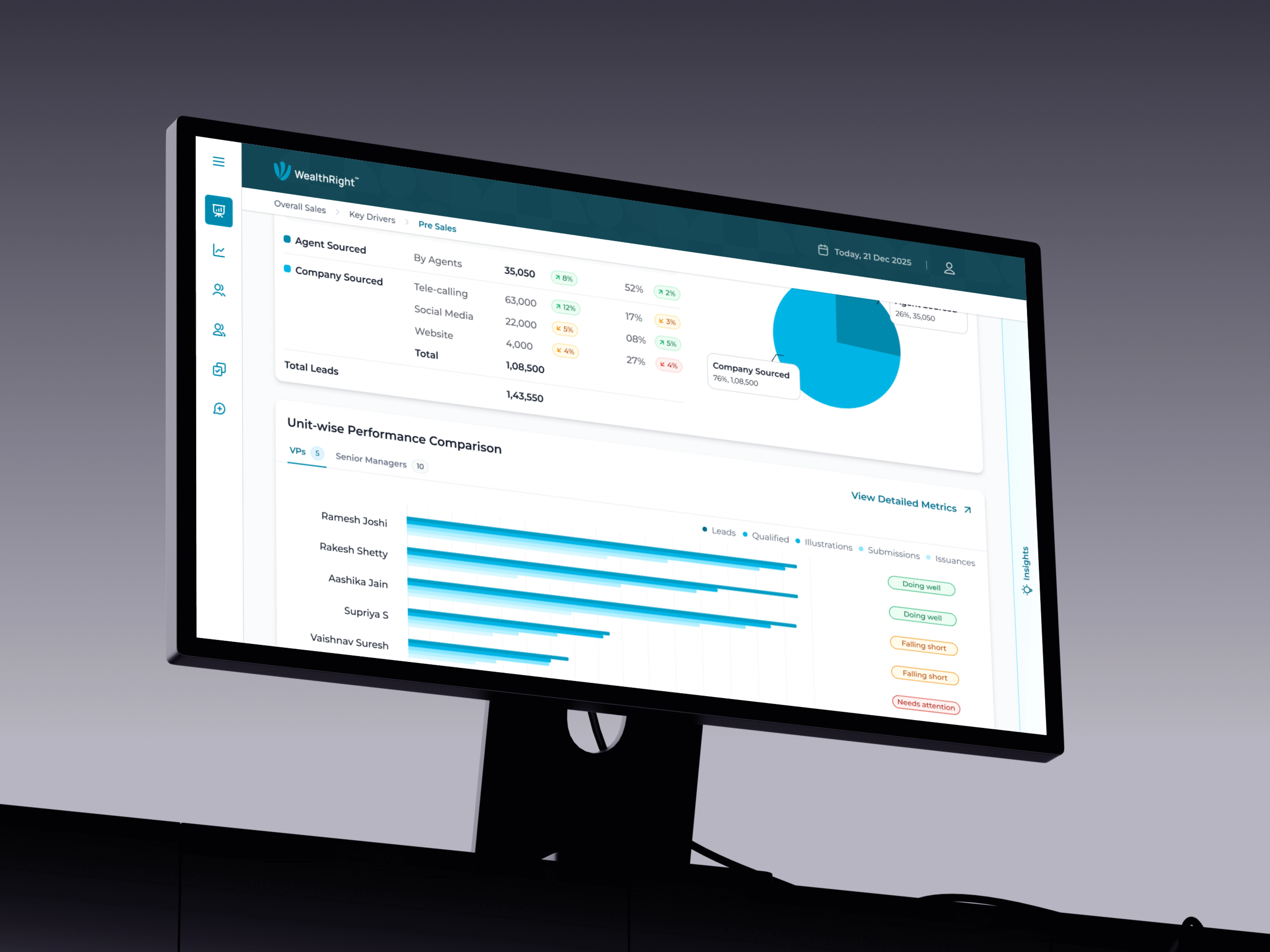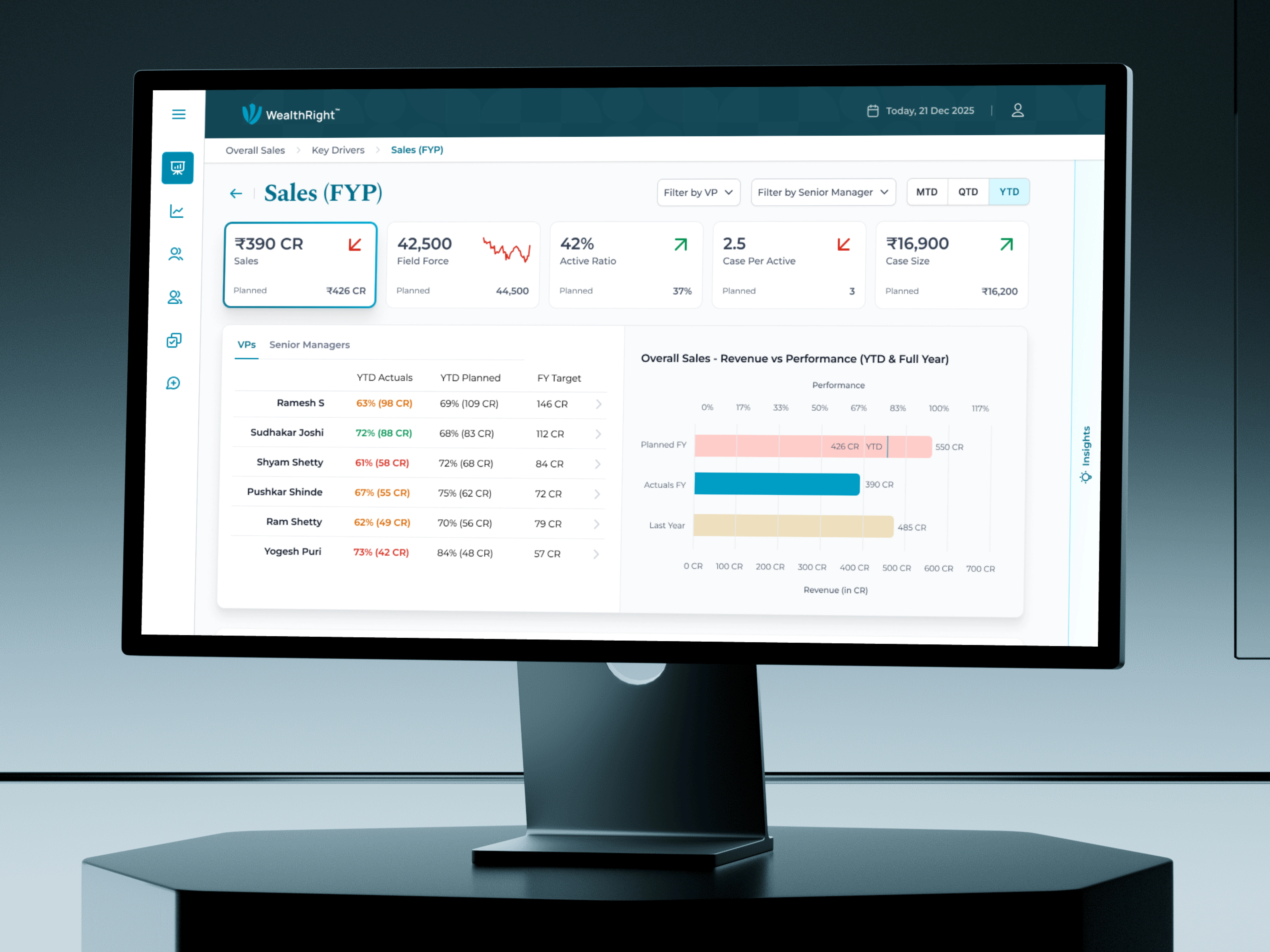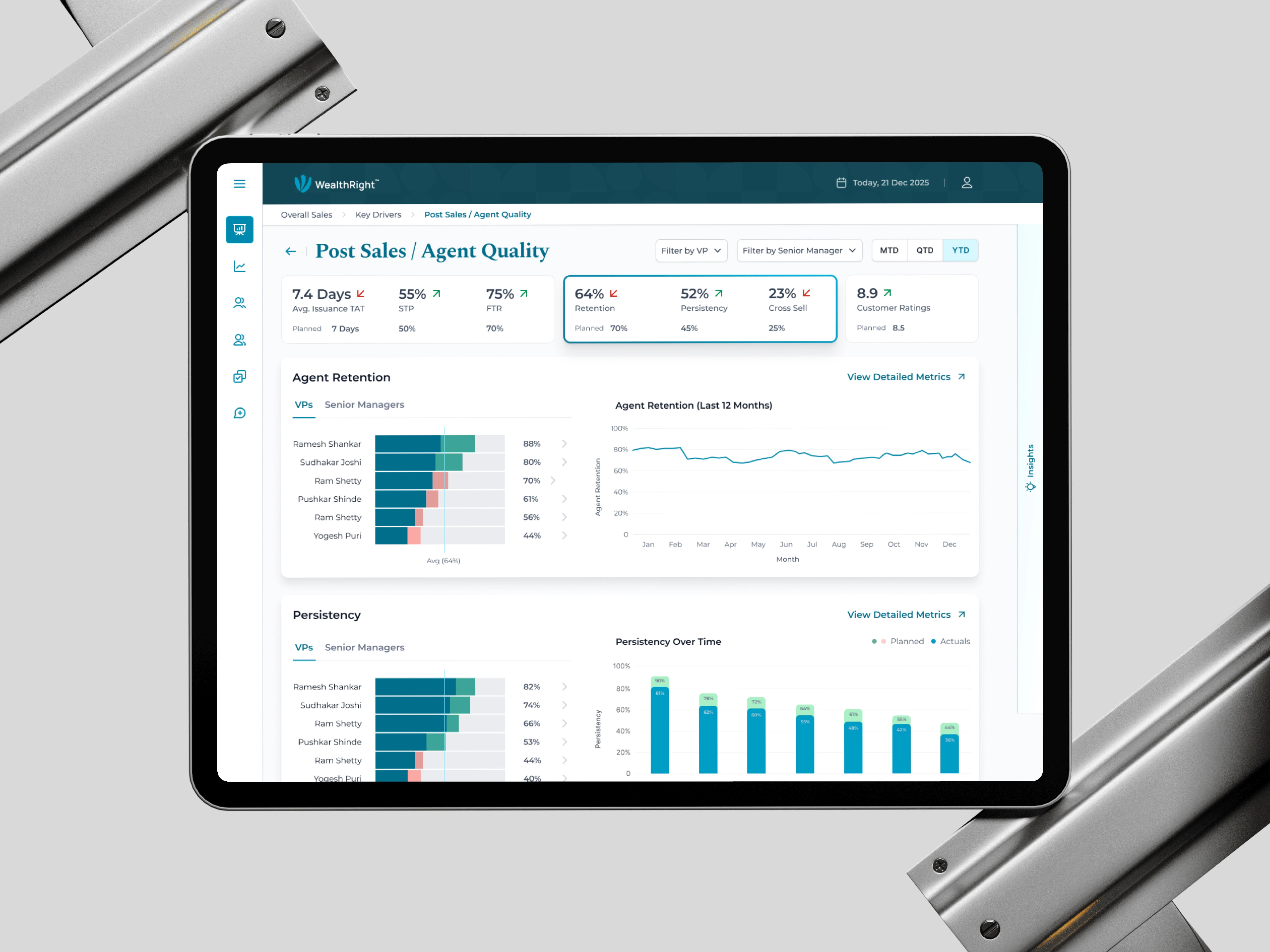 We designed the UX with incredible depth a CXO can look at high-level Zonal Manager numbers, and with just a few clicks, drill all the way down to the Branch Manager, the Agent Manager, and finally to the performance of a single Agent on the ground.