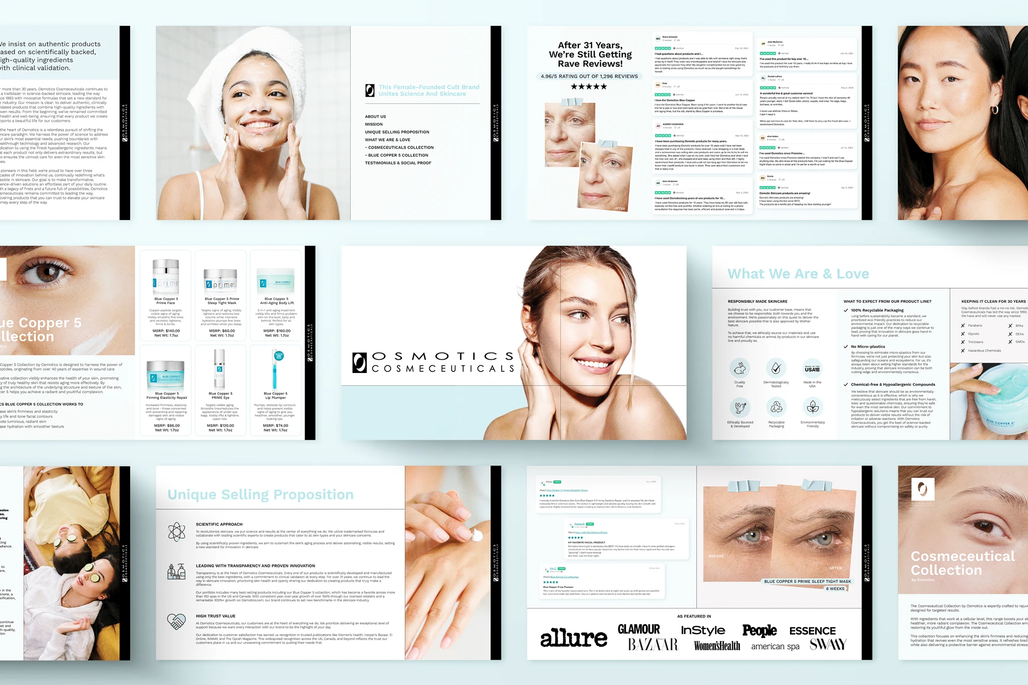 Brand strategy + deck design for Osmotics Cosmeceuticals, blending science and beauty into a sharp, elevated, investor-ready brand story.