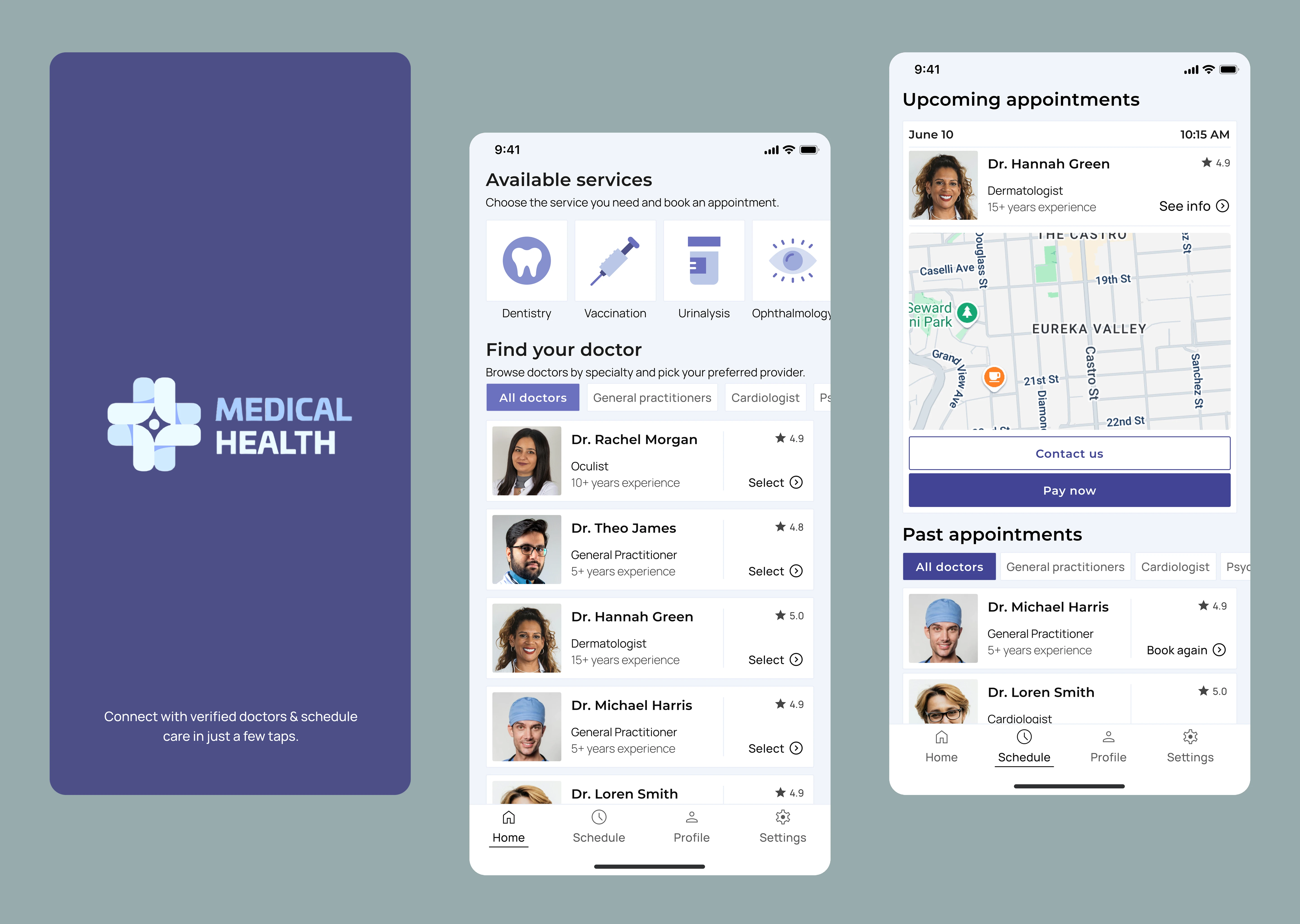 Designed a modern and user-friendly mobile interface for a health app focused on doctor discovery, appointment booking, and medication tracking.