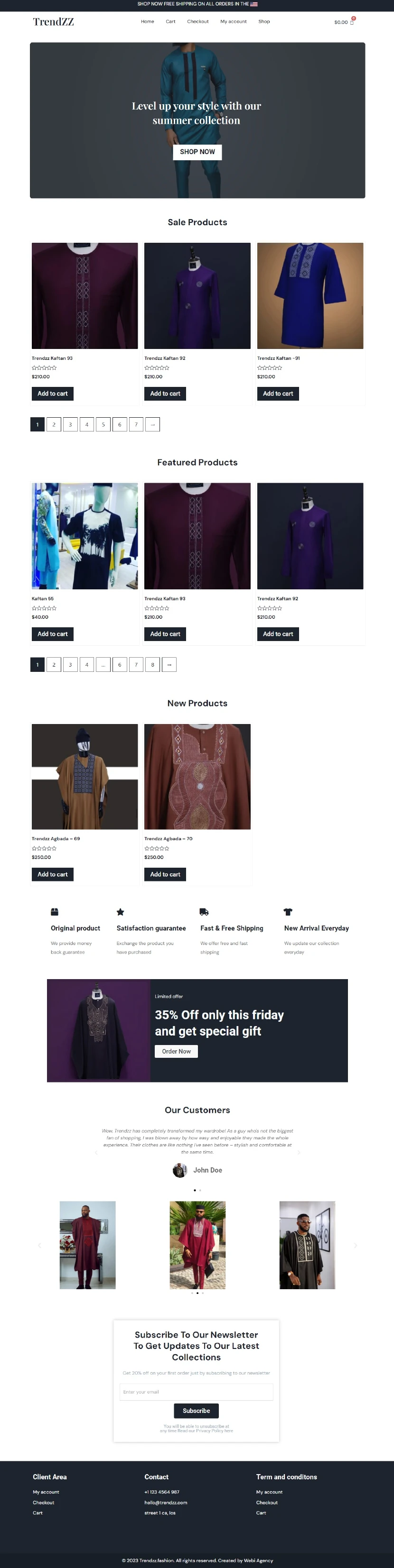 Solution: We developed a user-friendly website for Trendzz Shop that emphasizes their latest kaftan collection. The site features easy navigation, clear product listings, and strong calls to action, such as fast and free shipping, money-back guarantees, and daily new arrivals, ensuring a satisfying shopping experience for their customers.