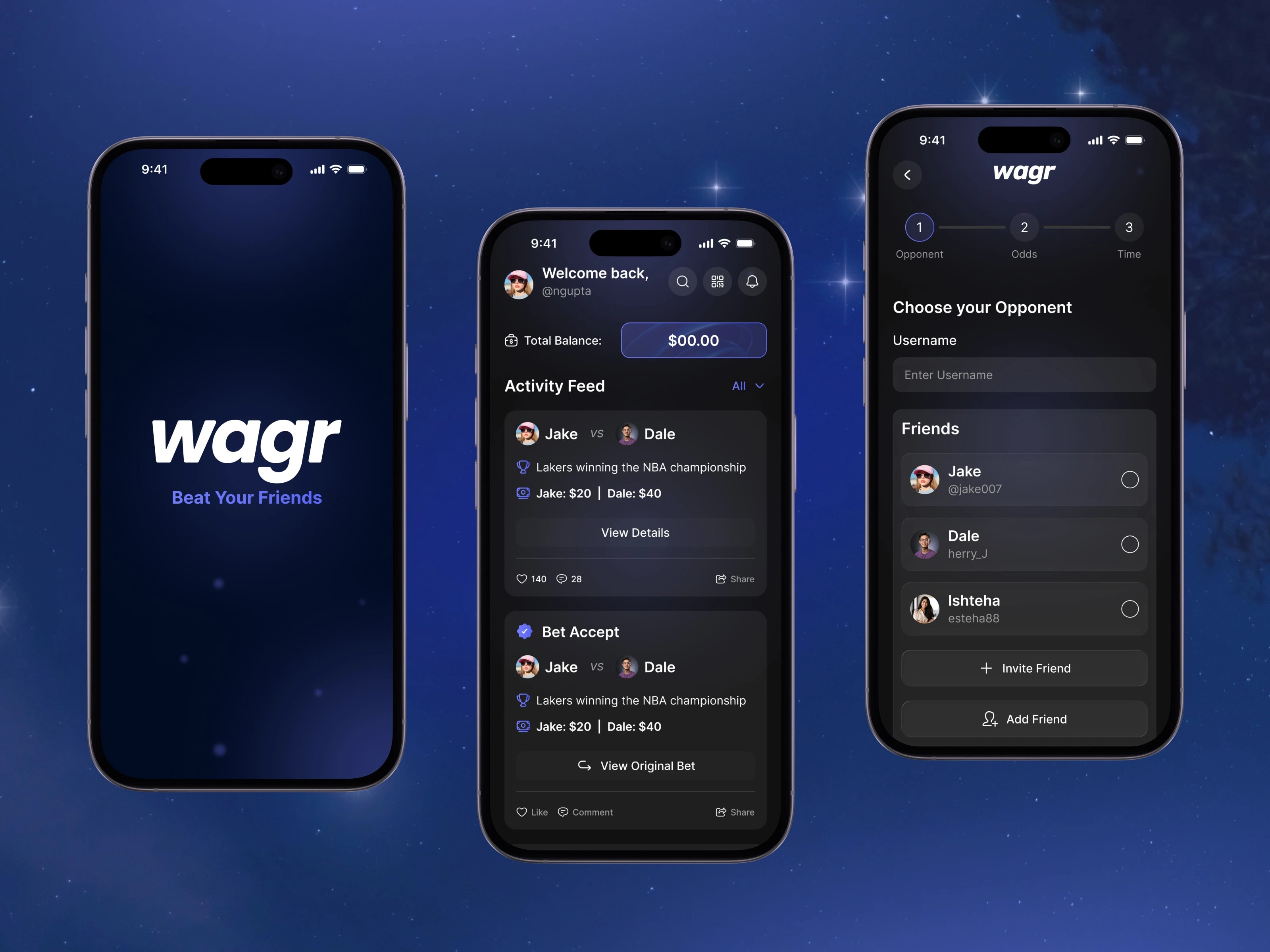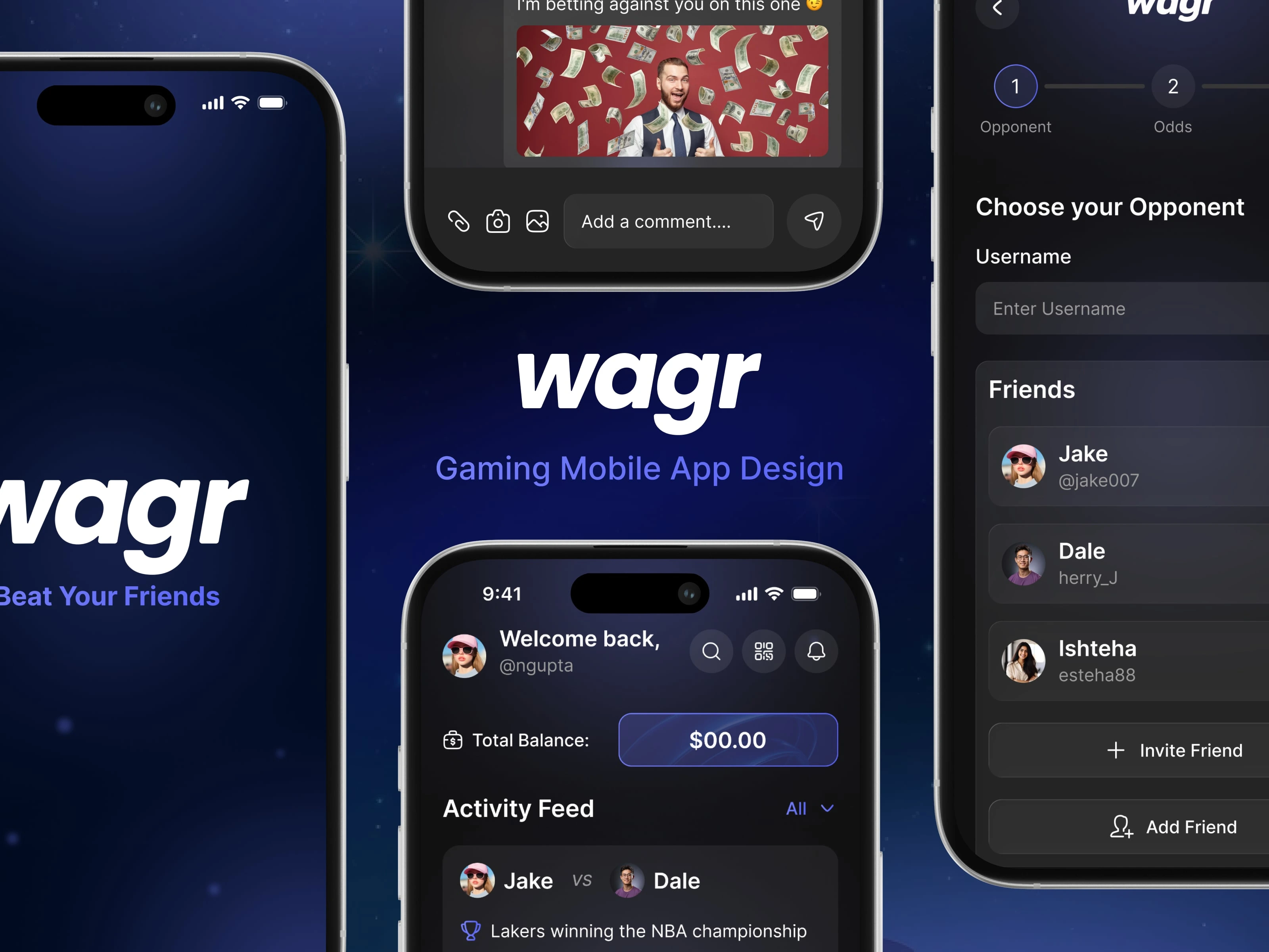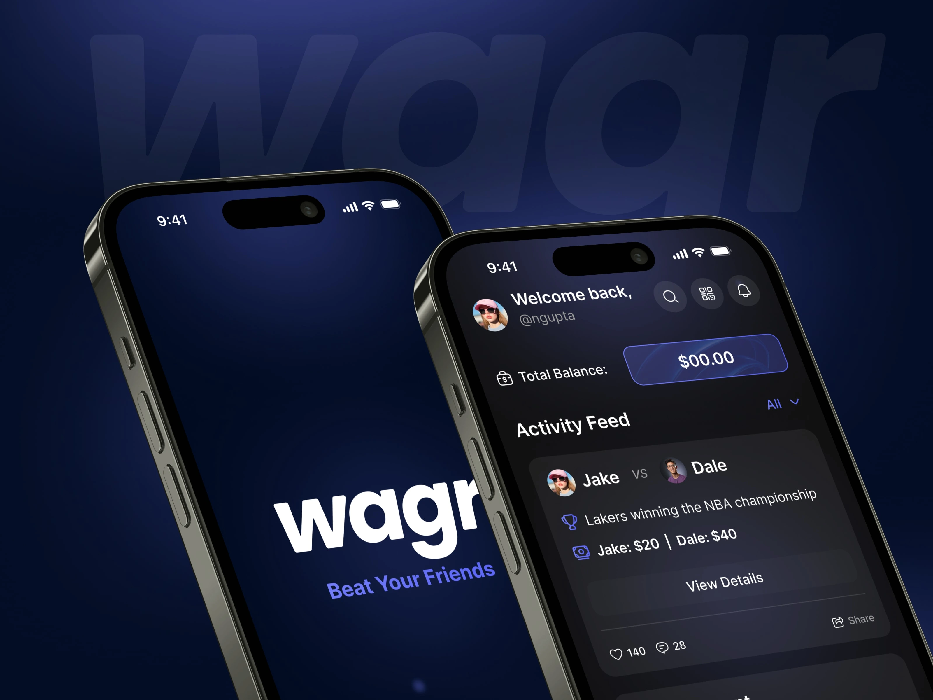 Wagr is a social sports betting experience that lets friends challenge each other on games, share outcomes, and track balances in a sleek dark mobile interface.