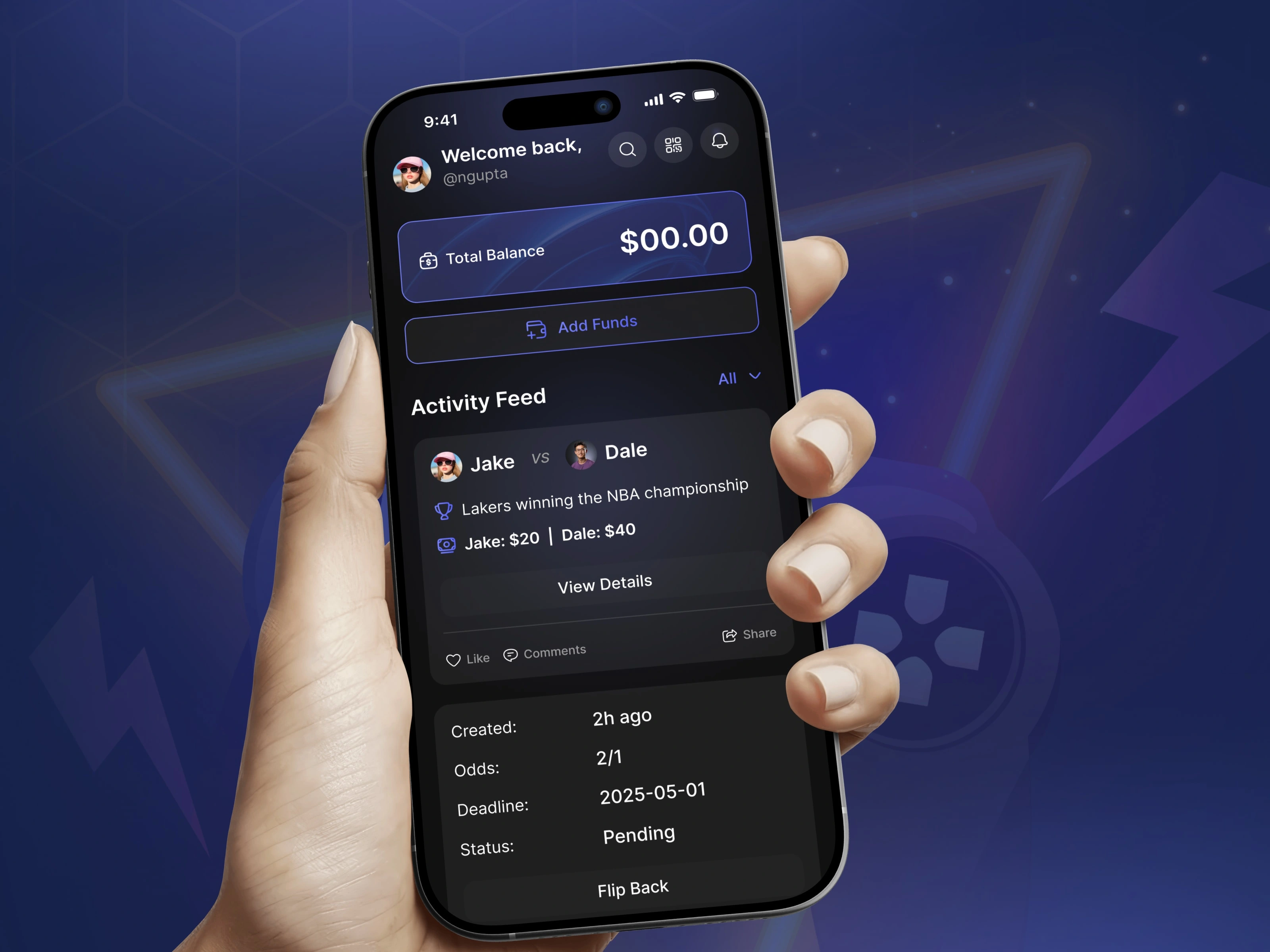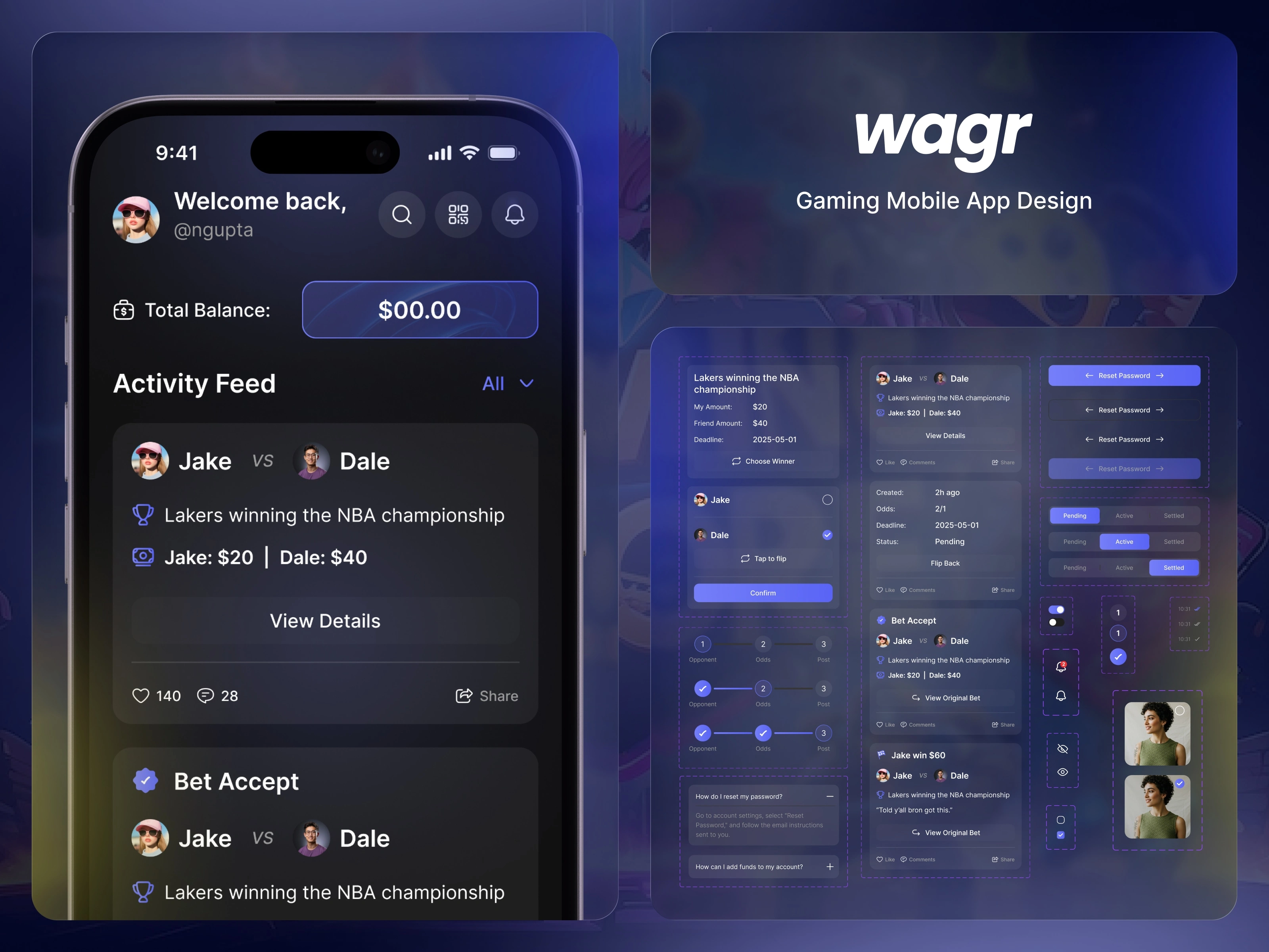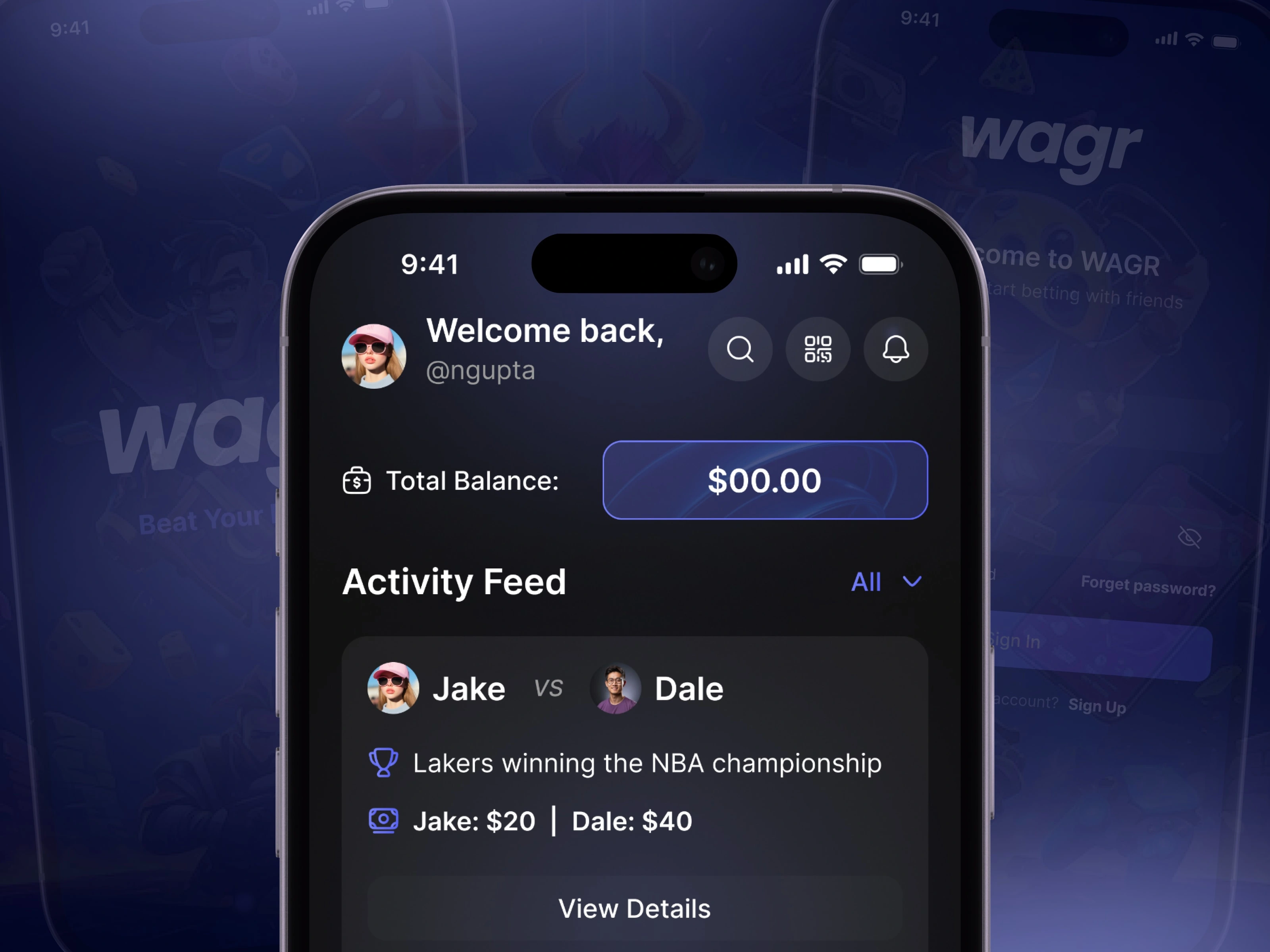 Wagr is a social sports betting experience that lets friends challenge each other on games, share outcomes, and track balances in a sleek dark mobile interface.