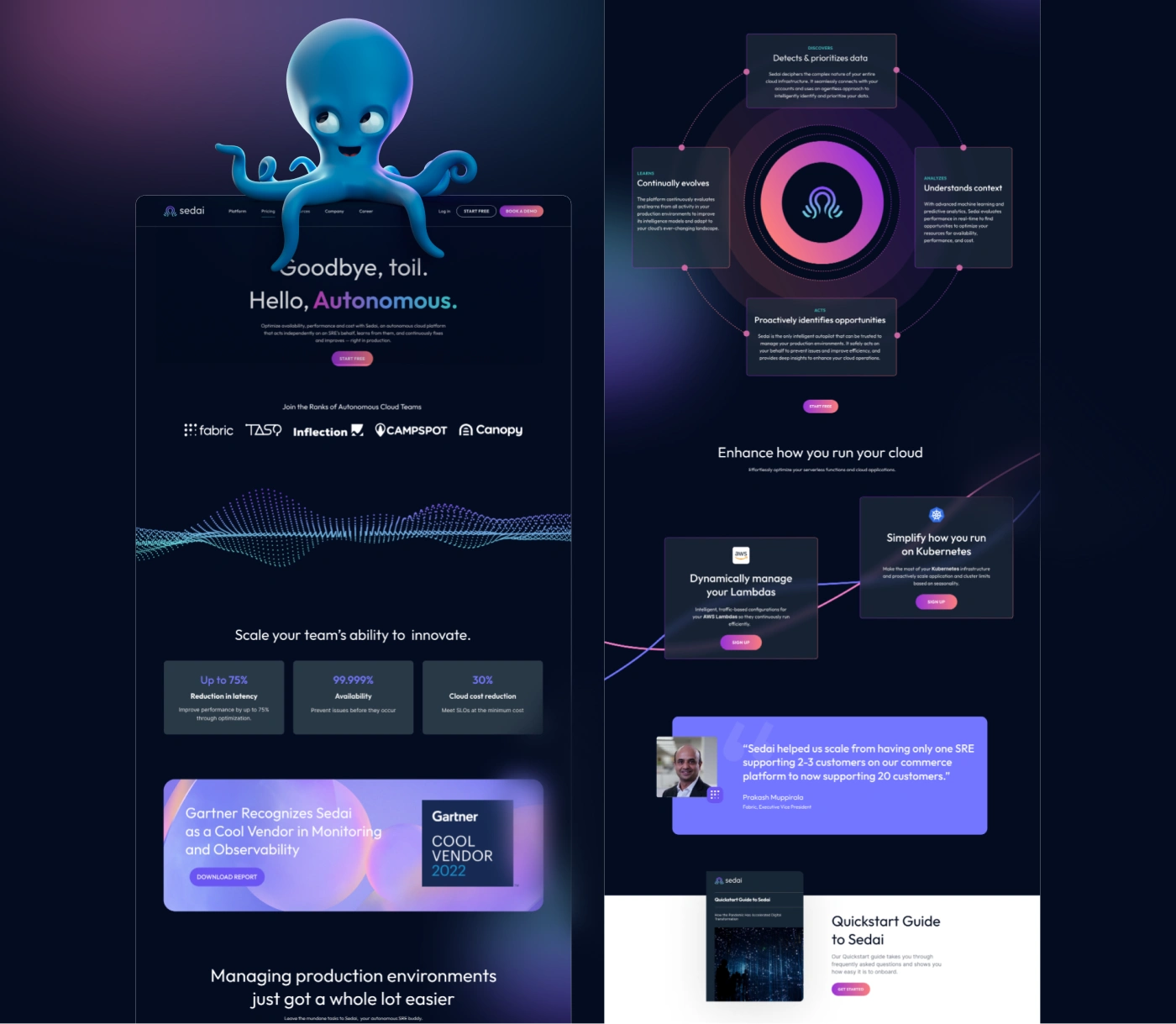 With the brand, a new look and feel was then pushed to the new website design. Sedai is a DevOps SaaS startup.