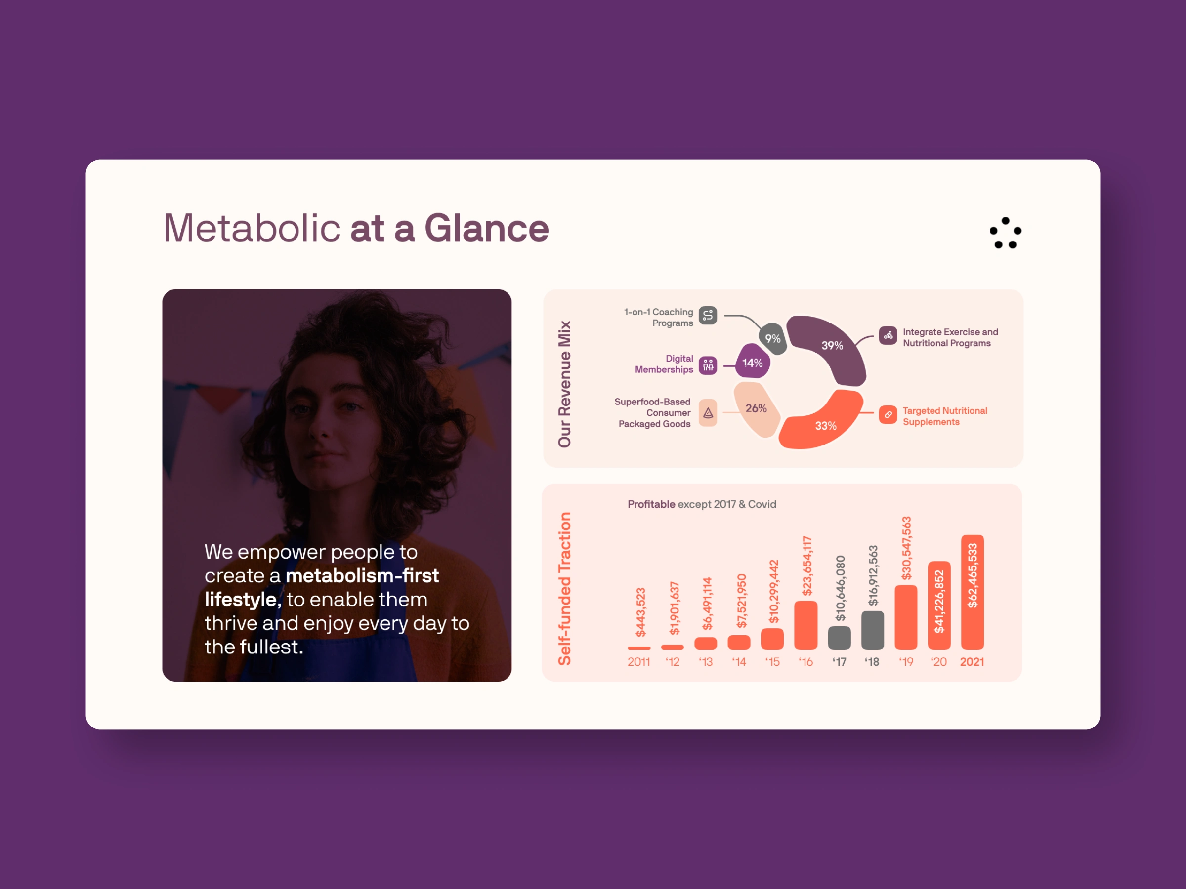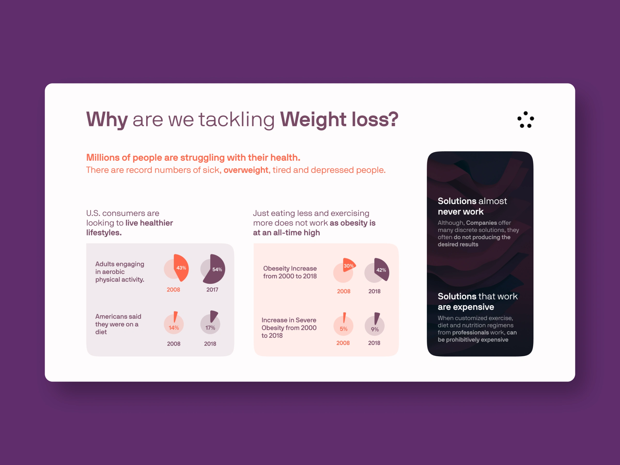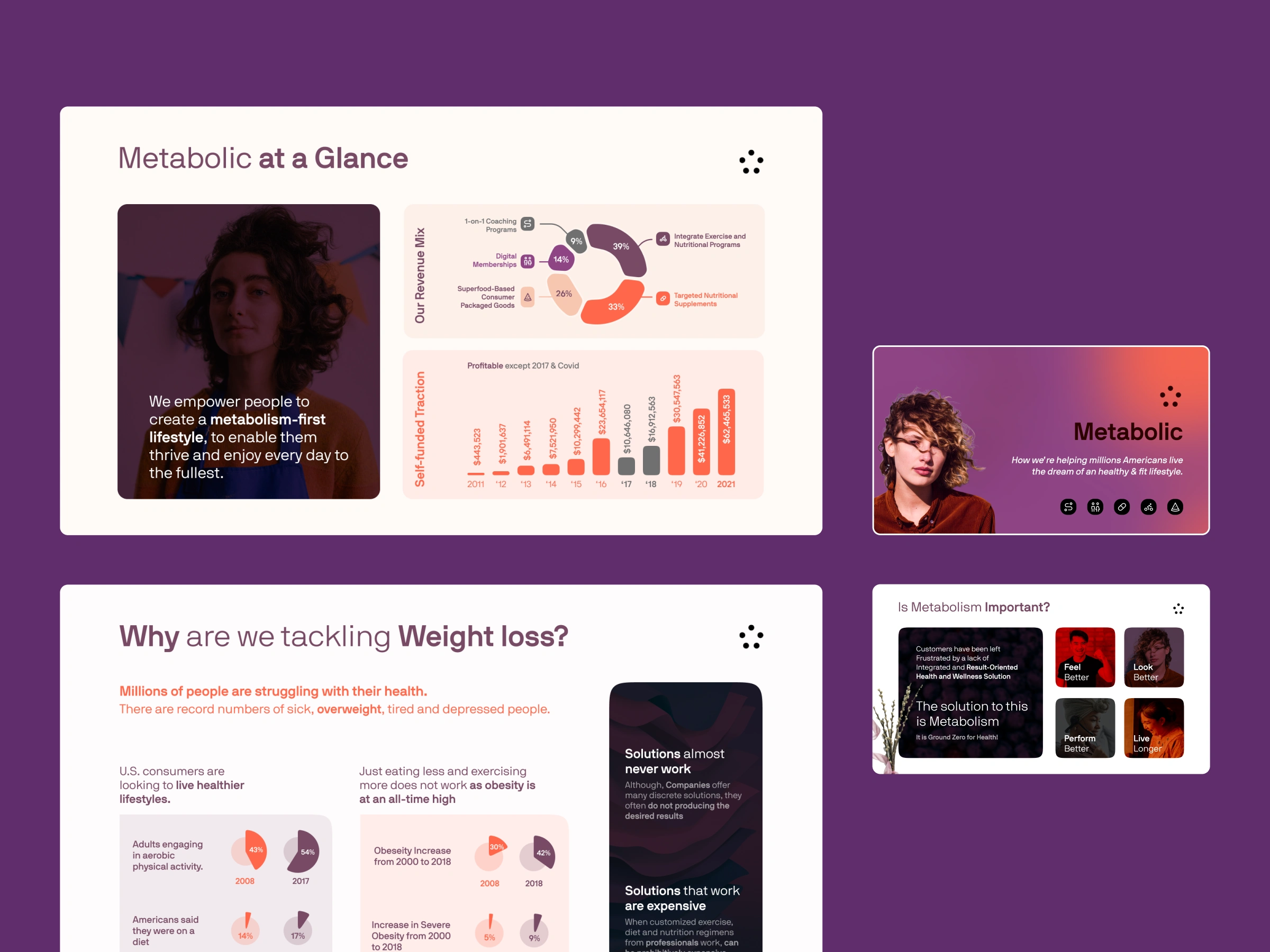 Created data-driven slides displaying their mission, market opportunity, and comprehensive approach to helping Americans achieve healthier lifestyles.