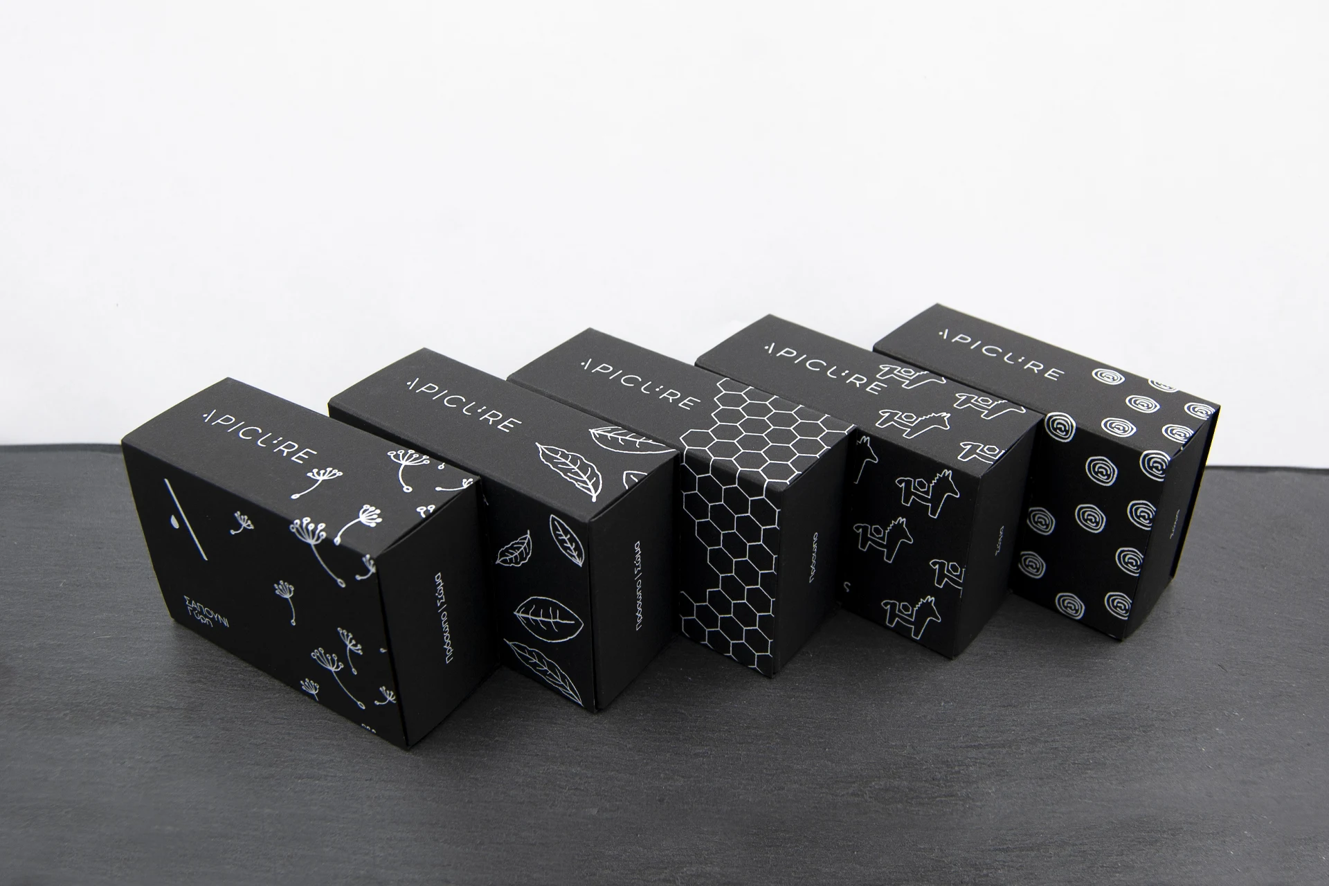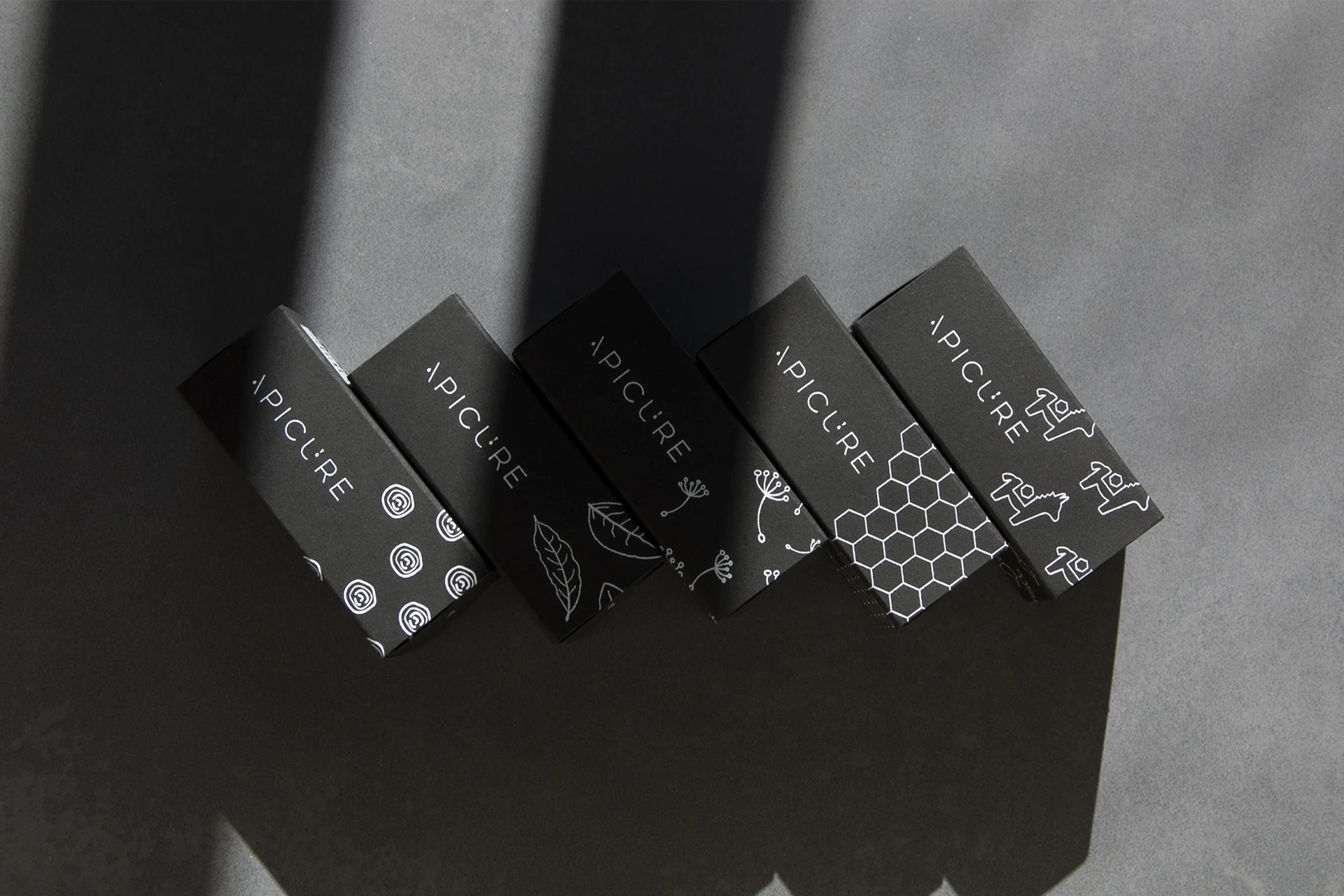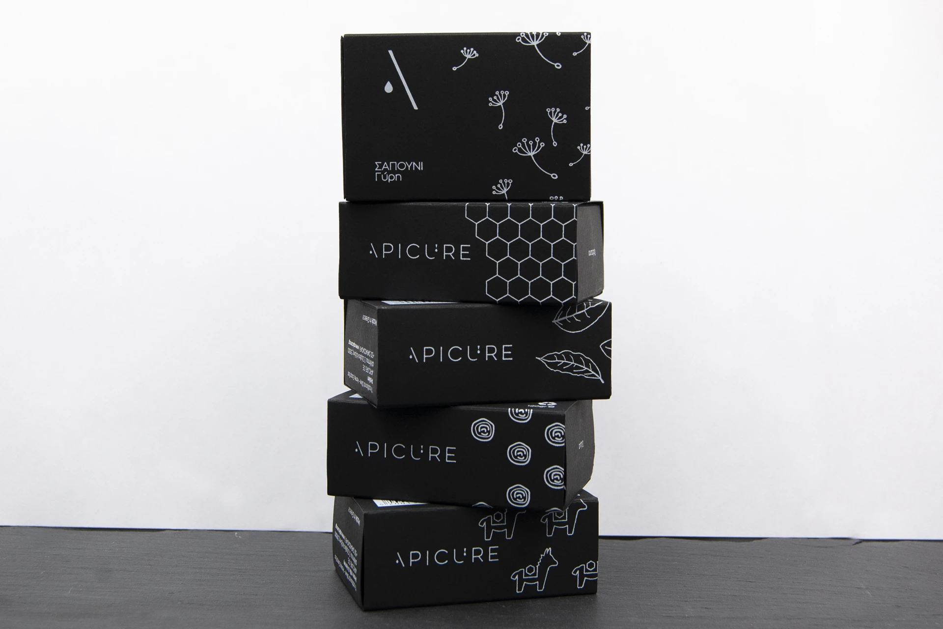 The soap packaging, was among the first ones that was re-designed when we created the company's new identity. The packaging design, represents and affordable luxury line, while it distances itself from the original concept of the company (just honey products), while maintaining at the same time, the connection with the natural products that have always been a part of Apicure.
