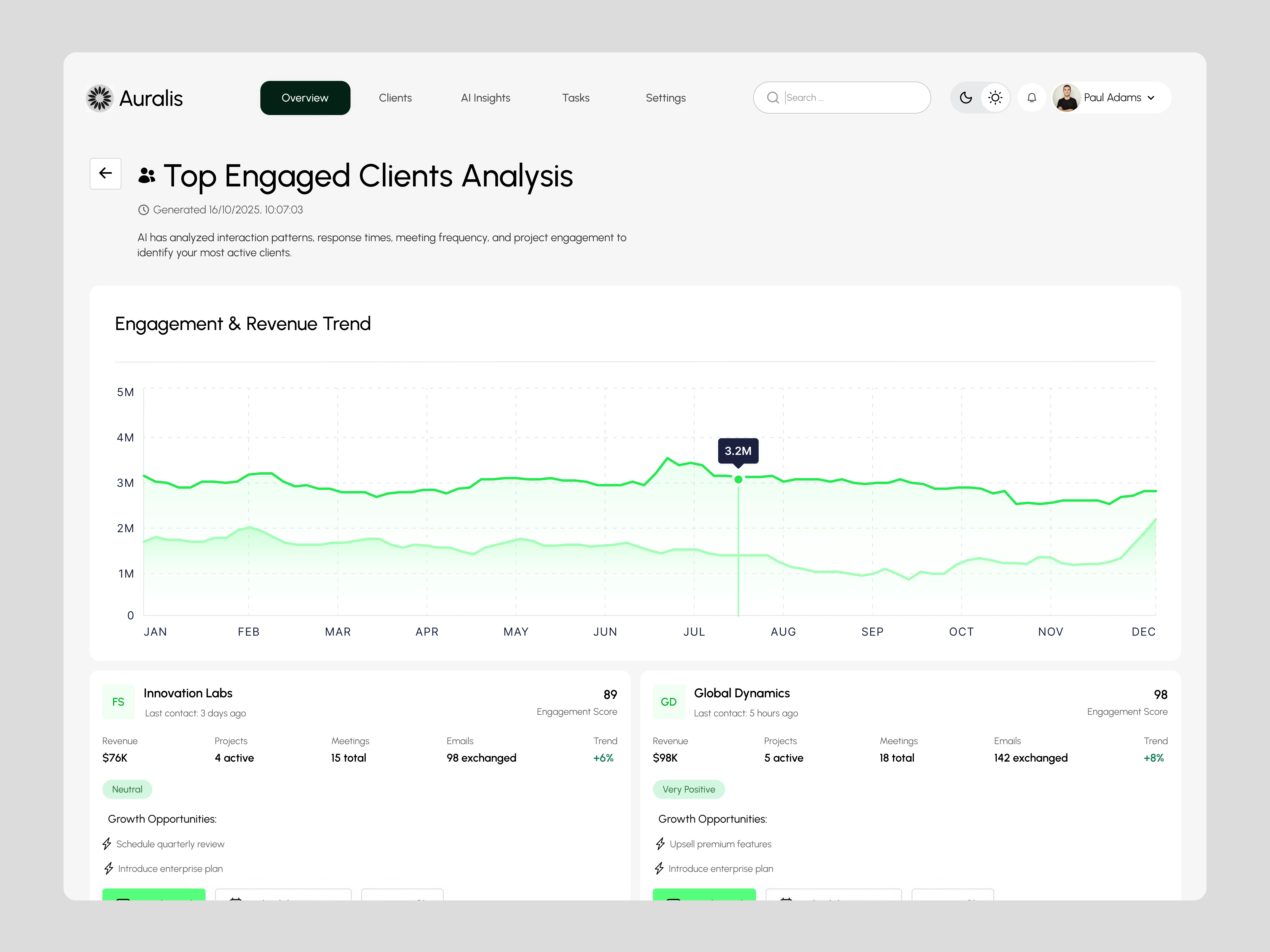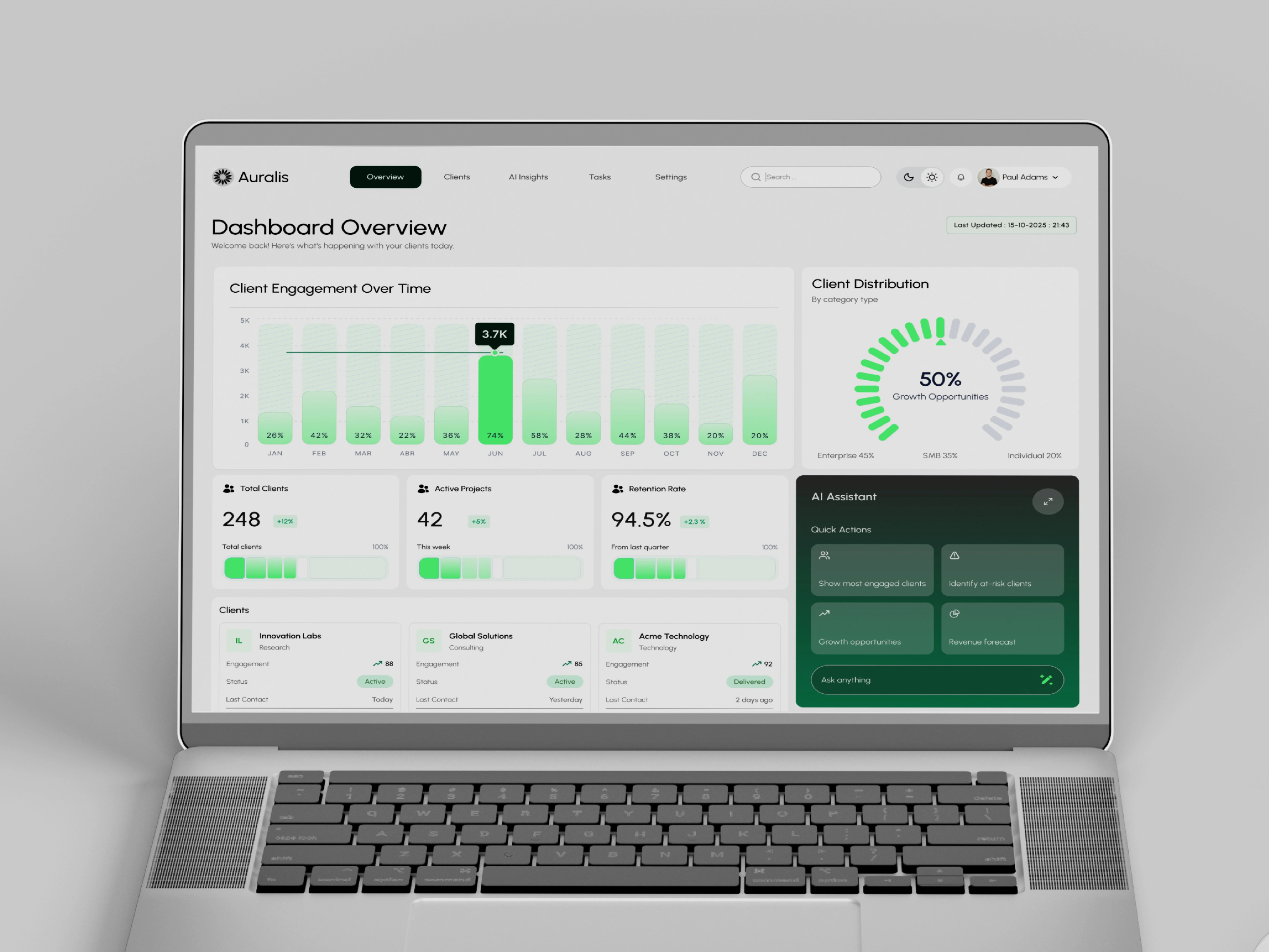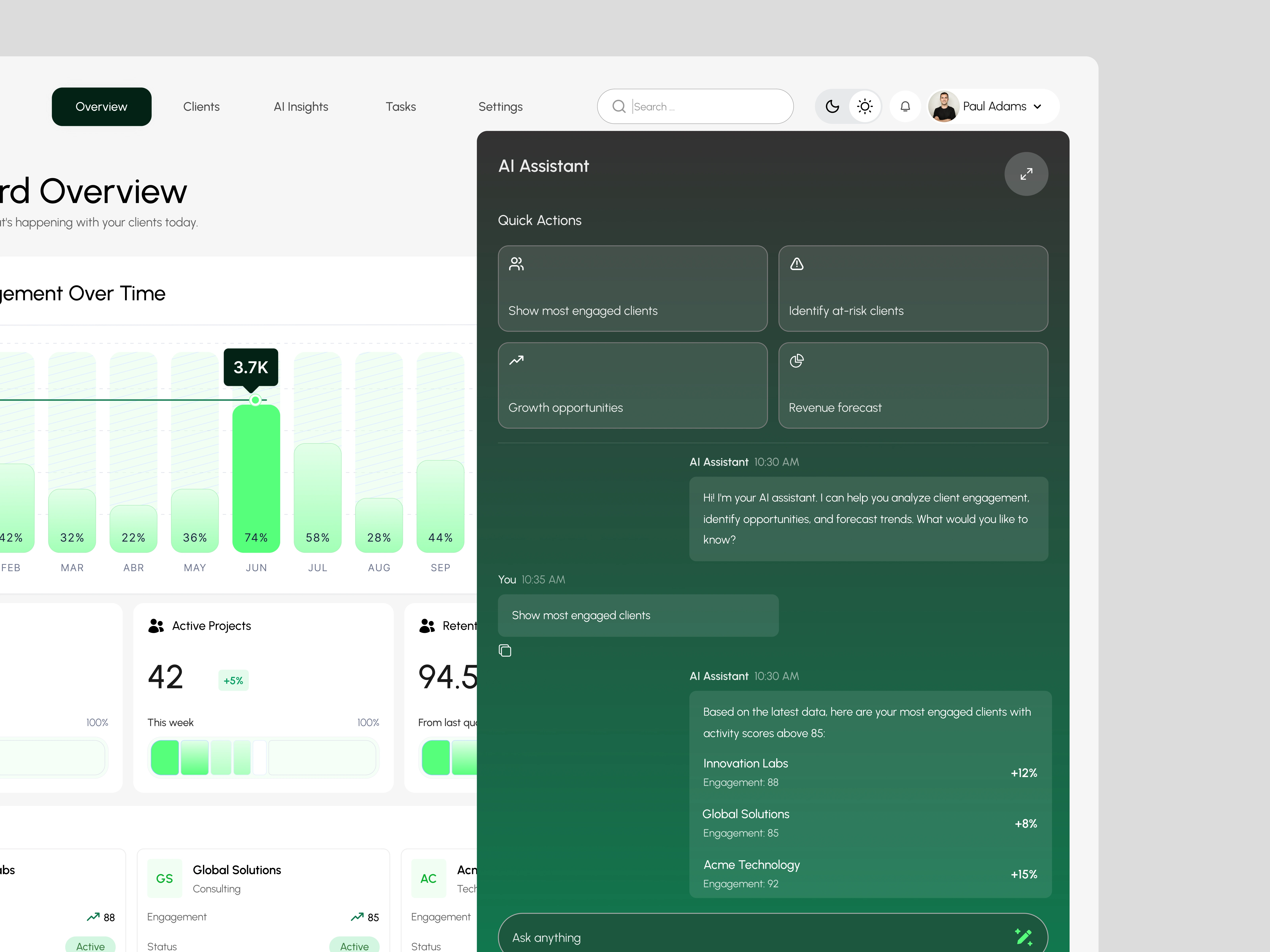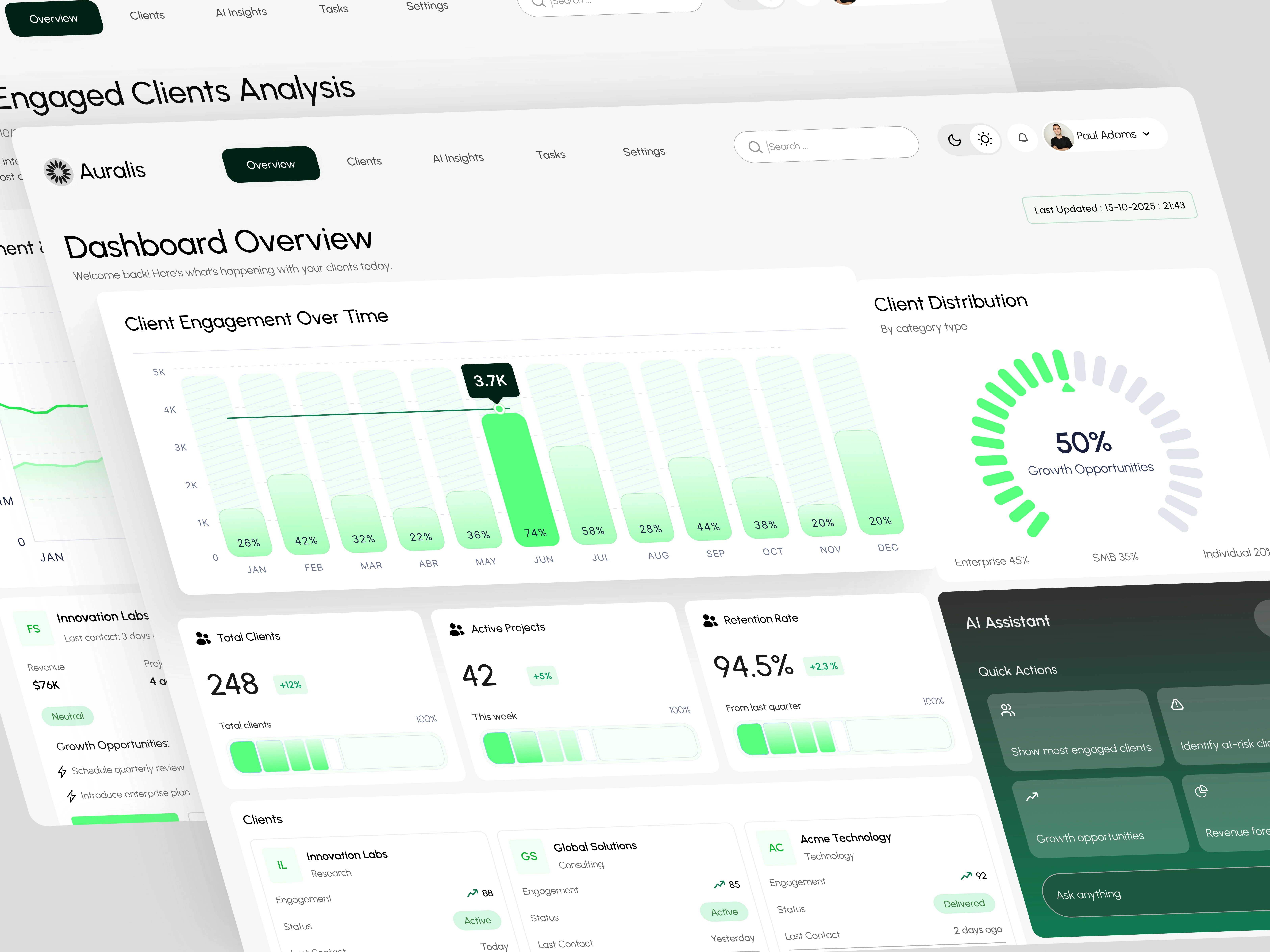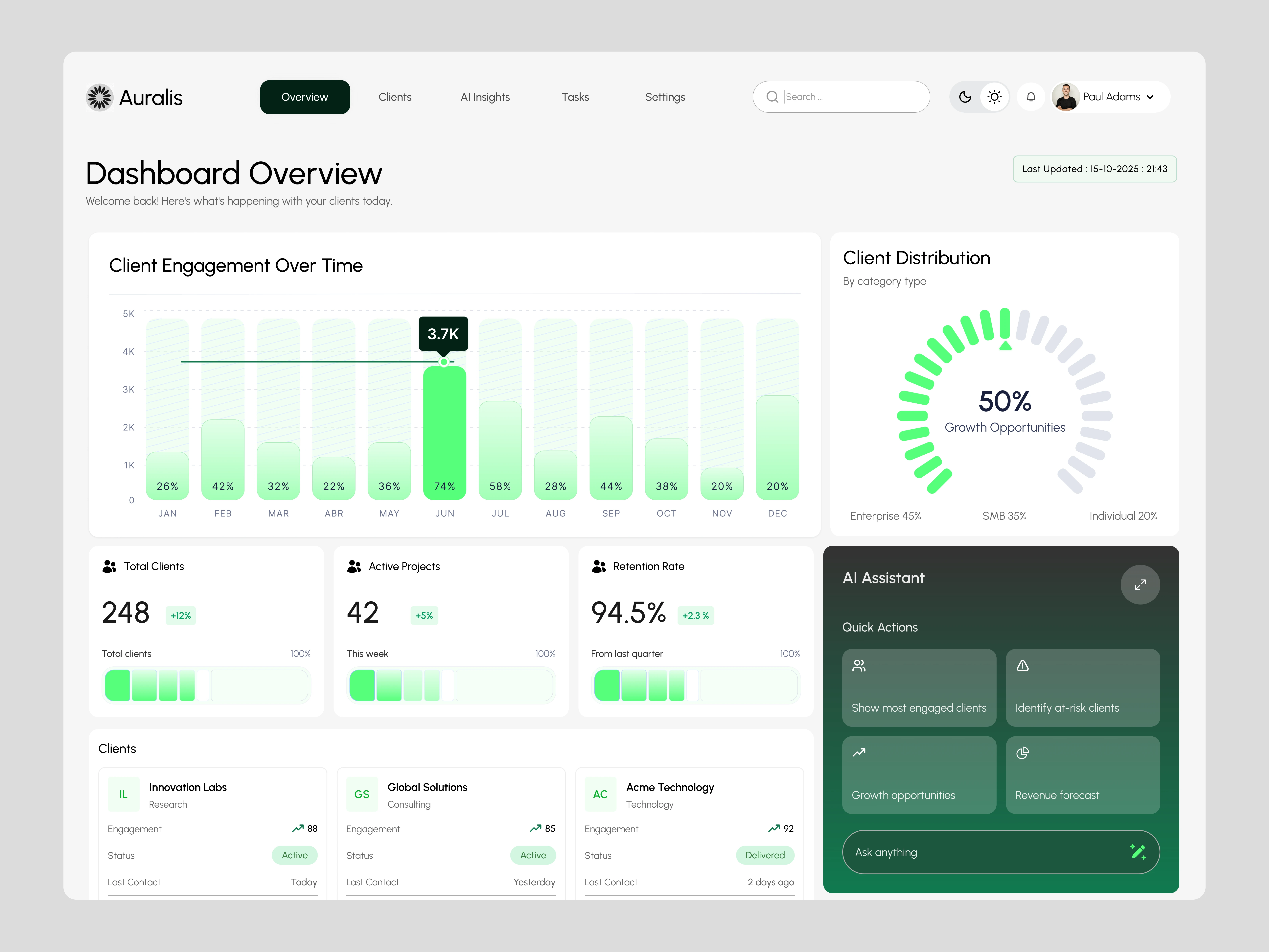 An intelligent client relationship management dashboard that leverages AI to transform raw client data into actionable business insights. The platform combines real-time analytics with predictive AI models to help businesses optimize client engagement, identify at-risk accounts, and uncover growth opportunities.