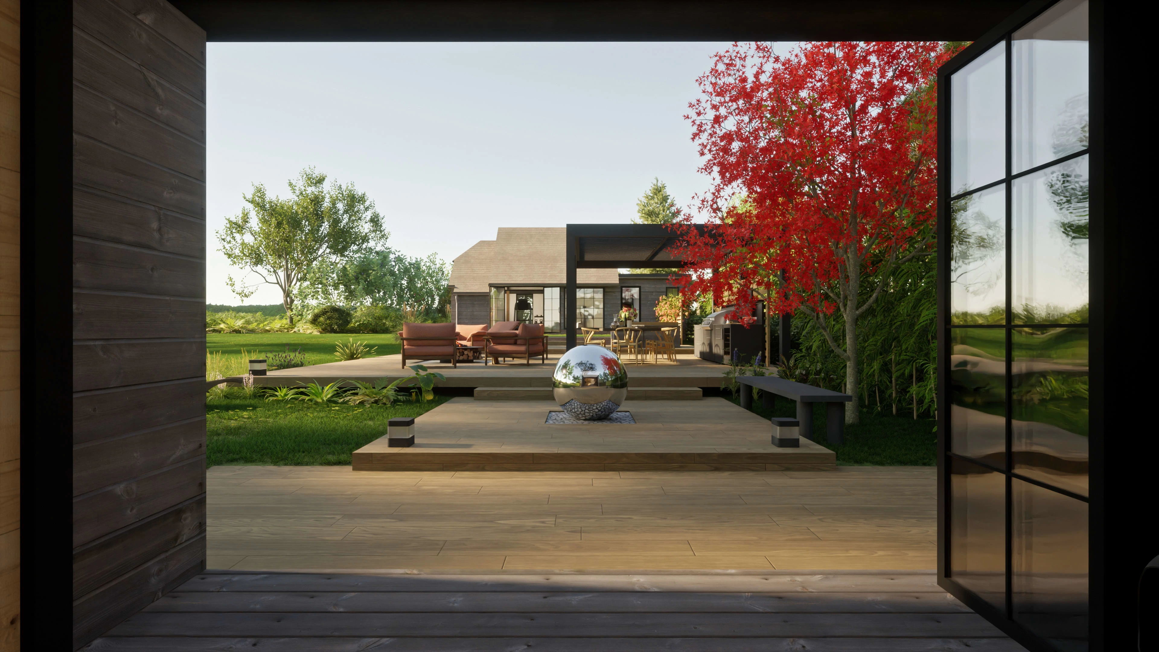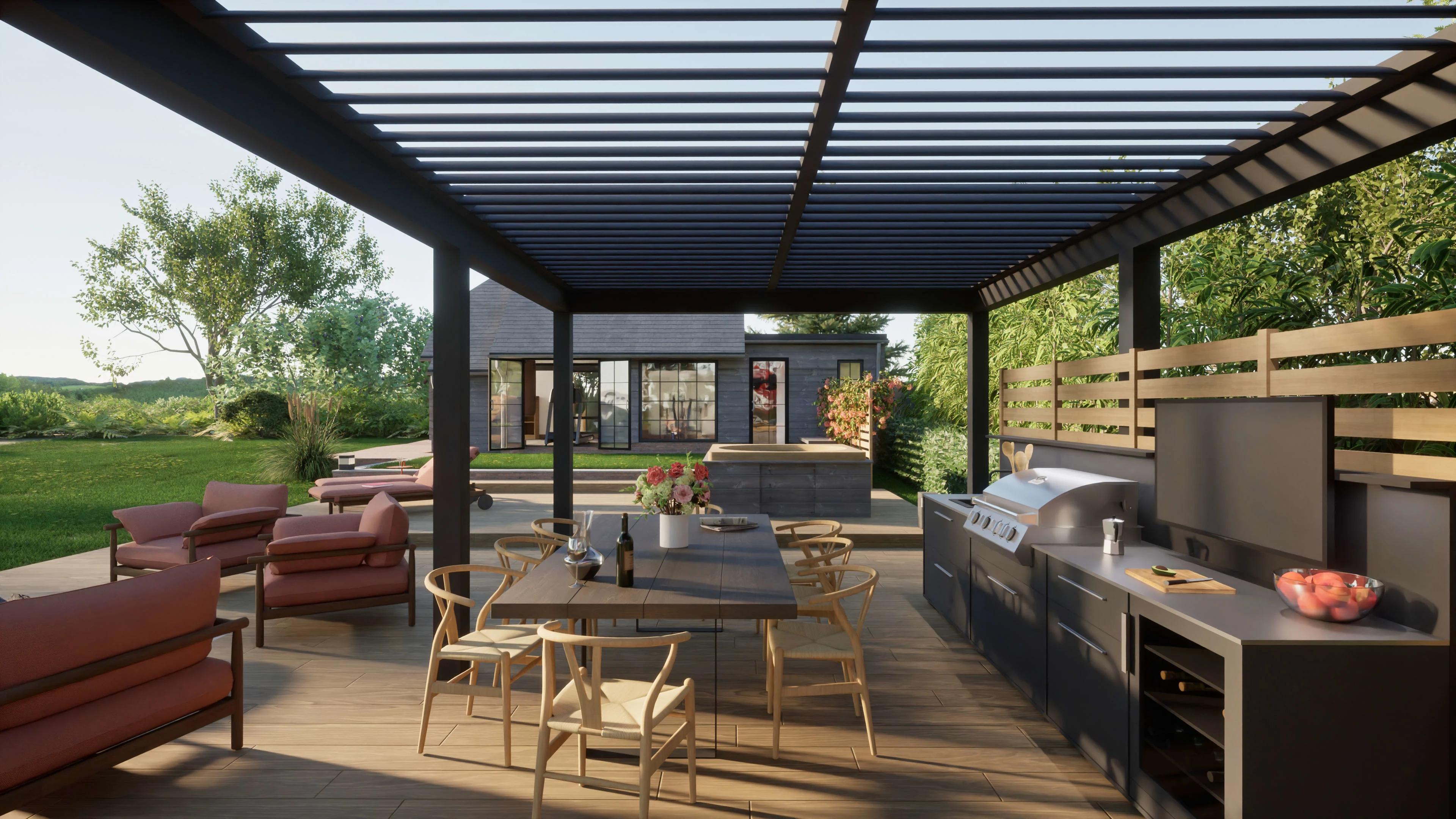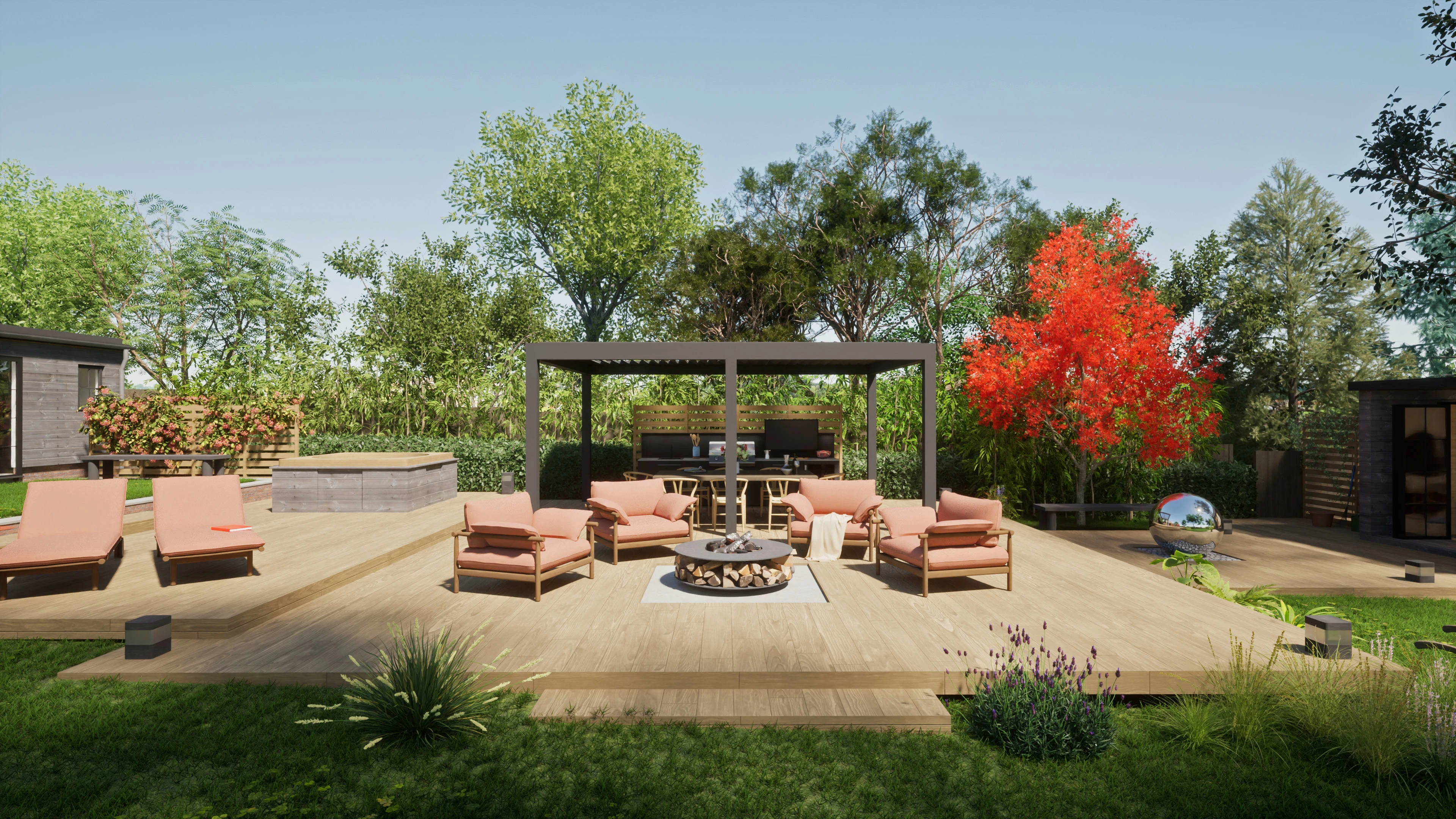 Landscape arrangement with outdoor kitchen, jacuzzi, firepit and gym.