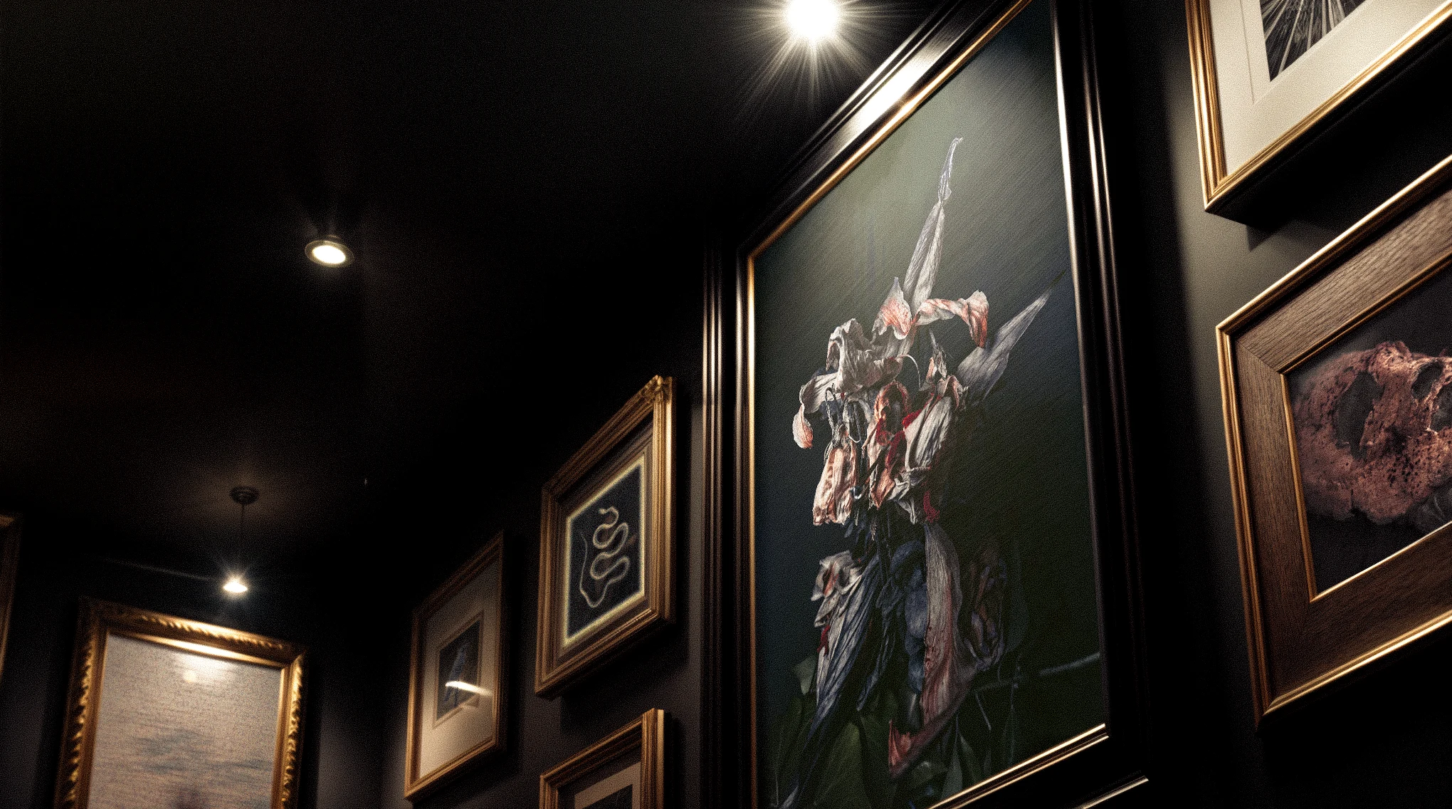 From up close, they show a wildness that was always there. From a distance, they reveal something far more intimate and important—a droplet of water symbolizing panic, a knife curled in hand on a sleepless night, a deer carcass consumed in desperation, etc.