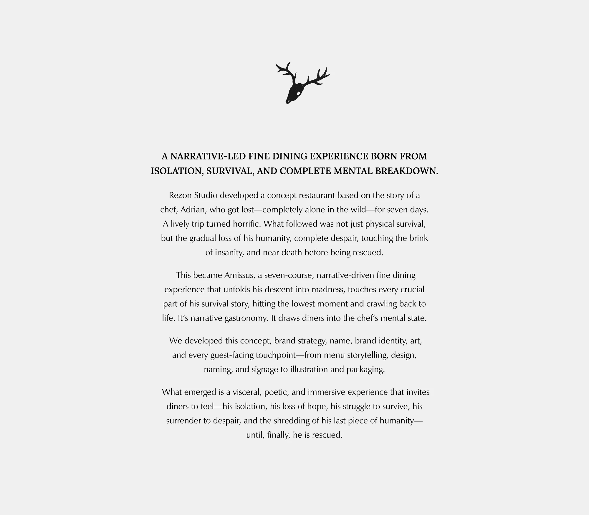 Rezon Studio created a concept restaurant inspired by chef Adrian’s harrowing 7-day survival in the wild, facing despair, madness, and near death.