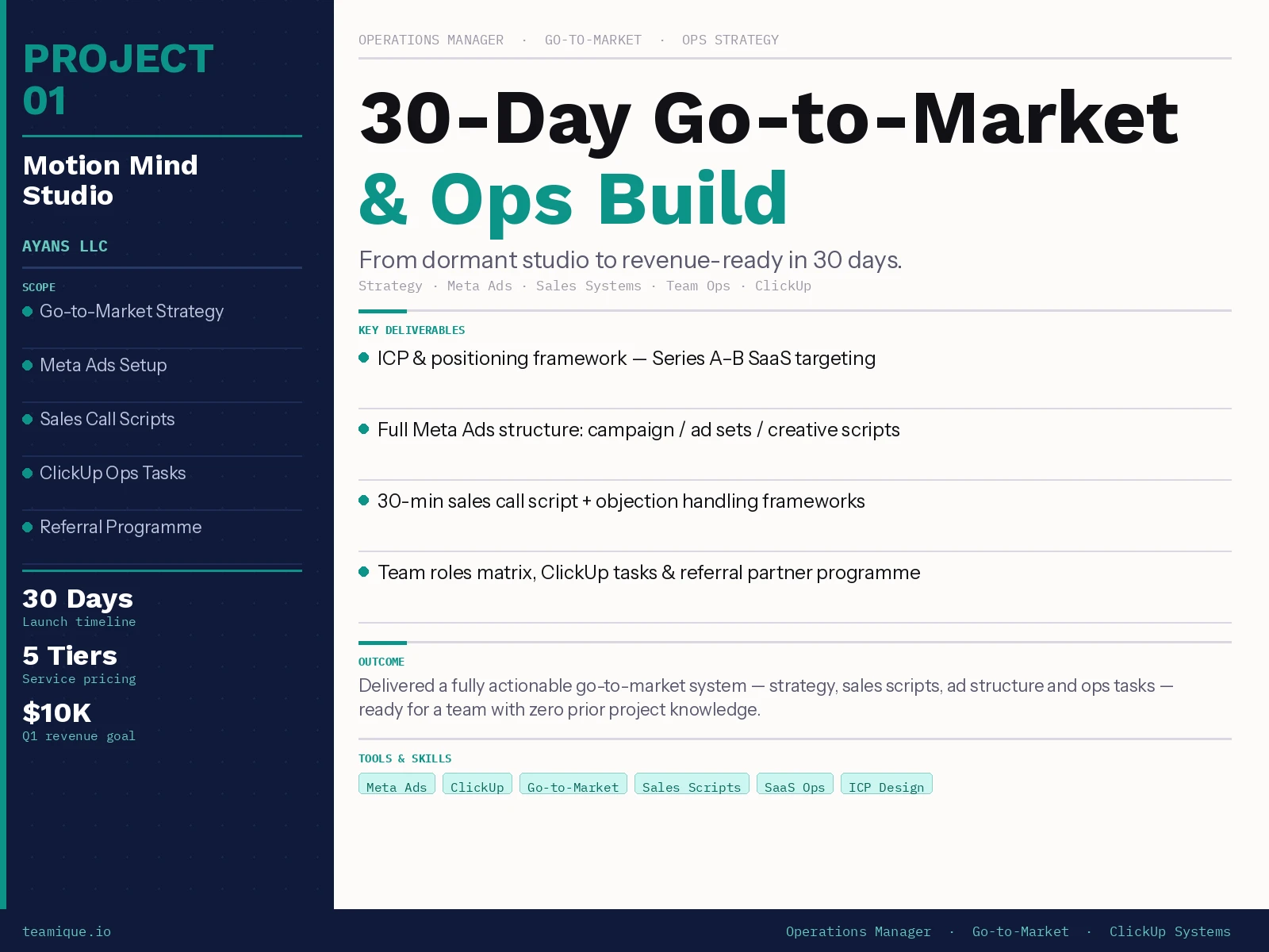 Go-to-market build for a B2B SaaS video studio ICP framework, Meta Ads structure, sales scripts & ClickUp ops tasks. Zero to launch-ready in 30 days.