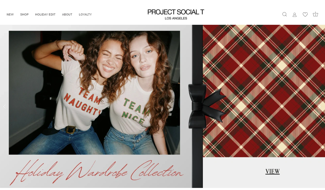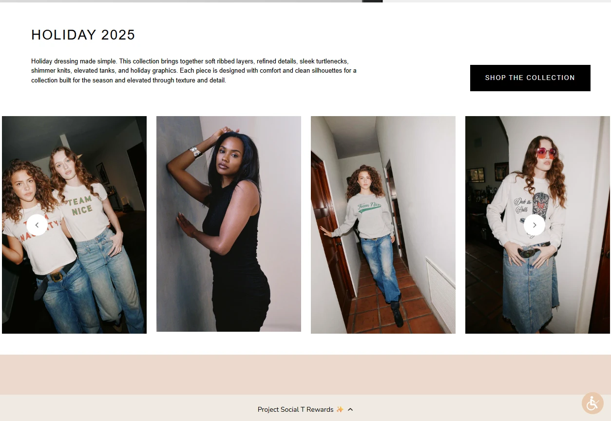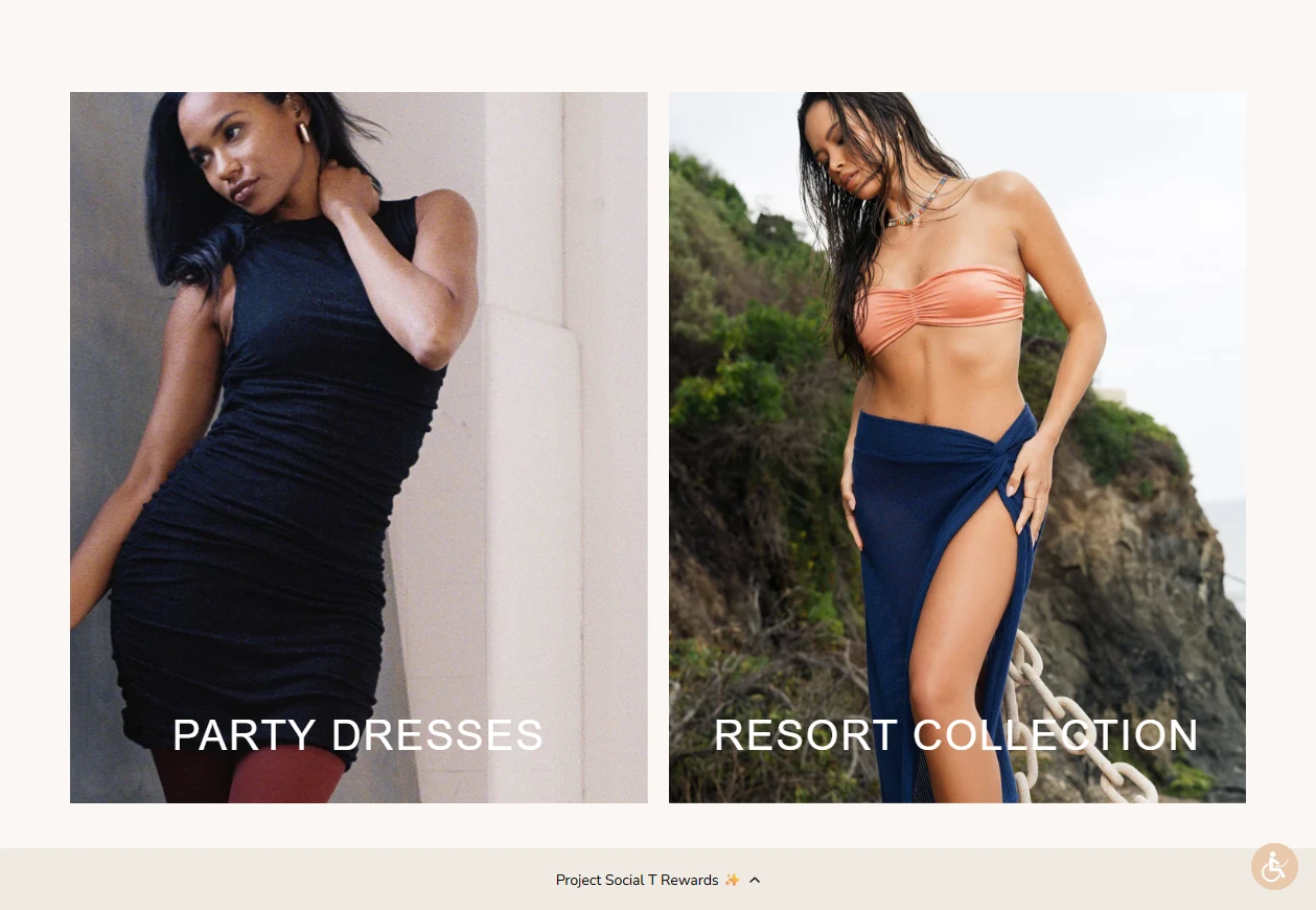 Project Social T is a women’s apparel brand on Shopify, featuring Core Essentials, seasonal “Holiday” and “Resort” edits, BOGO promos, loyalty/referral, and multi‑currency shopping. The build prioritizes mobile conversion, fast media, and promo clarity.