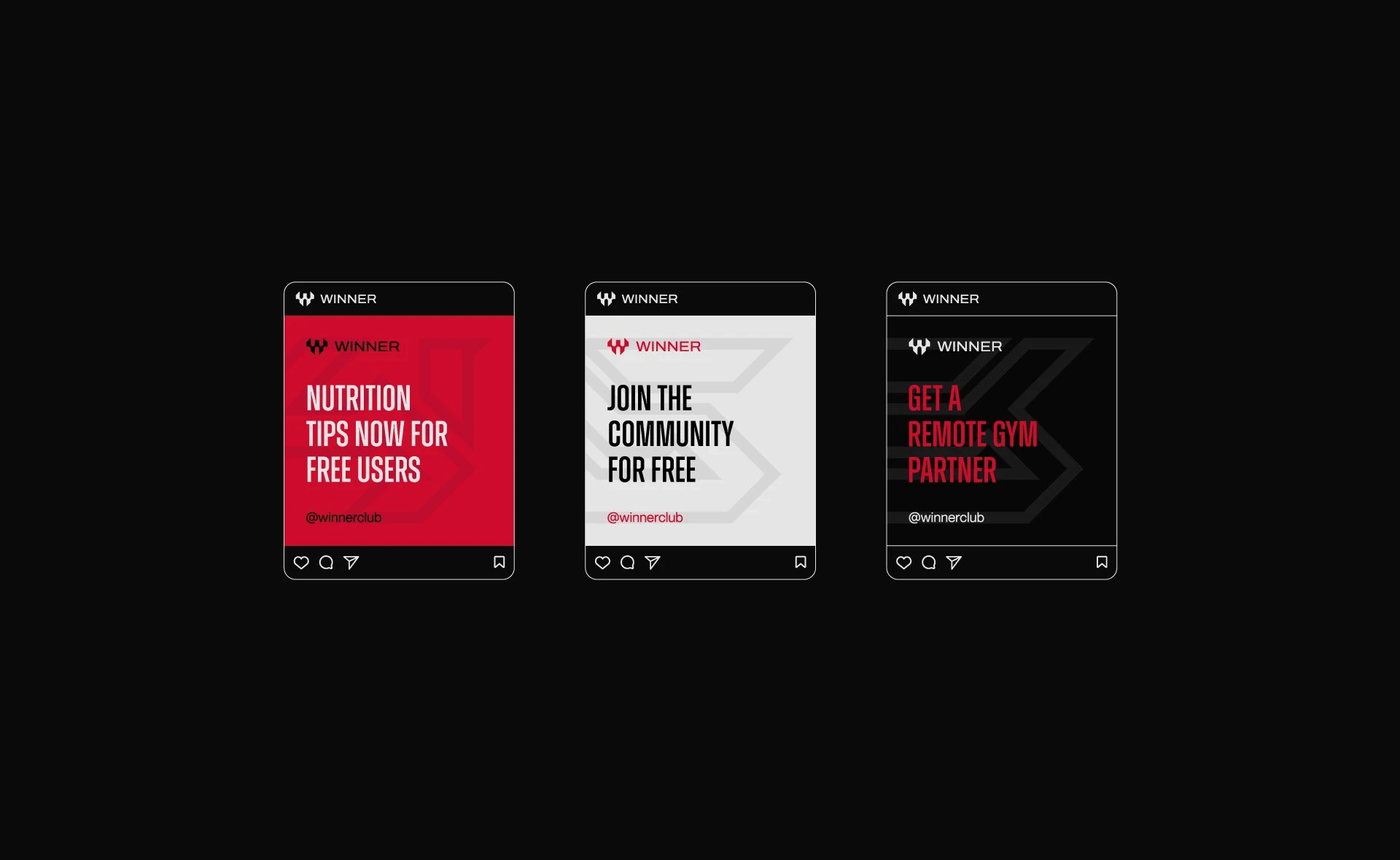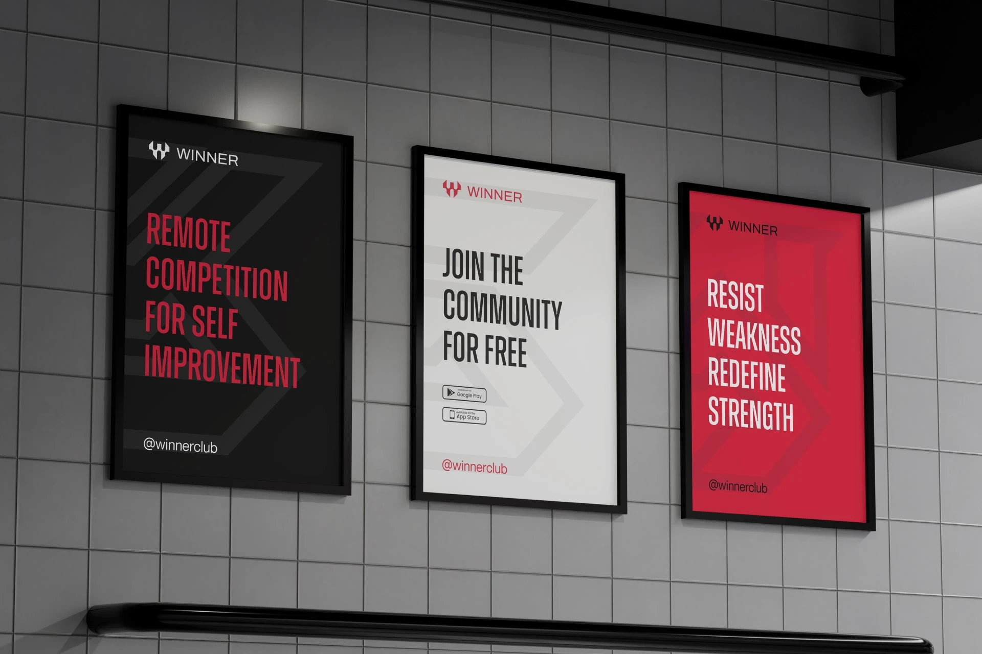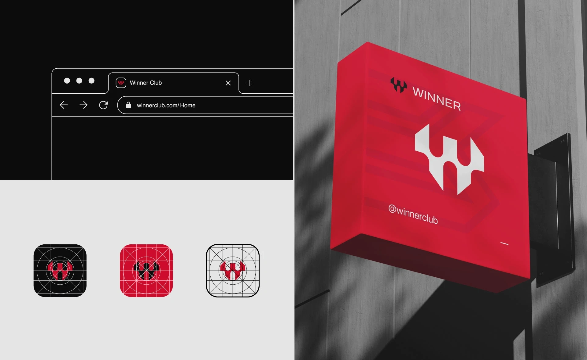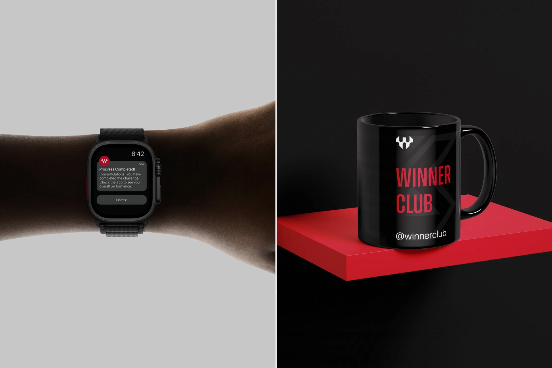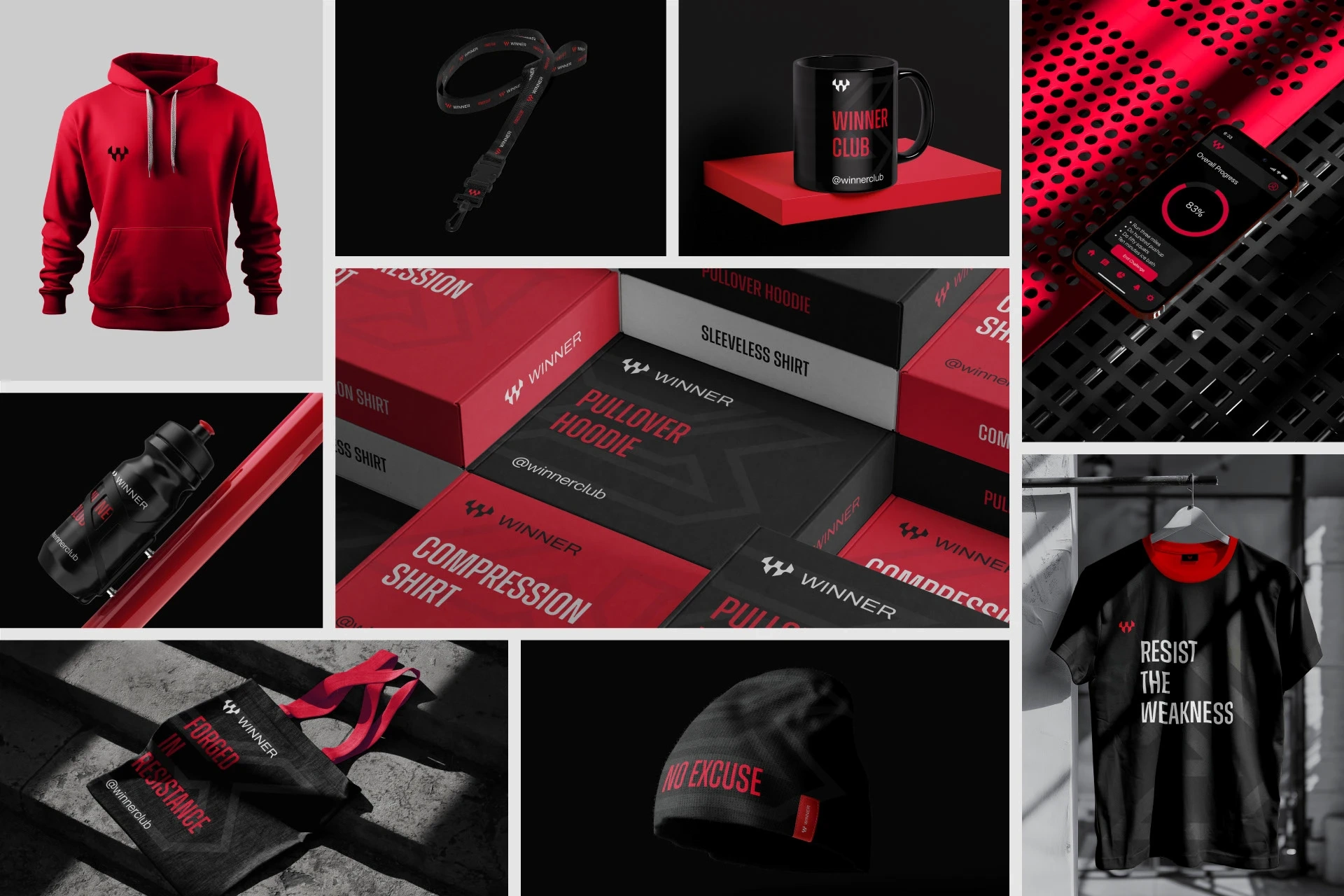 The design approach focused on creating a bold and assertive identity. The "Winner" logo features a stylized 'W' with sharp, aggressive edges symbolizing strength and resistance, balanced by subtle rounded connections hinting at the digital community. The core visual language utilizes a powerful palette of red, black, and white to convey intensity, dominance, and a winning spirit, consistent across all digital touch points from mobile apps to wearable tech.