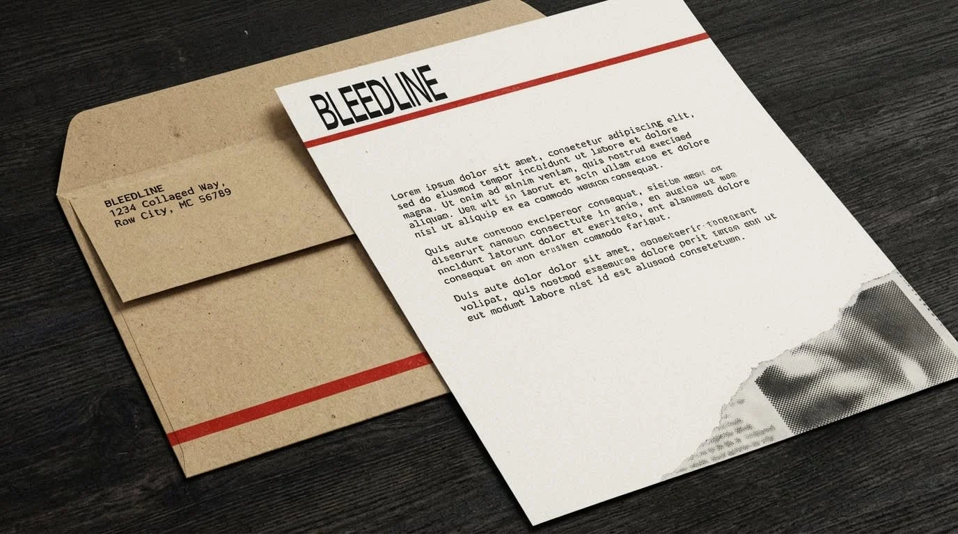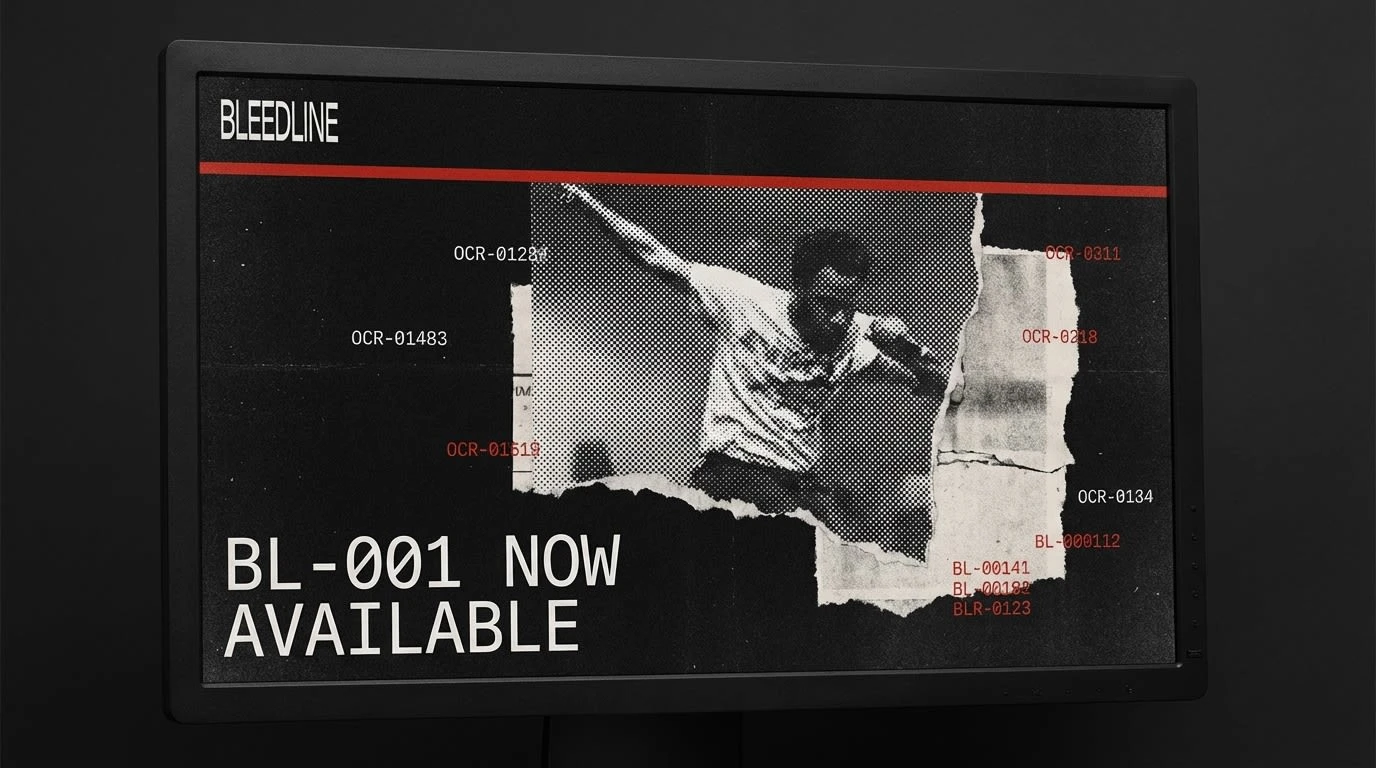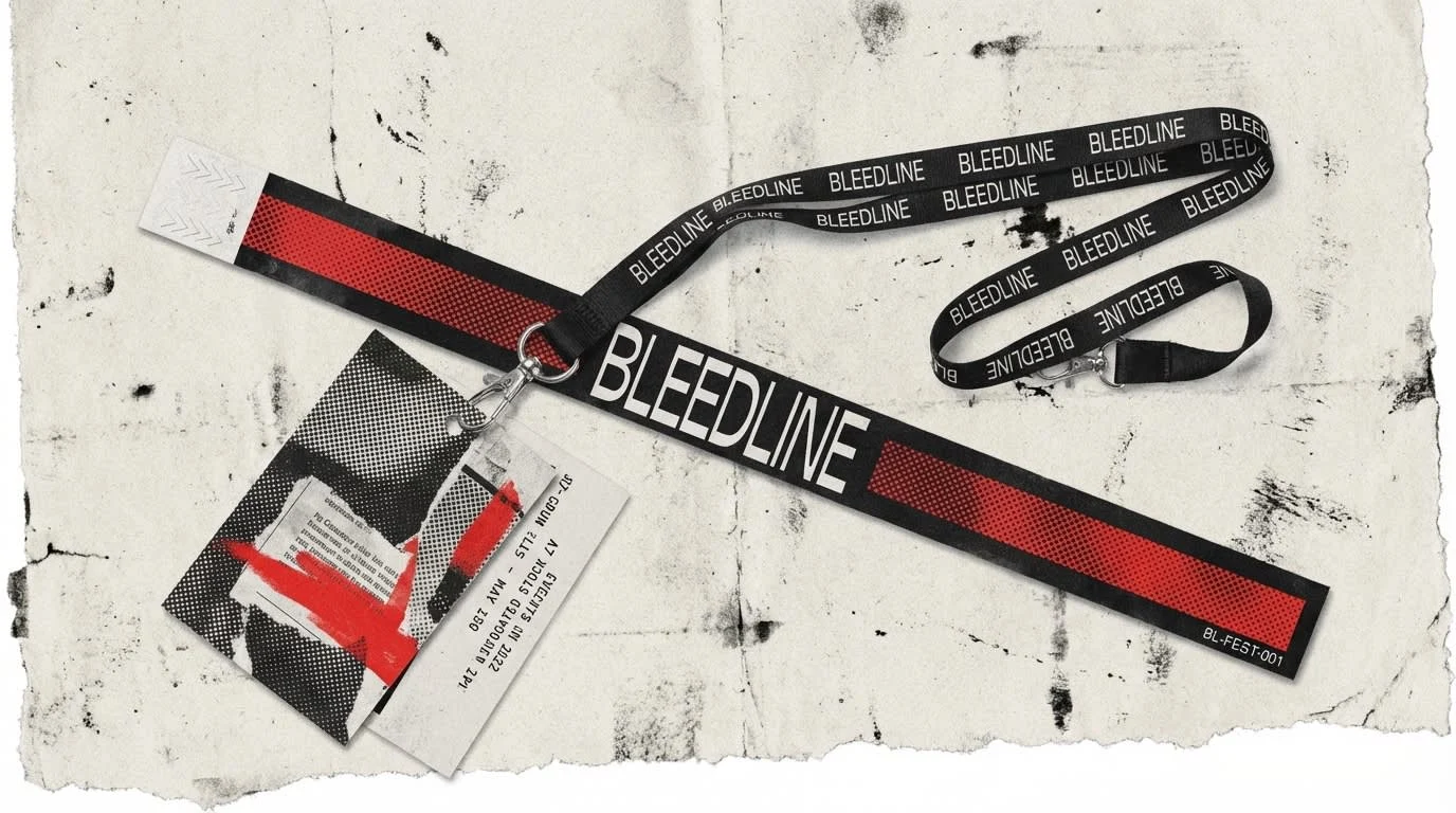 Bleed red #C8281E — the single color accent. Used structurally: as a registration stripe on the wristband, as a geometric cut on the vinyl sleeve, as an ink wash on the sweatshirt graphic, as a horizontal rule on the letterhead. It never decorates. It interrupts.