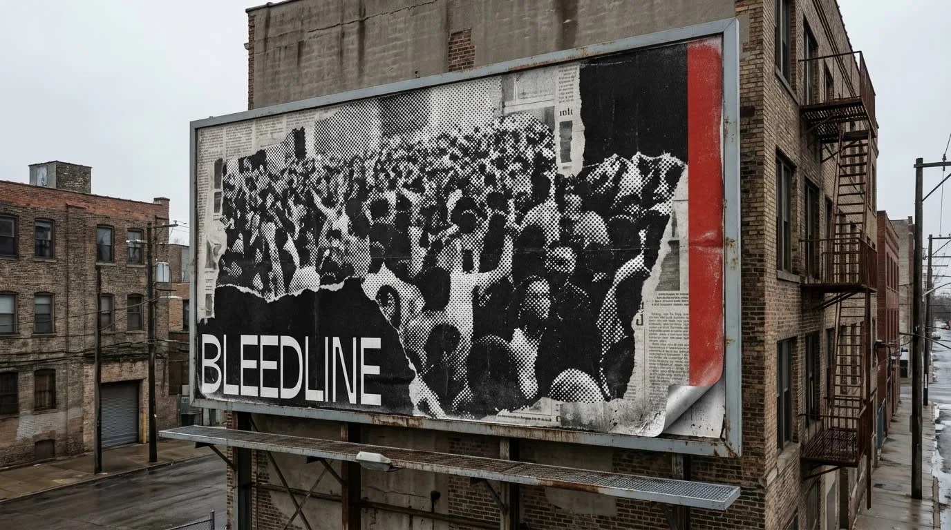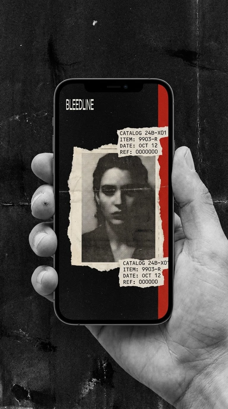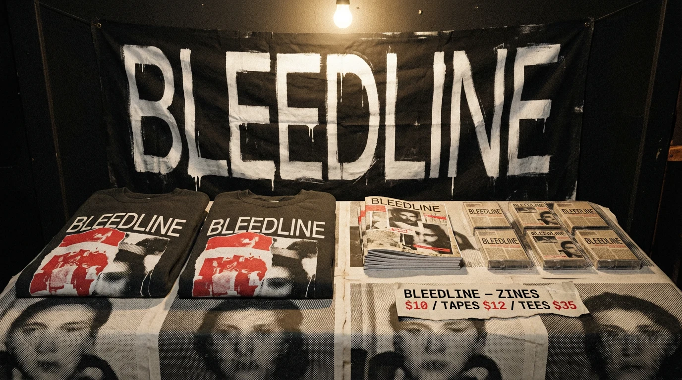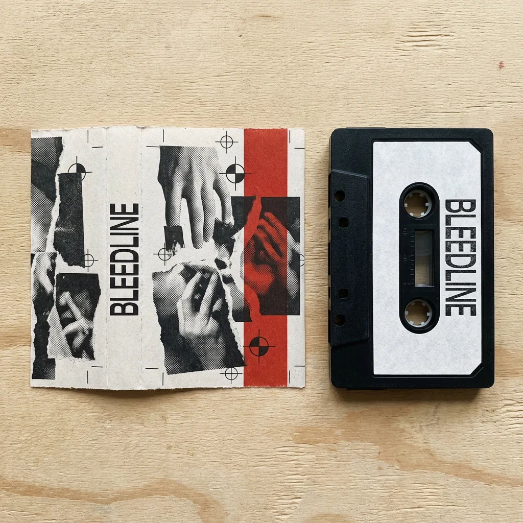 Bleed red #C8281E — the single color accent. Used structurally: as a registration stripe on the wristband, as a geometric cut on the vinyl sleeve, as an ink wash on the sweatshirt graphic, as a horizontal rule on the letterhead. It never decorates. It interrupts.