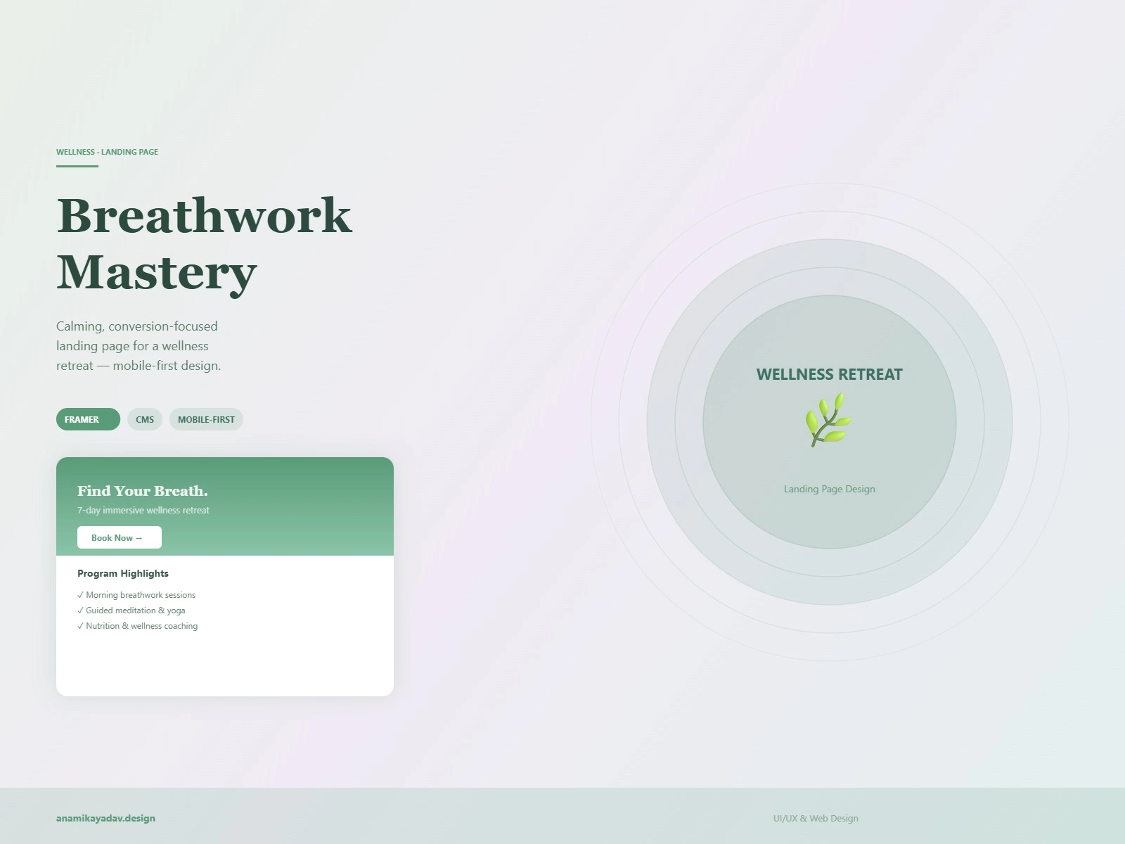 Calming, conversion-focused Framer landing page for a wellness retreat — booking integration, mobile-first responsive design, and serene visual storytelling.