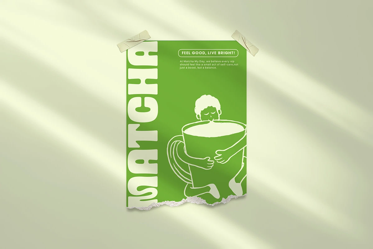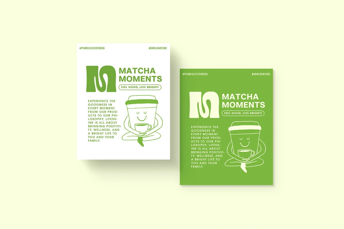 The "Matcha Moments" flyer design was created to promote a matcha-based product line and the positive lifestyle philosophy of the brand. The goal of the flyer was to communicate the concept of "Feel Good, Live Bright!" in a clean, vibrant, and approachable way. The design needed to highlight the product’s health benefits while aligning with the brand's positive, wellness-focused ethos.