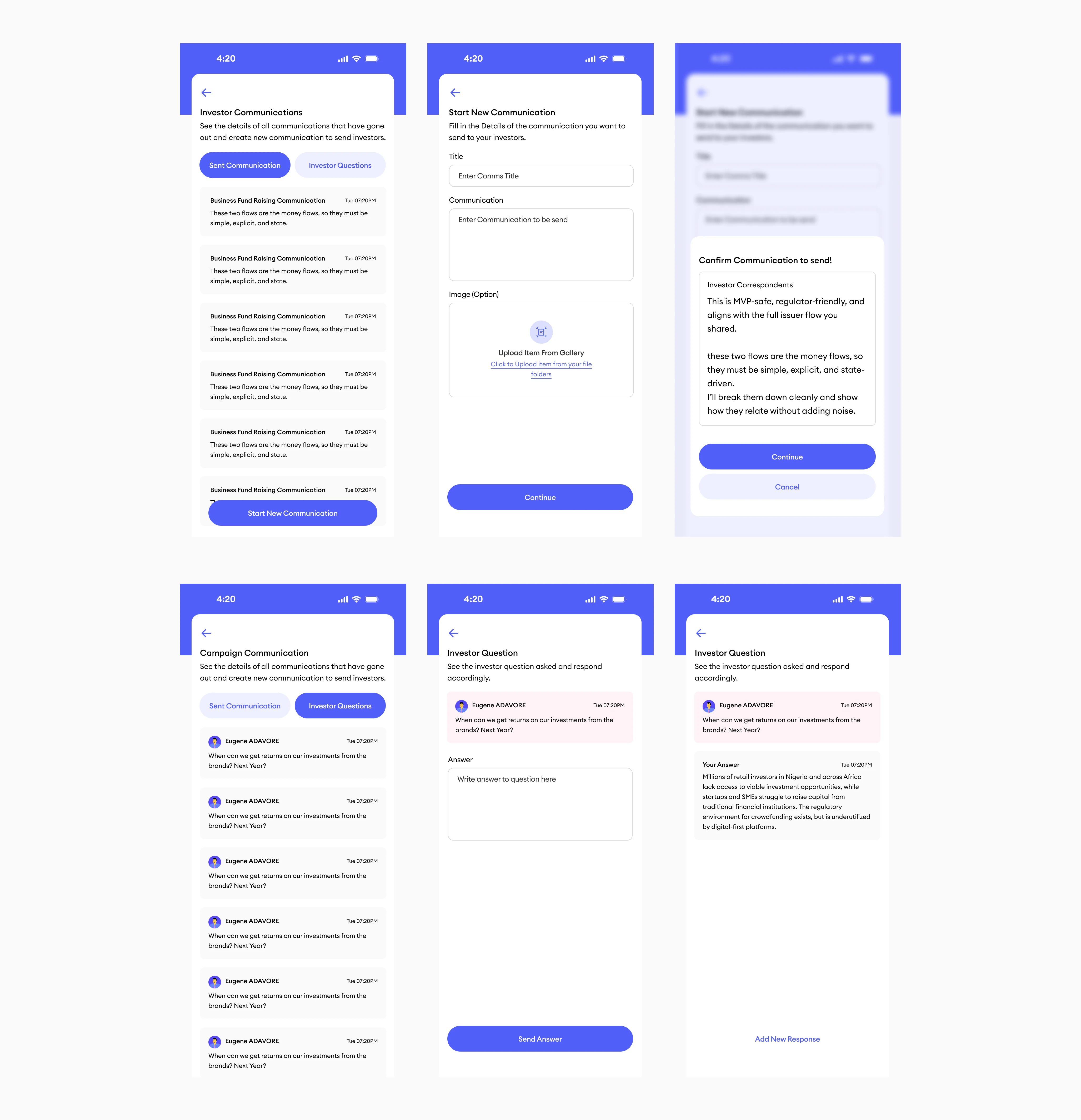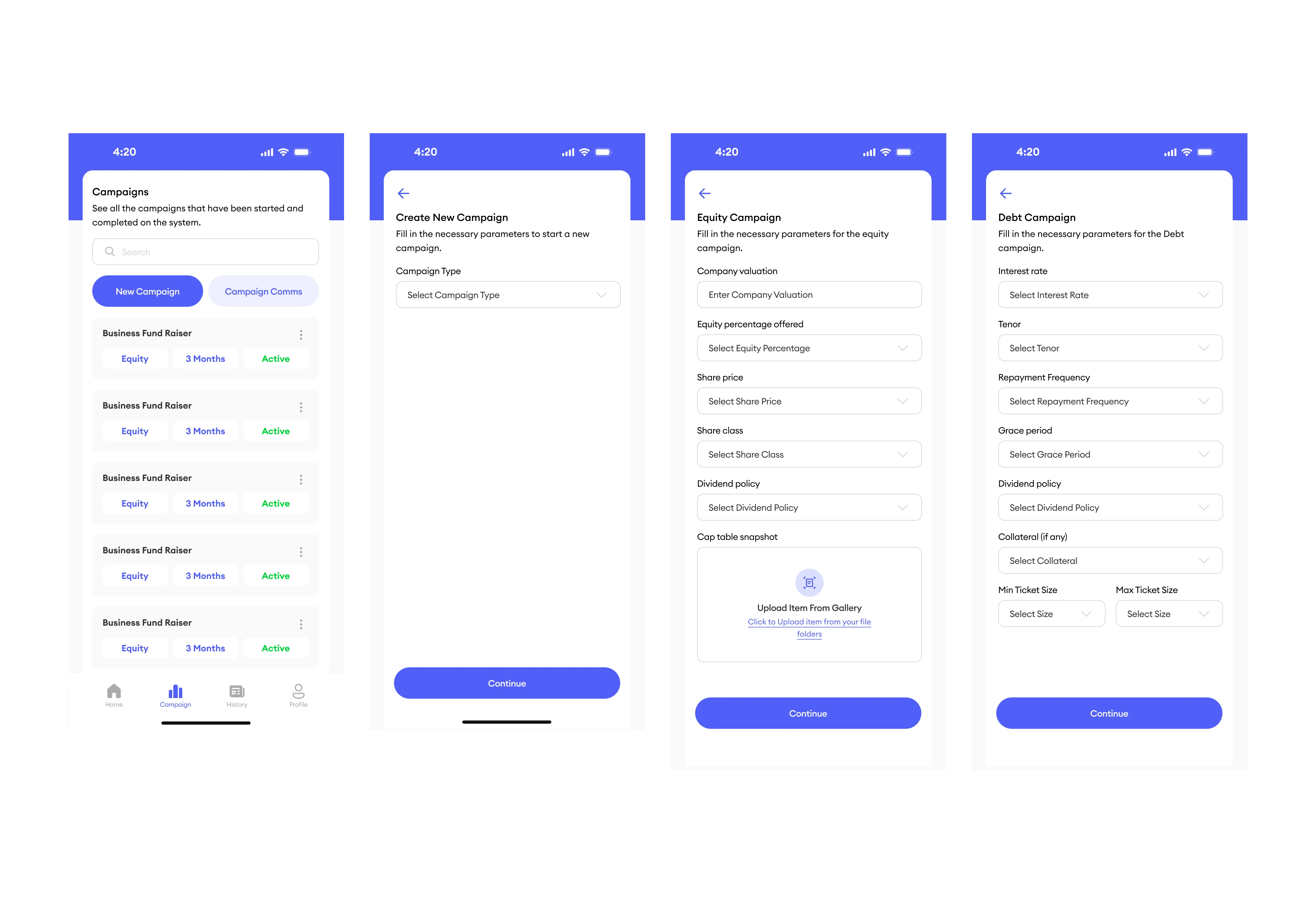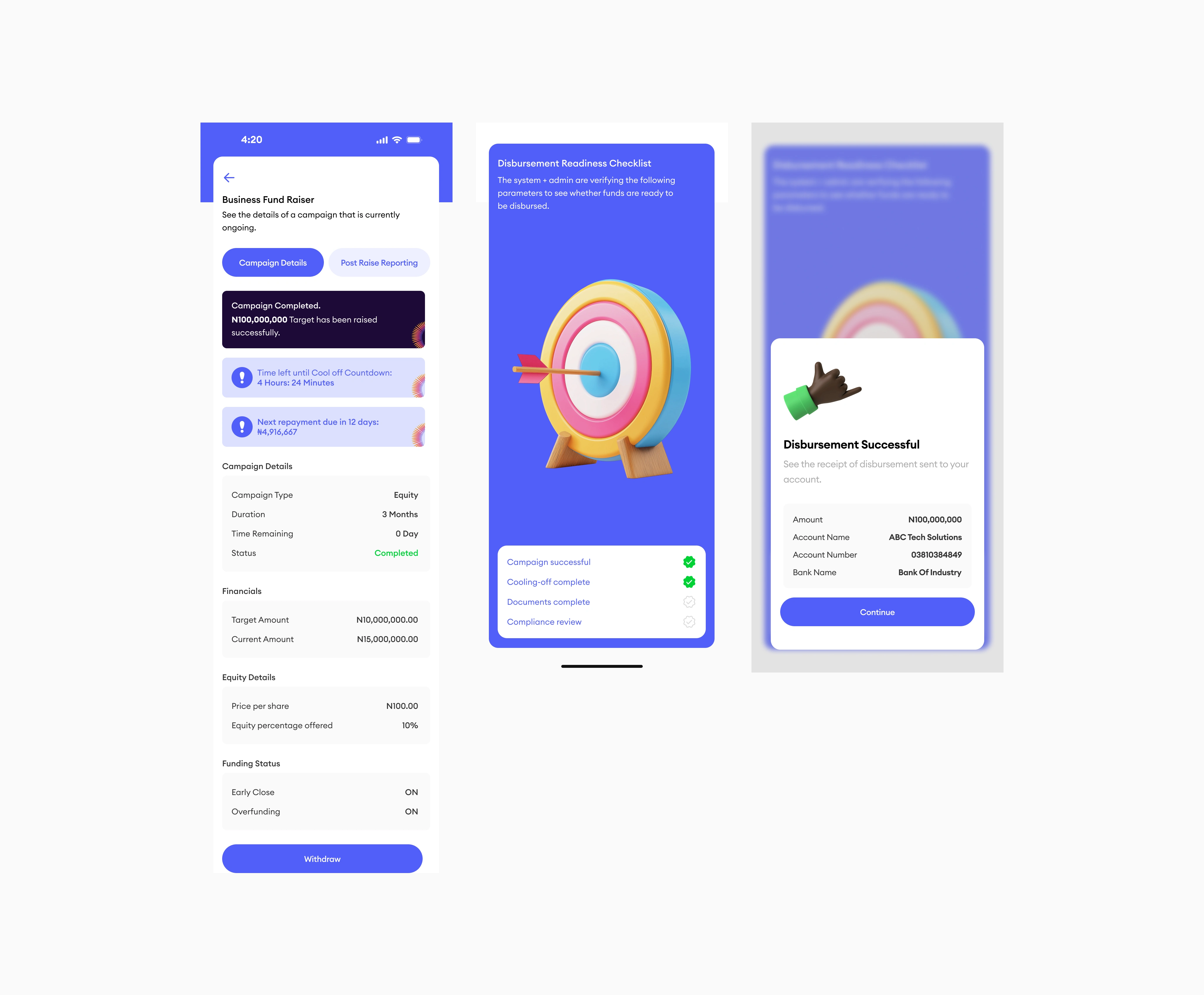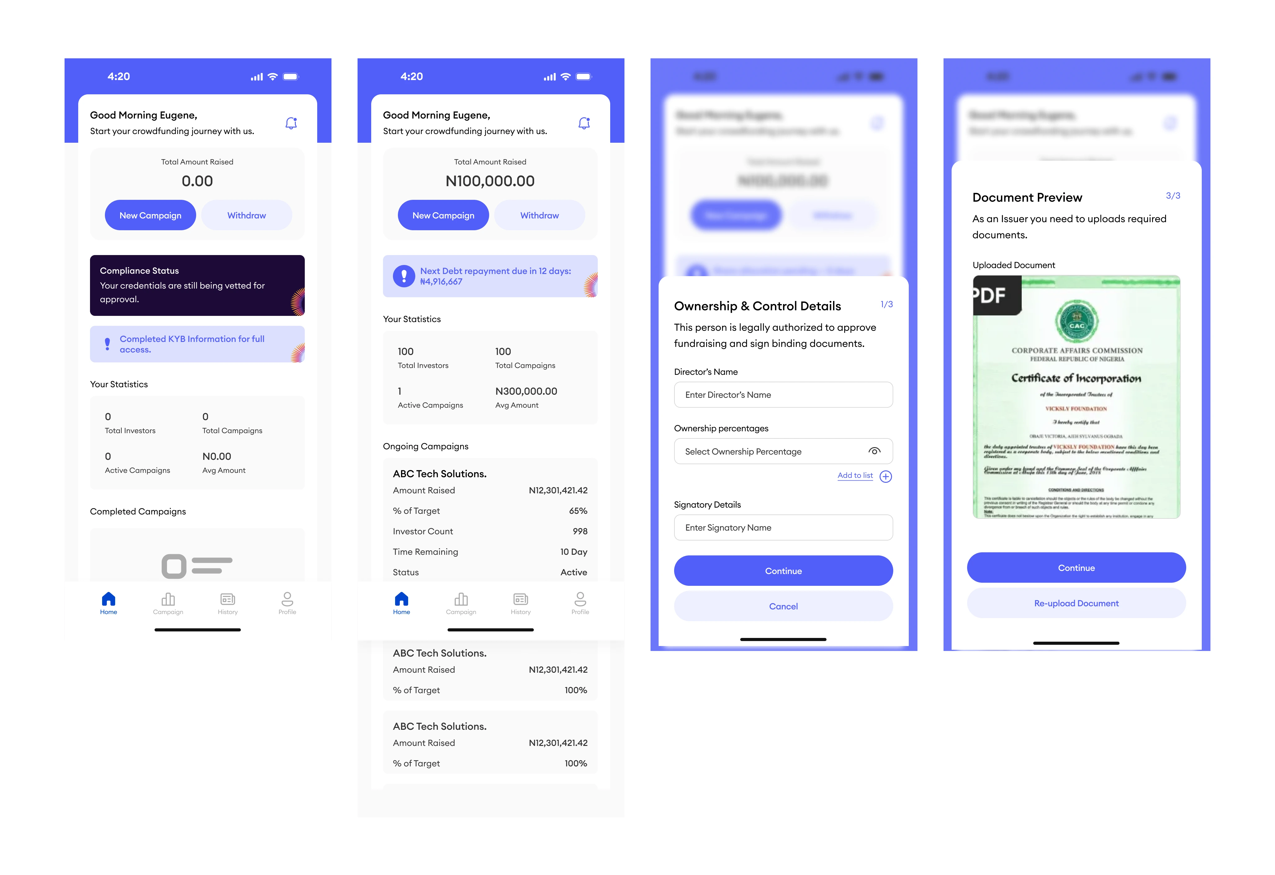 By focusing on clear investment information, intuitive campaign discovery, and real-time portfolio tracking, the mobile experience enables users to confidently explore opportunities and participate in pooled investments.