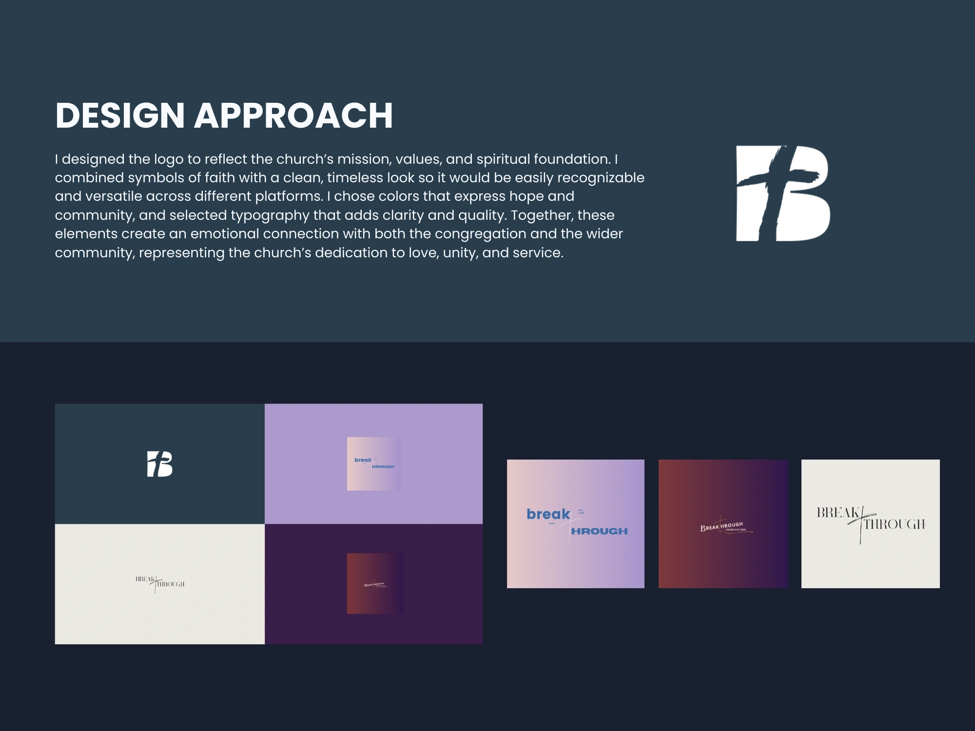 The Breakthrough Church logo was created as more than just a symbol, it is a visual expression of faith, hope, and transformation. Each element carries meaning: the ''B'' design reflects the church's name, while the cross upward flow represents breakthrough in Christ. The balance of modern simplicity with timeless symbolism was chosen to ensure the logo feels approachable, yet deeply rooted in spiritual truth. Just as the church’s mission is to guide people toward God’s love and power, the logo stands as a reminder that in every season, breakthroughs are possible through faith.