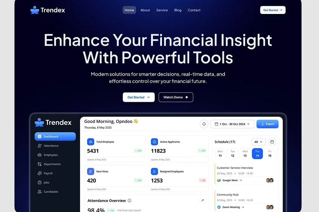 Our role included UI/UX design, interaction design, and animation. Starting from user research, we created wireframes and then developed a clean, responsive interface in Figma. The dashboard features interactive charts, task tracking modules, and customizable quick actions, making complex data easier to understand and act upon.