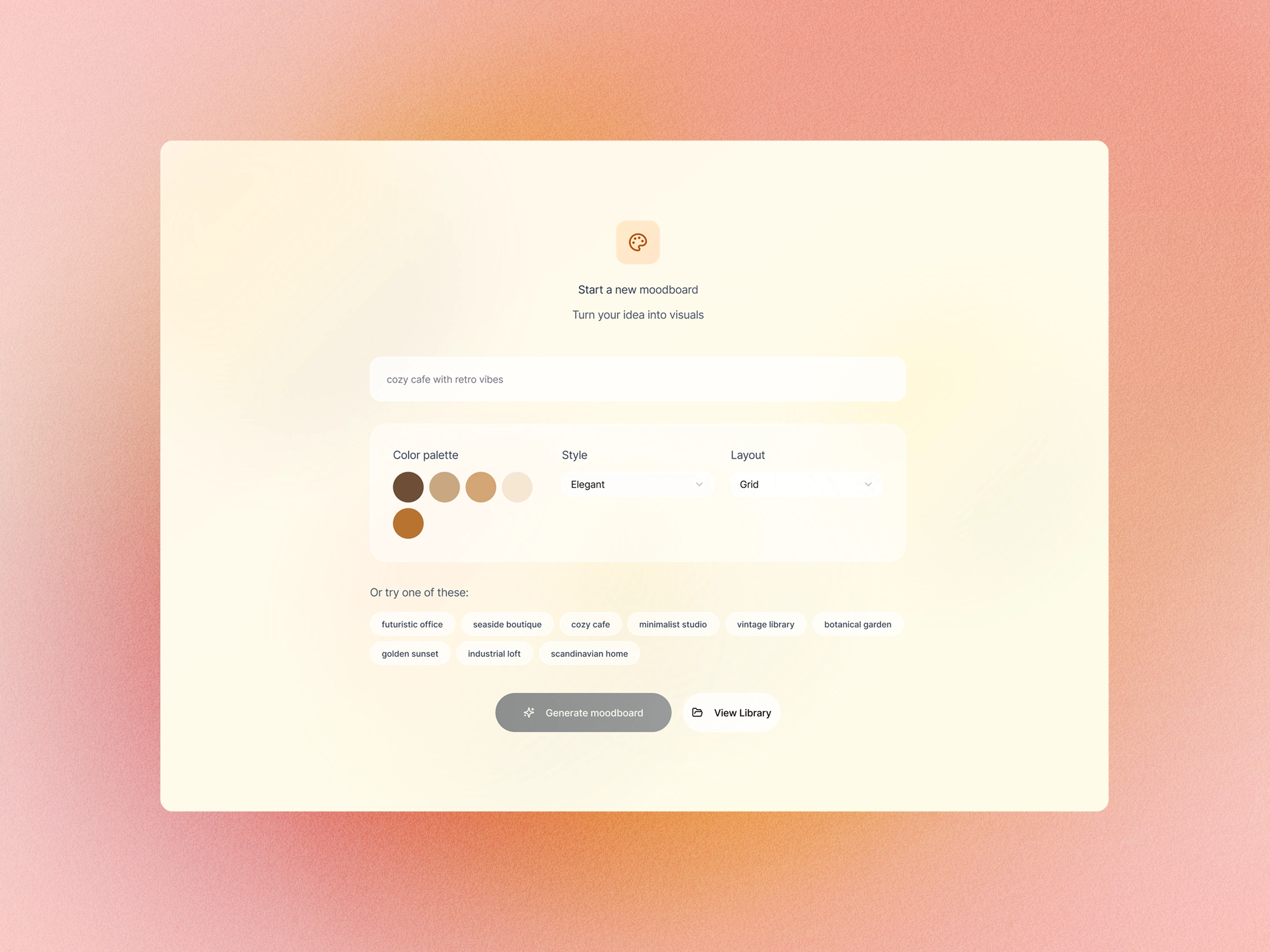 Turns raw ideas into ready-to-use moodboards — images, colors, and type delivered in seconds, so users spend less time hunting and more time creating.