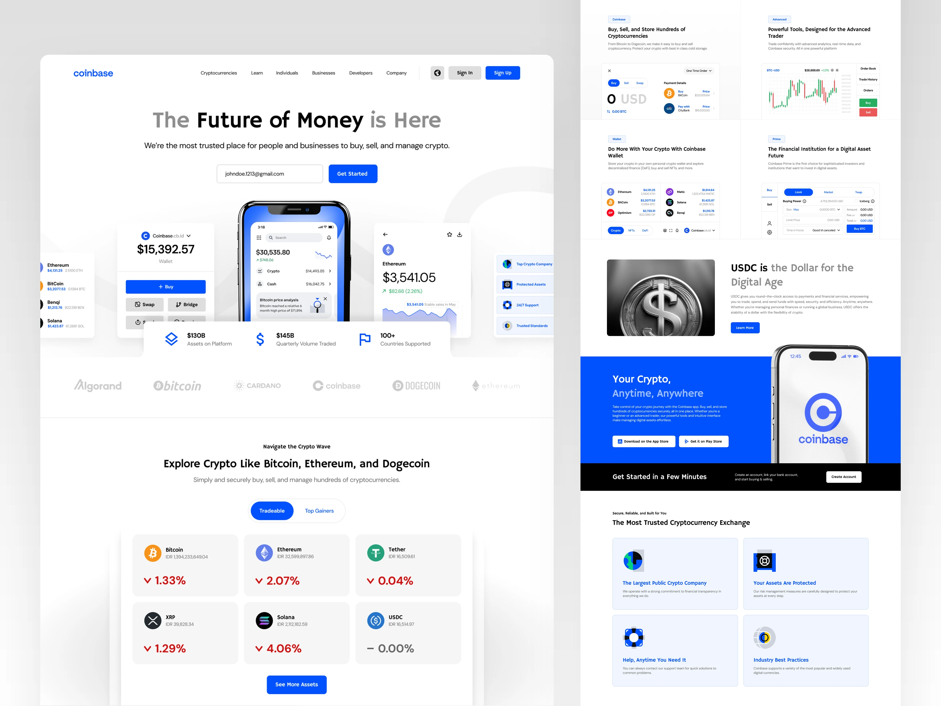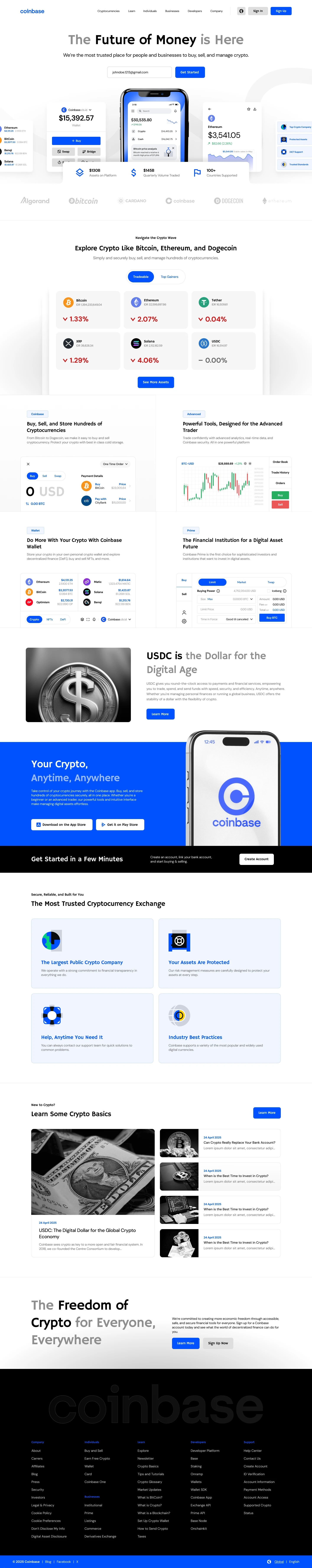 A fresh website redesign for Coinbase, optimizing user experience for crypto trading and portfolio management. Features a cleaner look and streamlined flows.