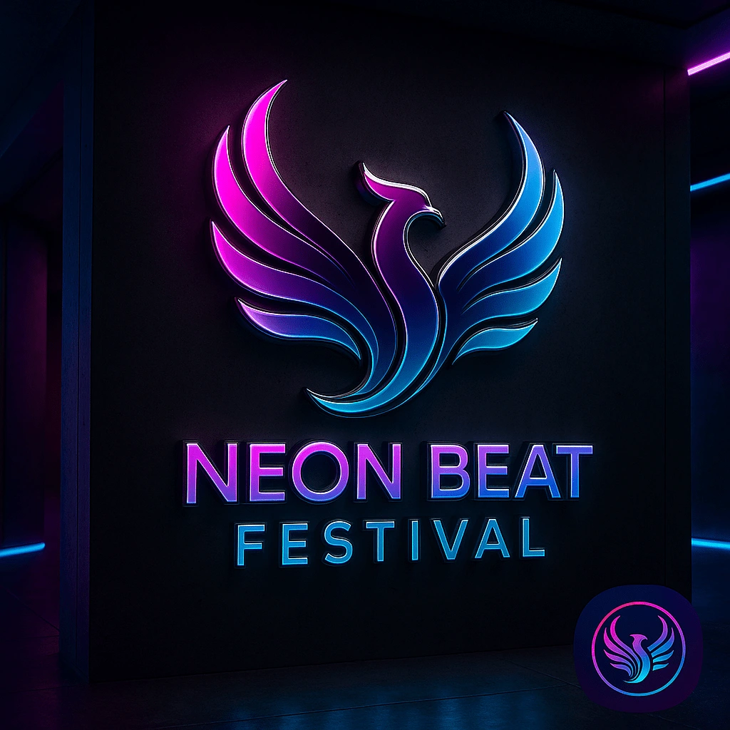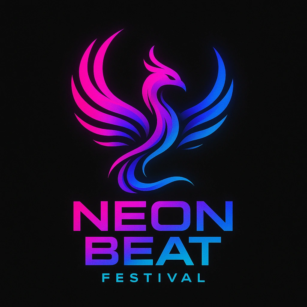Vibrant neon phoenix branding + mockup and Icon hype for Neon Beat Festival 2026—EDM energy meets retro‑futuristic visuals.