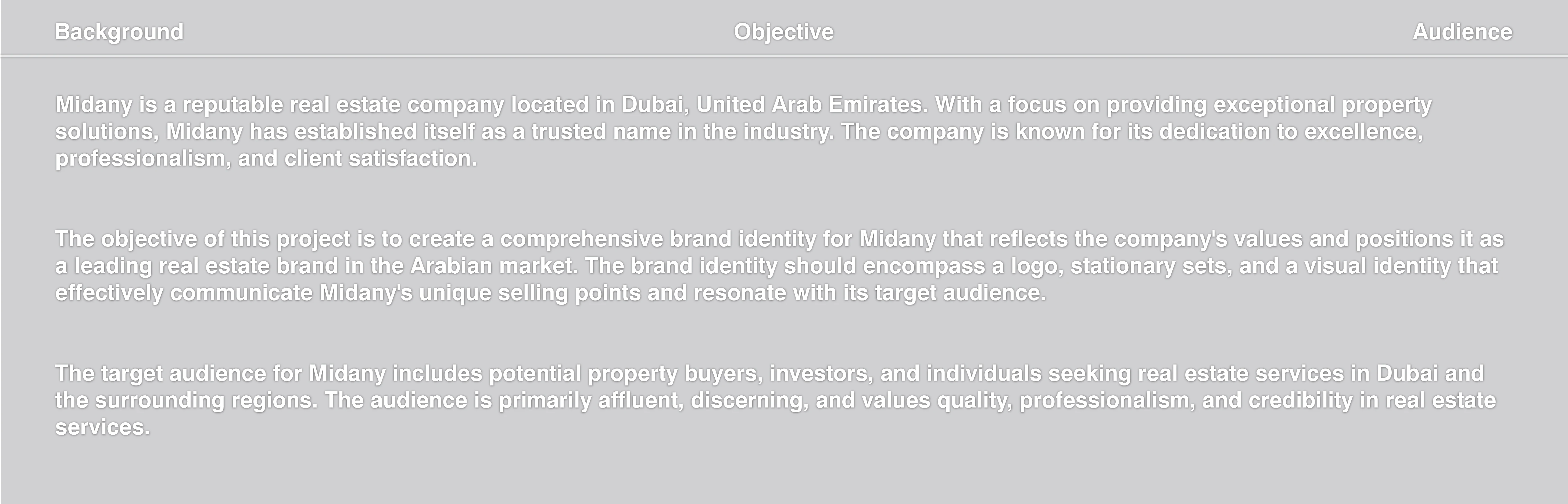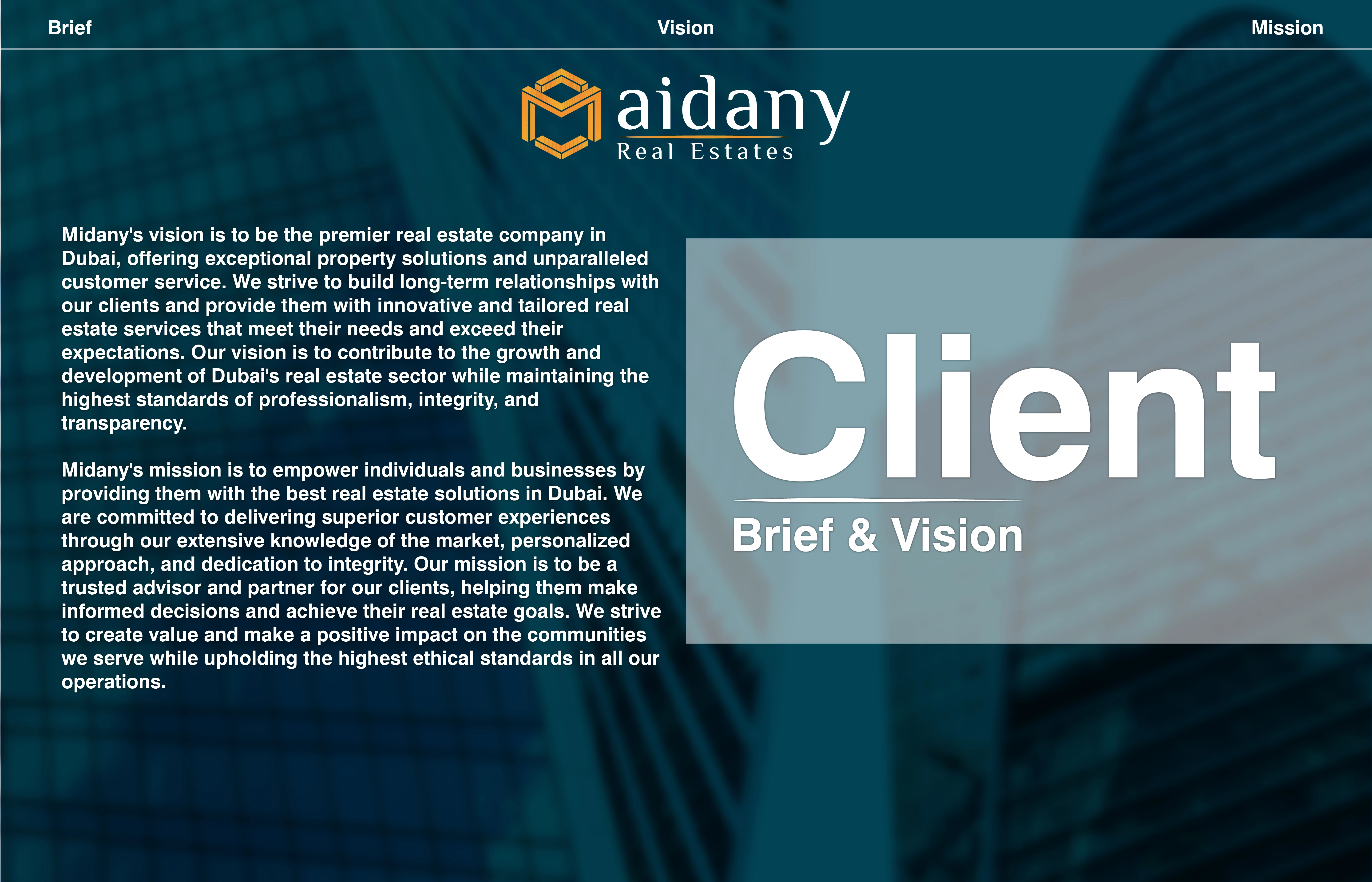 Developing a brand image that not only appeals to Midany’s high-end clientele but also stands out in the competitive Dubai real estate market.