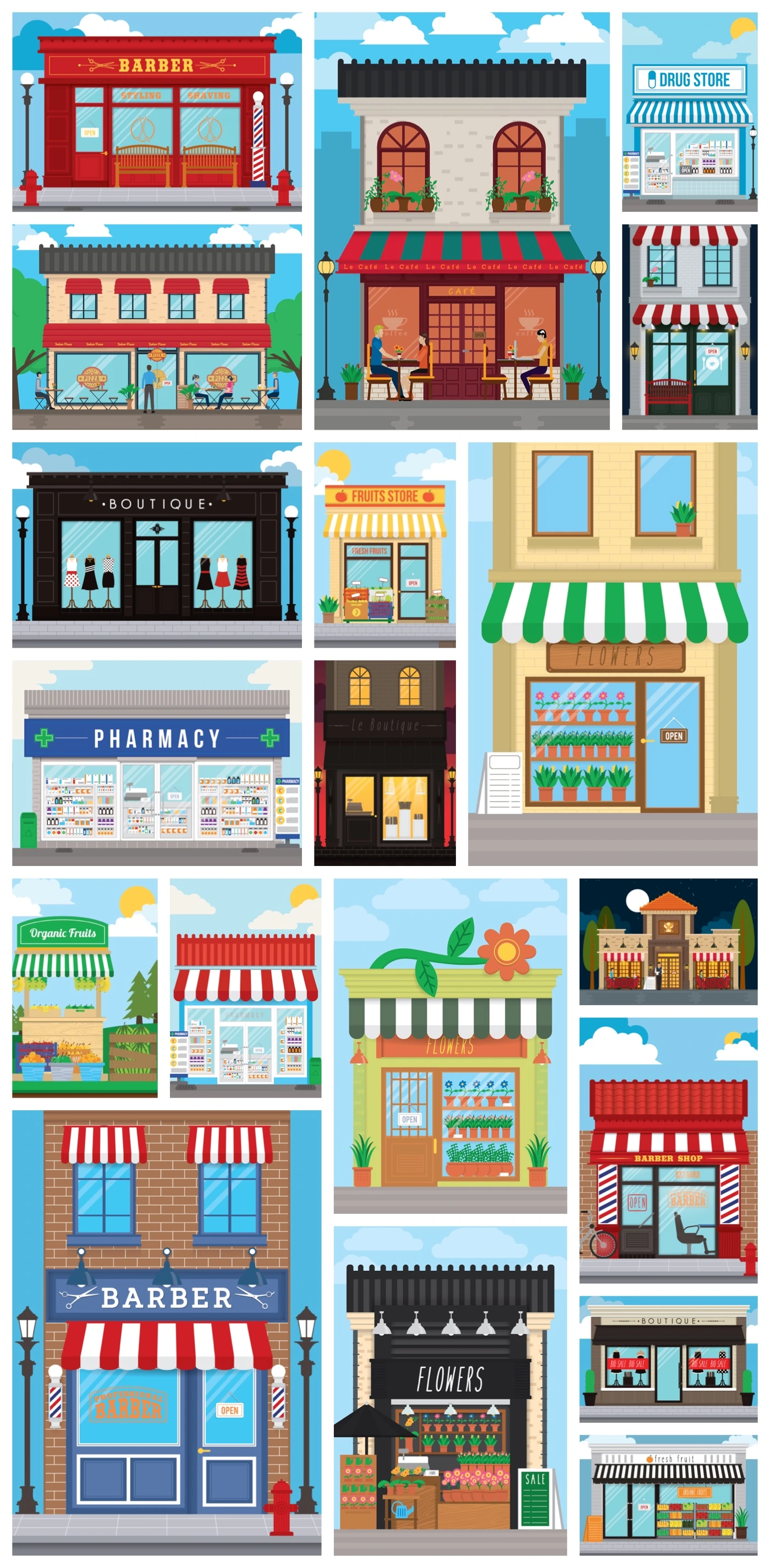 Created a storefront facade vector series for StockUnlimited 123RF in 2015, delivering detailed, market-ready stock assets within one week for diverse business.