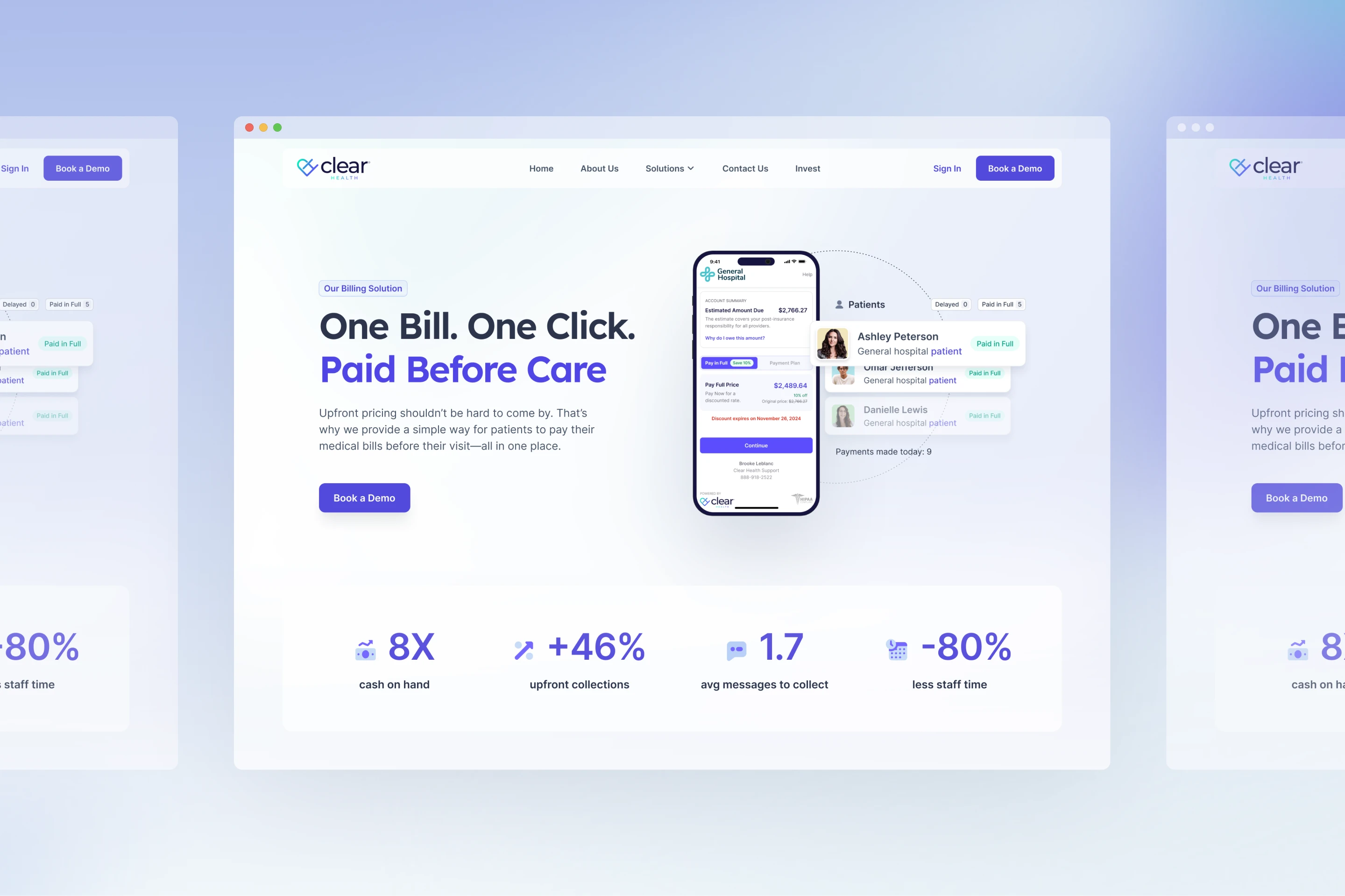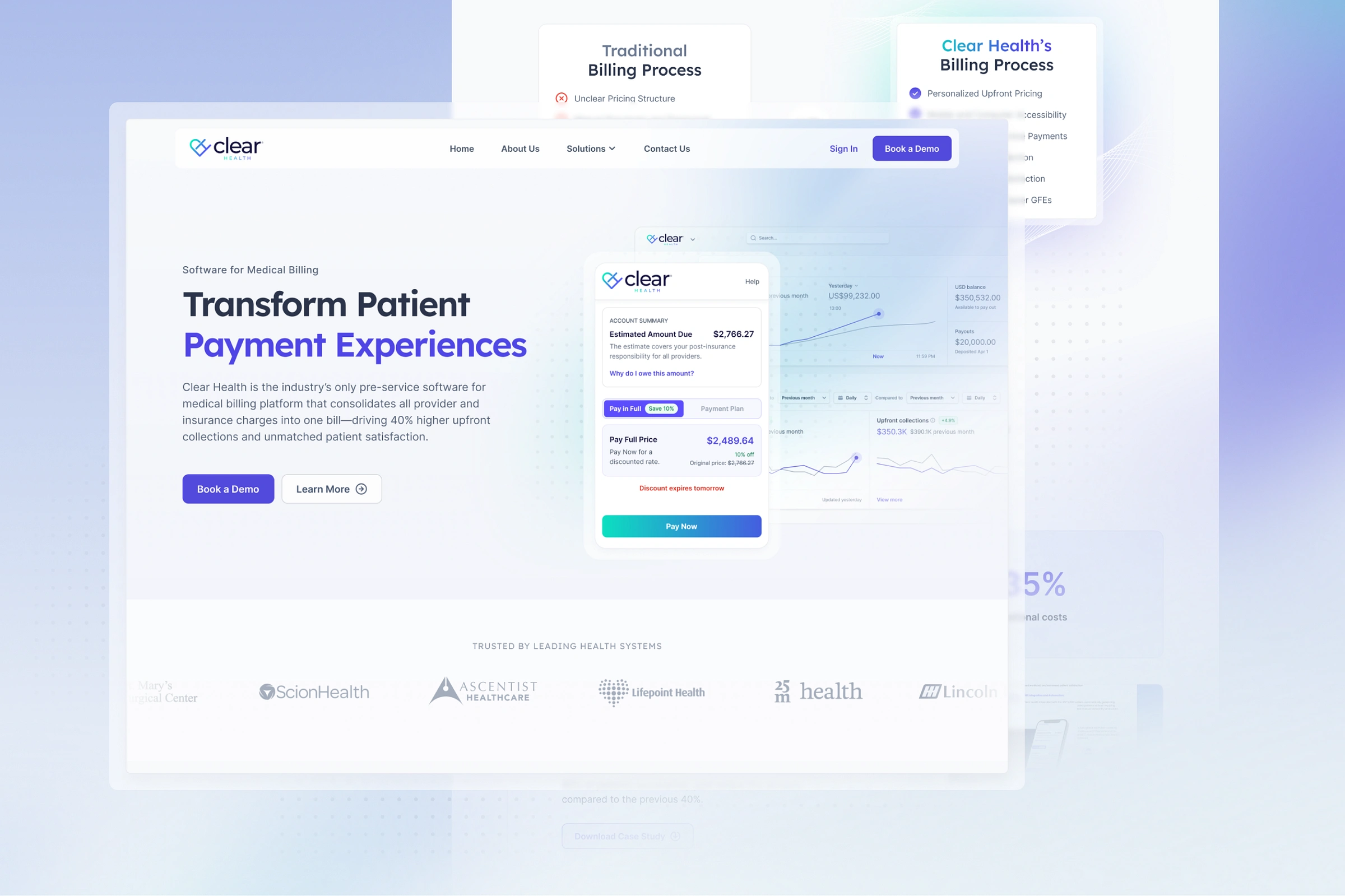 A website redesign for Clear Health, a medical billing software company for hospitals and ASC owners. Increased traffic by 200% and increased demo bookings.