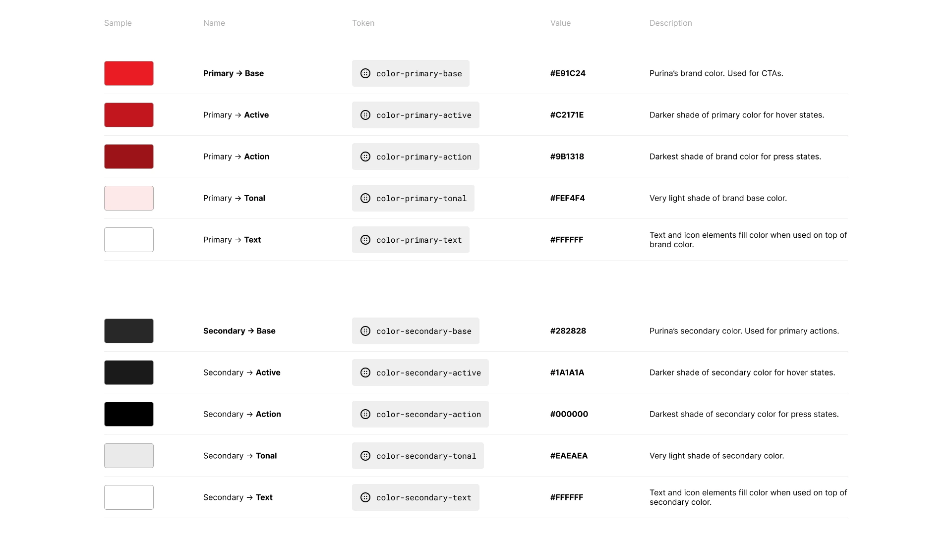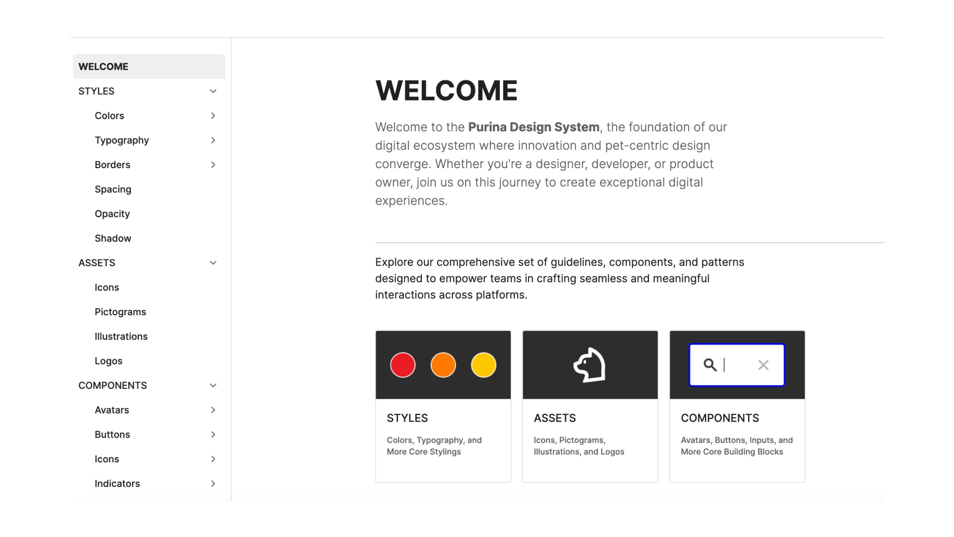 Working alongside the Product Design Lead as my knowledge partner, I begun constructing the foundations of a robust design system within Figma, tailored specifically for Purina's digital ecosystem. Dubbed PDS (Purina Design System), we organized four key areas: Styles, Assets, Components, and Patterns. I worked through them in that order, using the Styles (Colors, Typography, etc) as a base for Assets, some of which are nested into Components, some of which are compounded into Patterns.