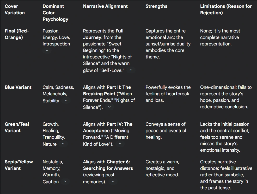 This version uses a warm, monochromatic, sepia-toned palette. This color scheme immediately evokes nostalgia, memory, and the passage of time. The inset, box-like image of the hands creates a more literal, illustrative feel, as if one is looking at an old photograph. This approach aligns well with Chapter 6, "Searching for Answers," in which Aanya pores over old messages and memories, trying to make sense of the past. The design successfully frames the story as a reflection. However, this is also its primary limitation. By framing the narrative so explicitly as a memory, it creates an emotional distance for the reader. It suggests the story is already over, rather than inviting the reader to experience Aanya's journey in the present tense. The more symbolic and immersive approach of the final cover proves more powerful and universal.