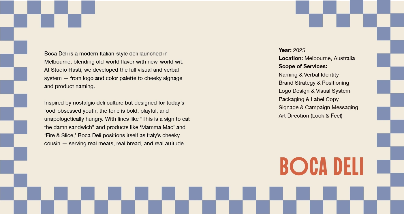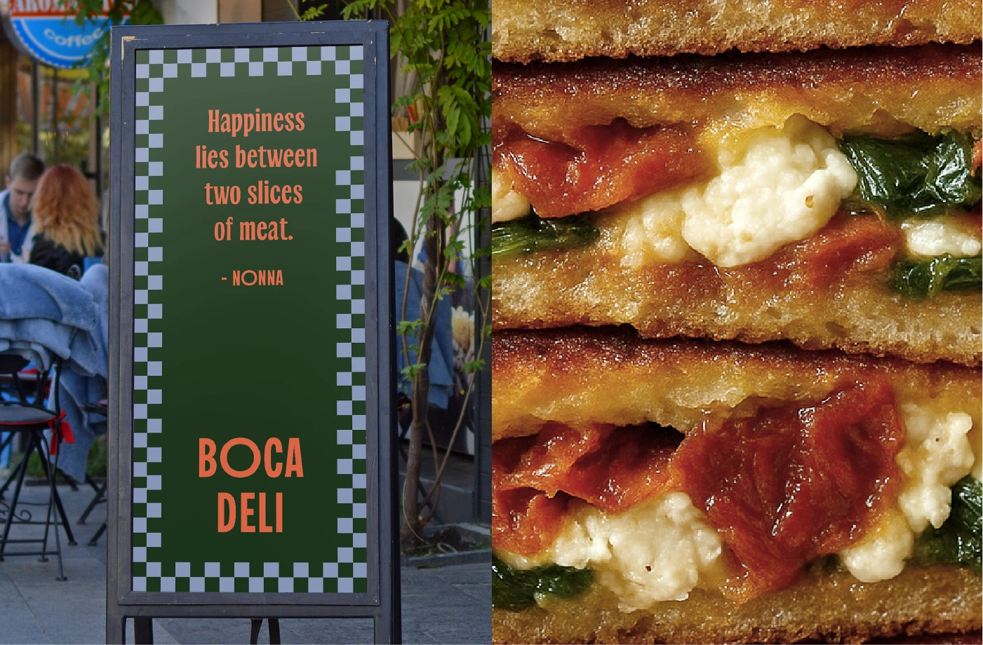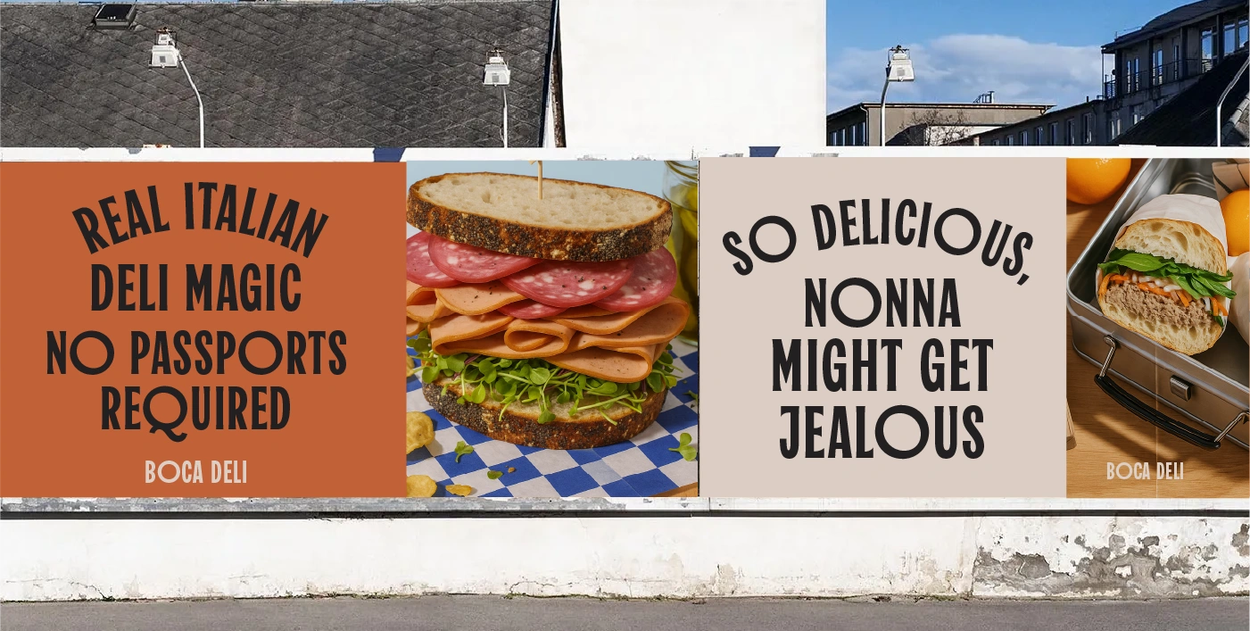 Boca Deli is a modern Italian-style deli in Melbourne, blending flavor with wit. We developed the full visual and verbal system - from logo to cheeky signage.