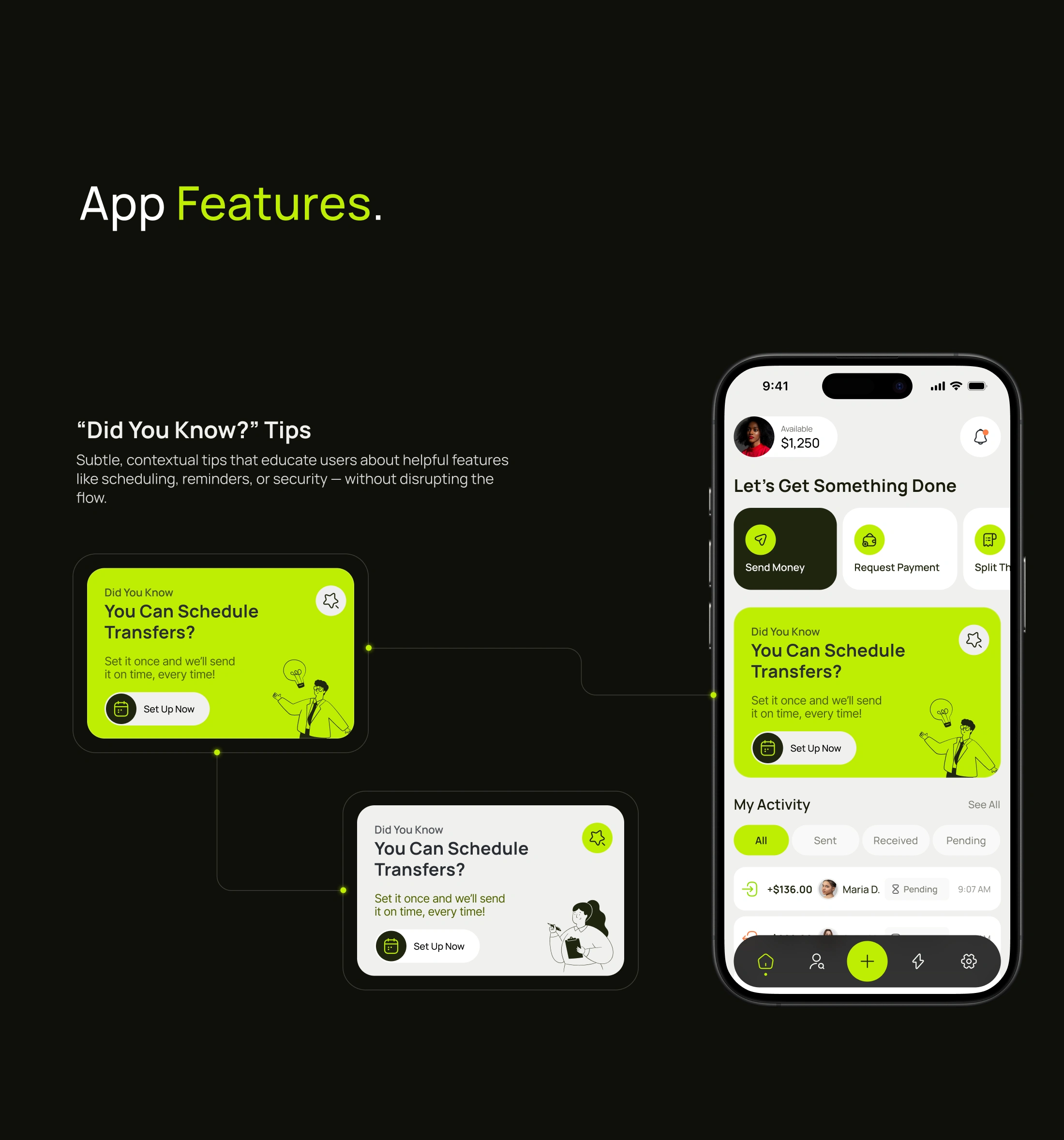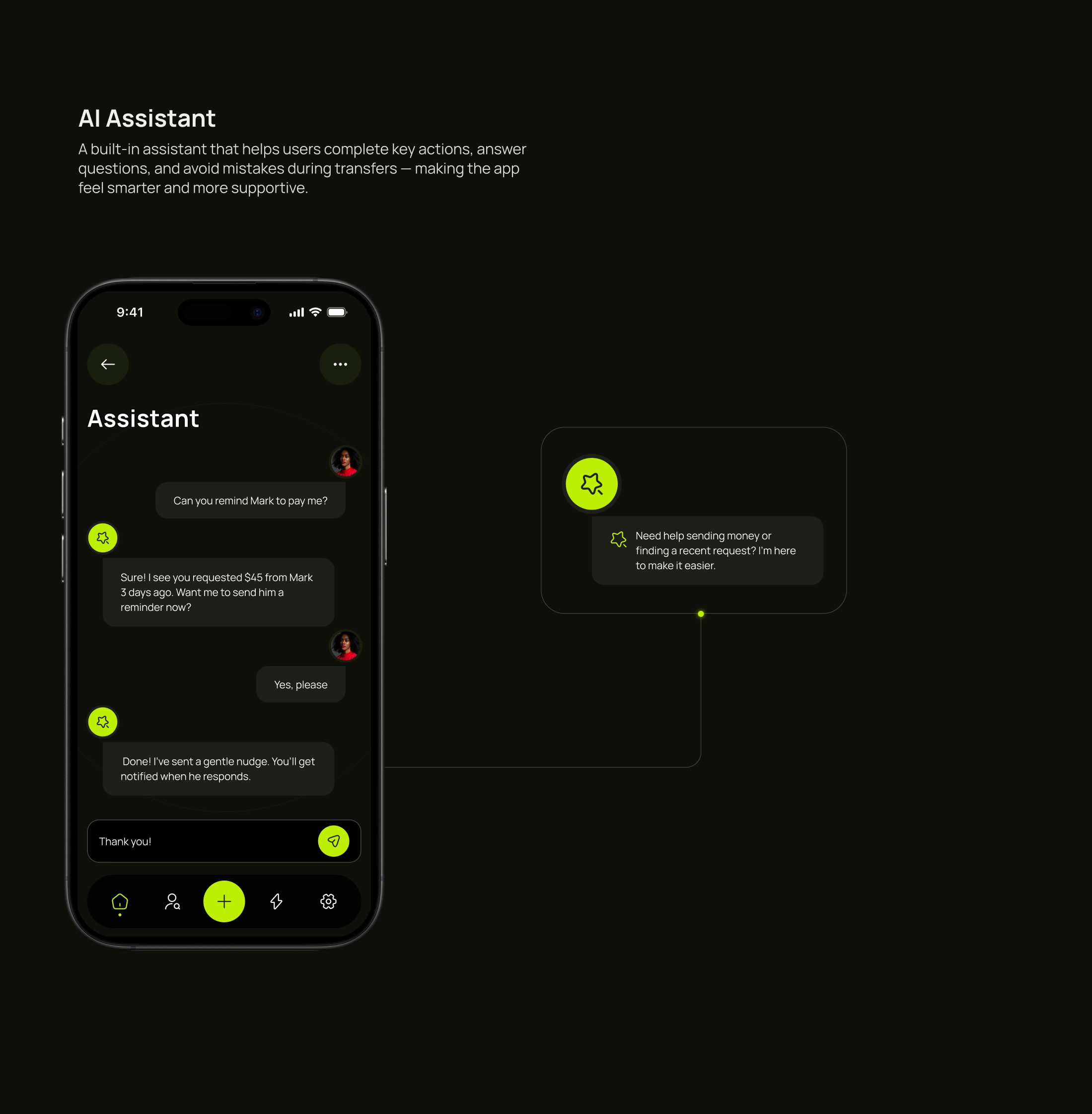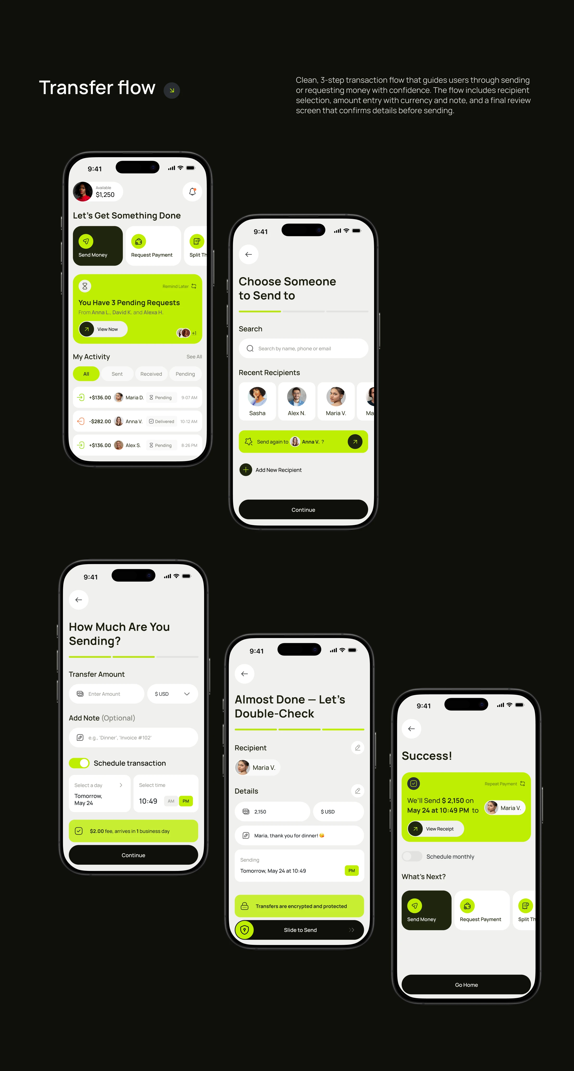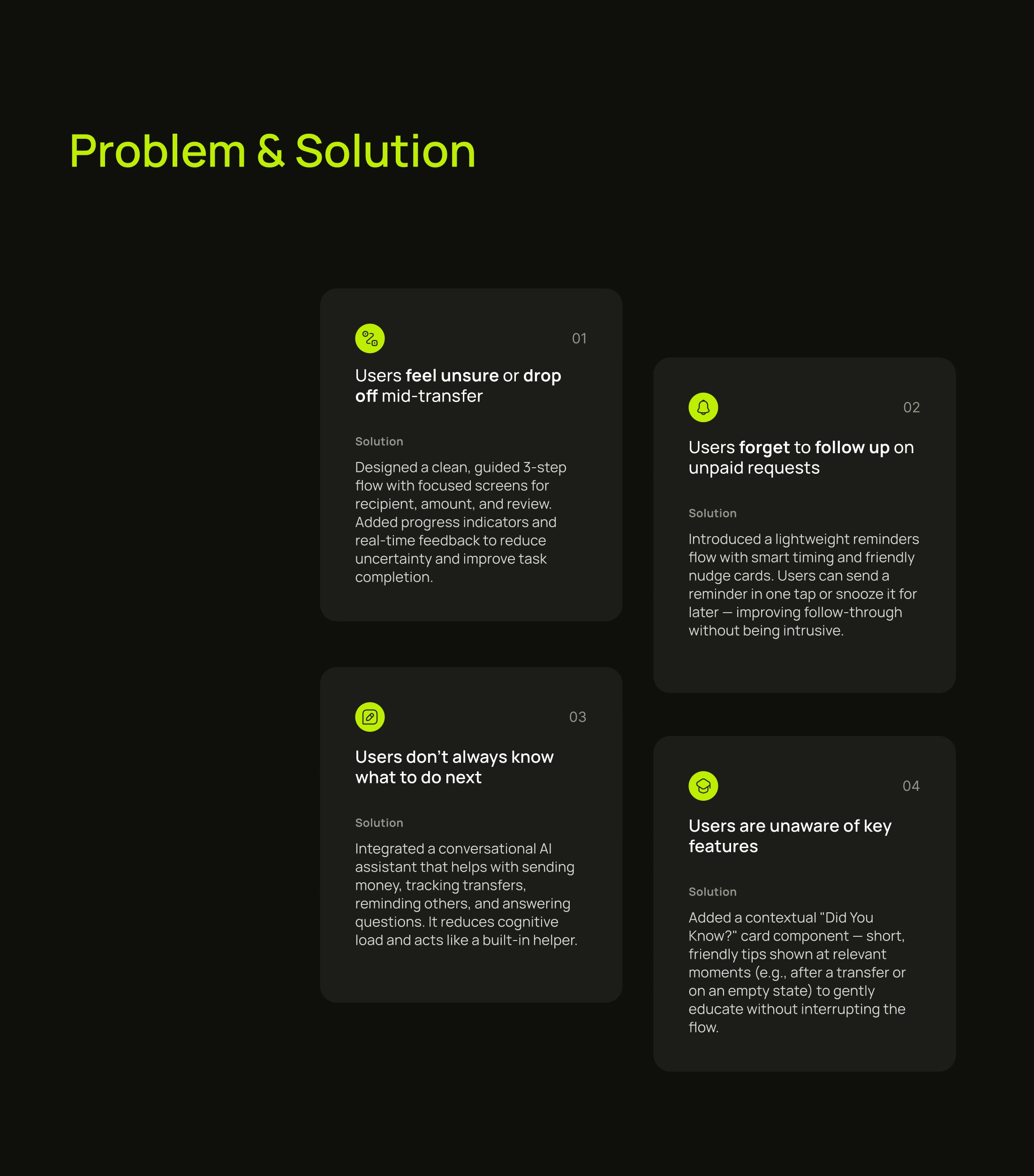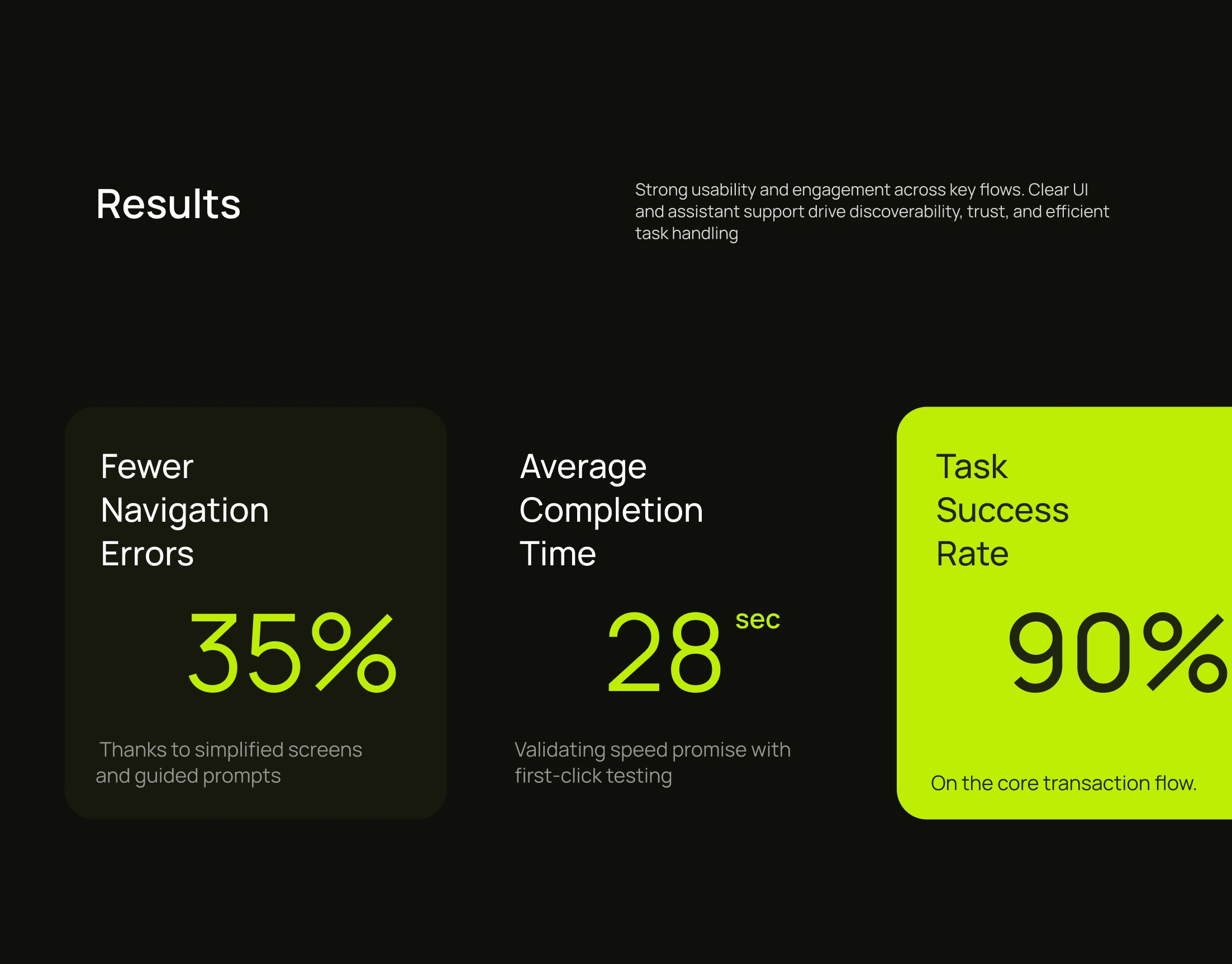Designed banking app flows, boosting transaction success to 90% and cutting completion time to 28 seconds through intuitive UX and AI guidance.