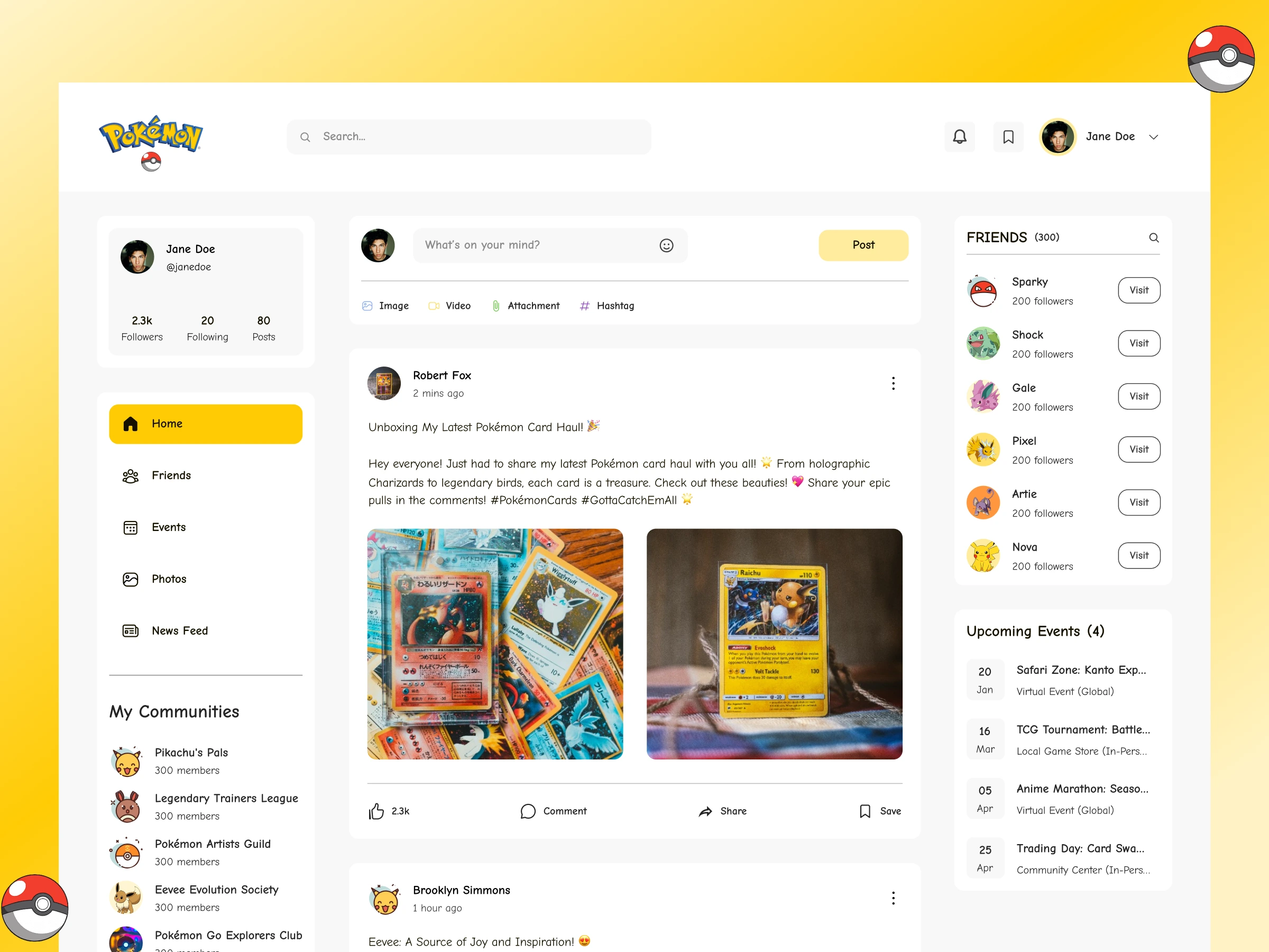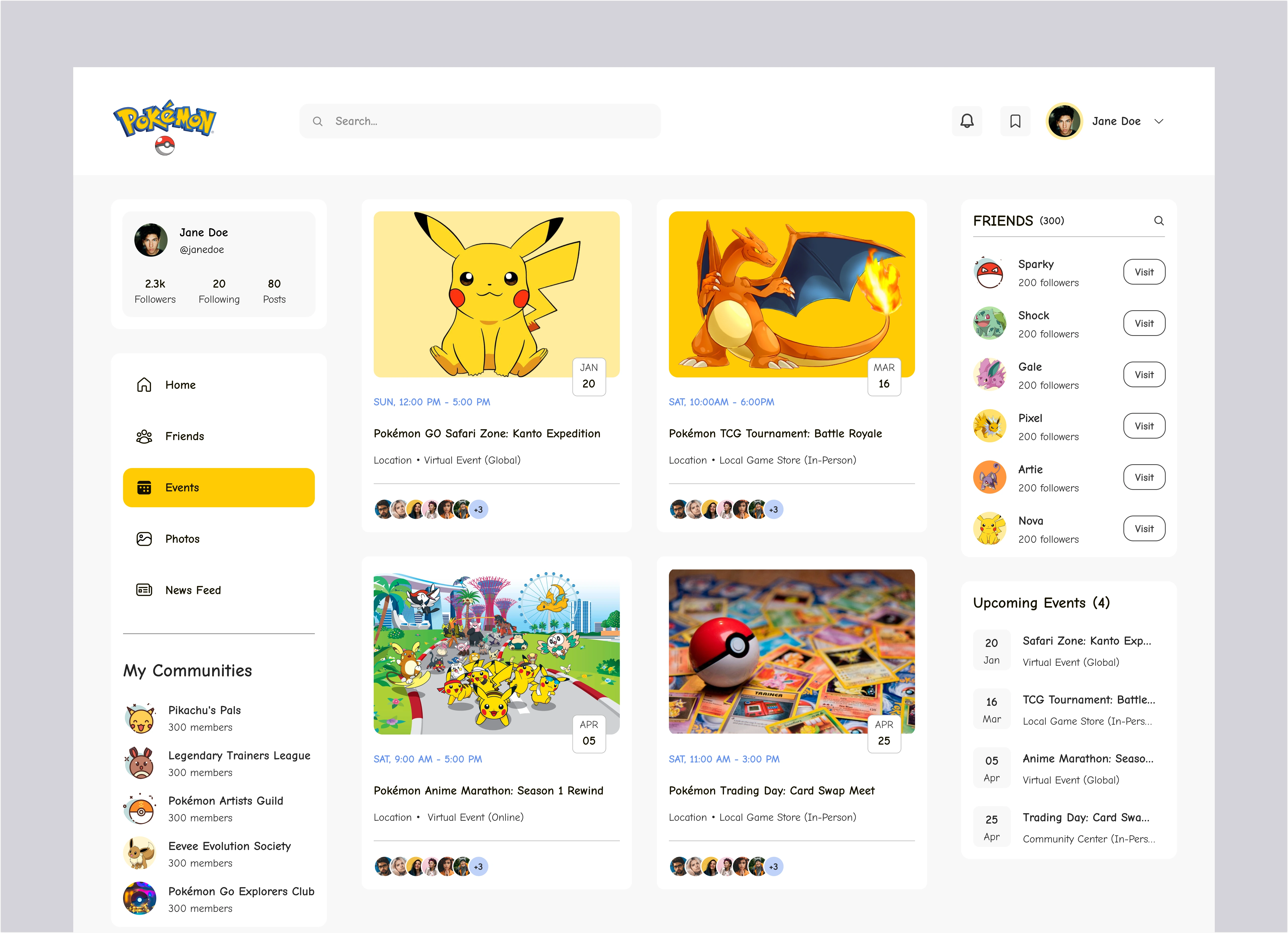 This project was part of a Pokémon design challenge focused on reimagining a Pokémon homepage. The concept explored a Pokémon-themed social platform where fans can connect, share content, and engage with the community. The homepage serves as the entry point into this ecosystem, setting the tone, visual identity, and core navigation for the product.
