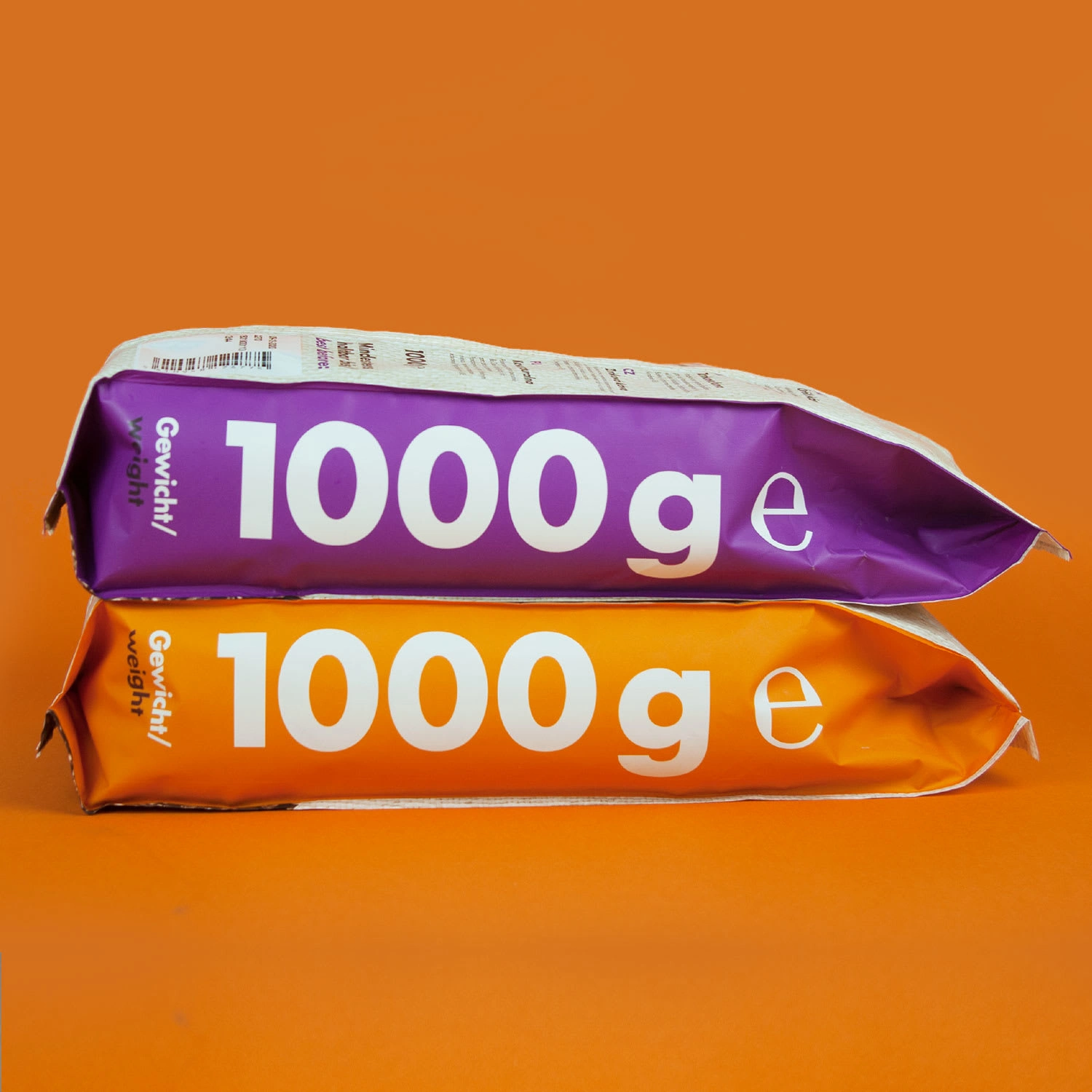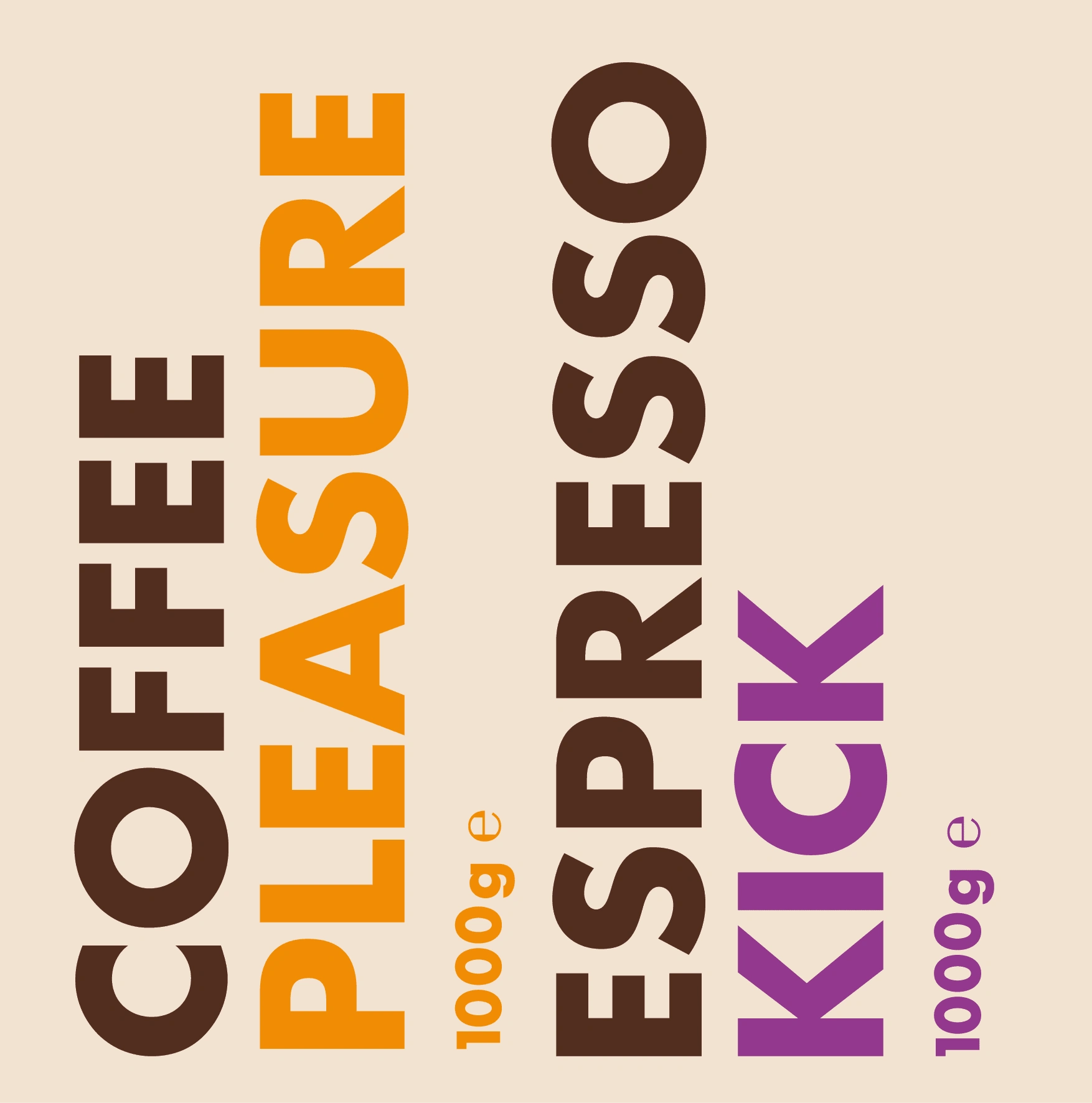Striking Packaging design for the packaging of espresso & coffee beans for B2B, as well as condiments and cups. The generous use of a color code and bold typography are intended to make it easier for petrol station staff to distinguish between the different types of beans.