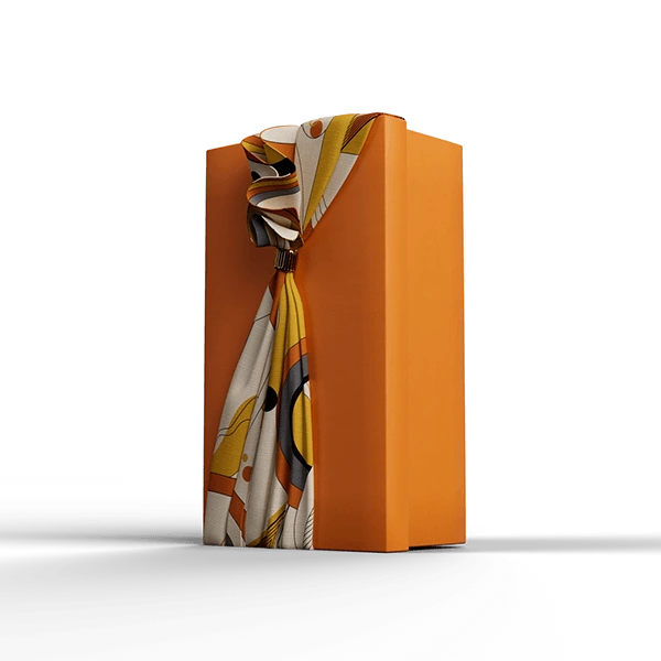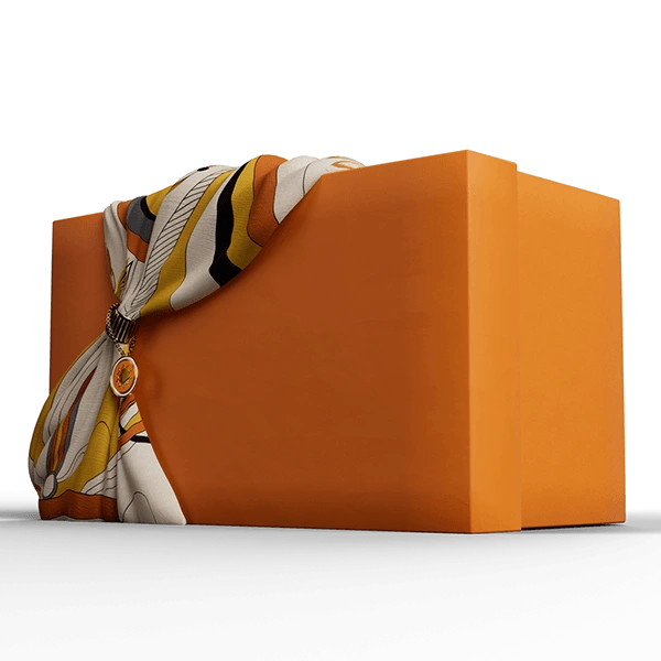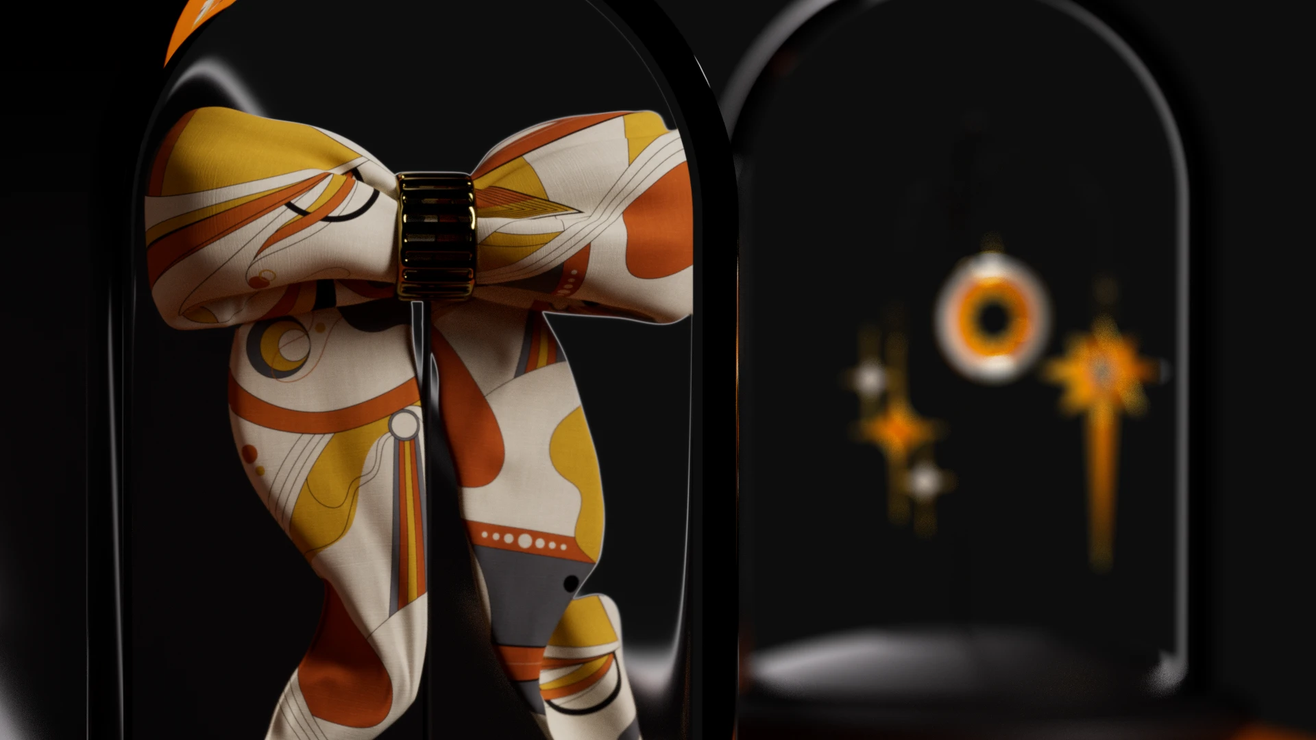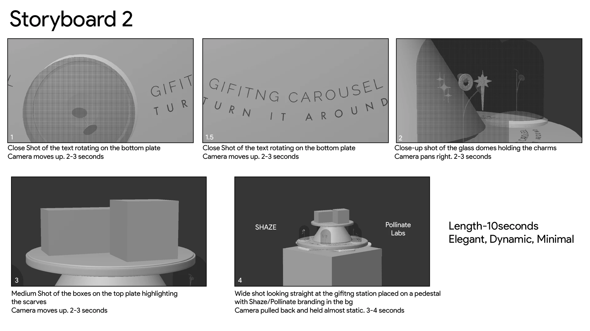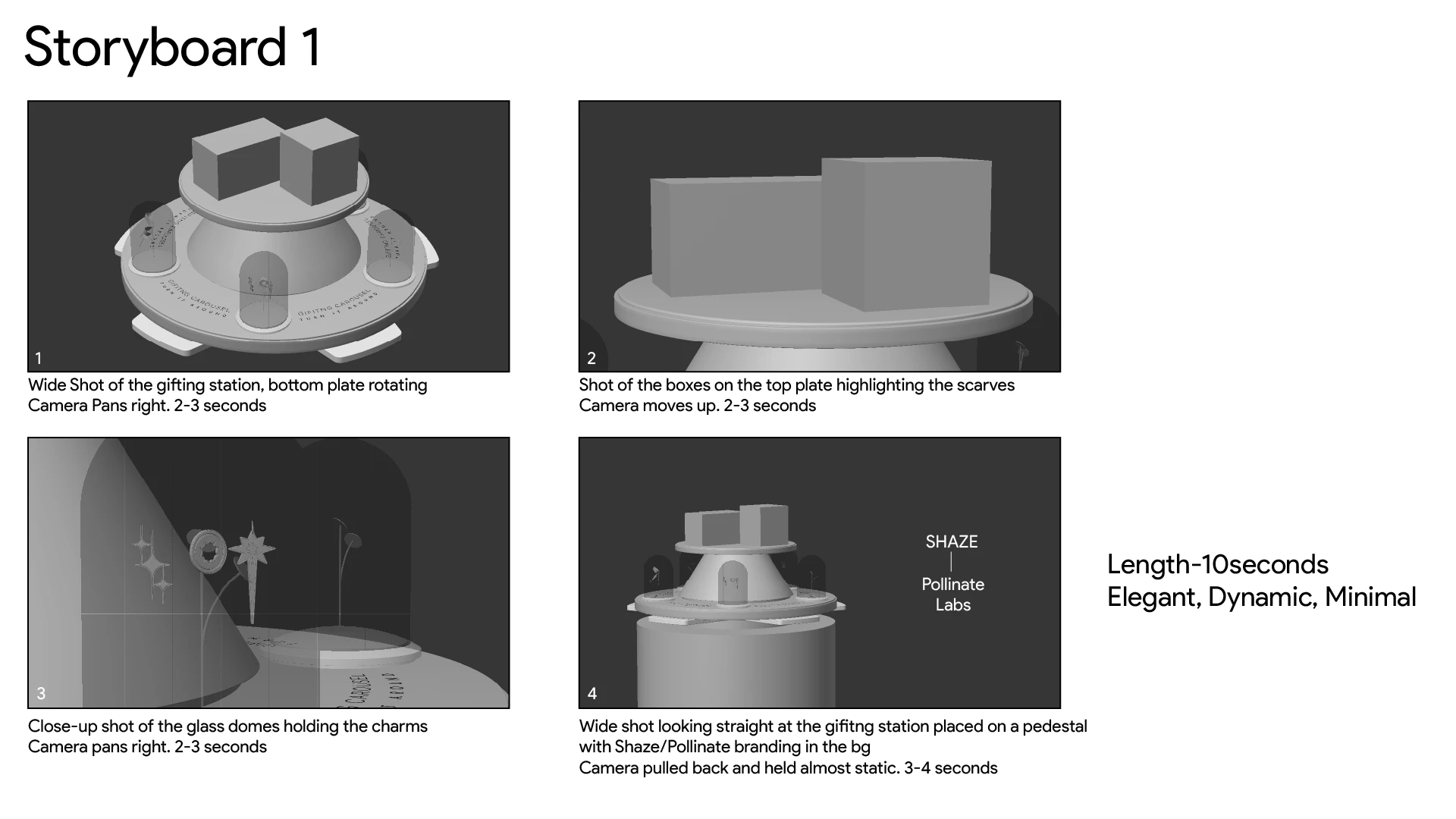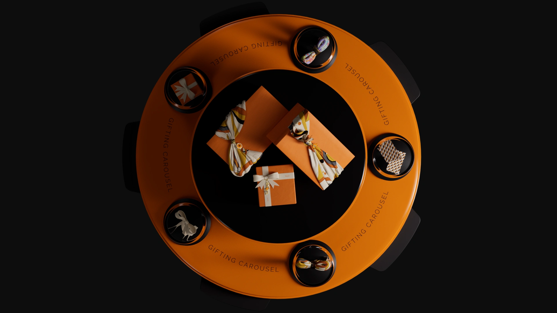 The carousel itself is a study in luxury materials: smooth glass, polished aluminum, and steel converge to frame the rotating tiers. On the lower platform, text graphics introduce the Shaze charms, featuring glossy enamel fronts, gold-plated backs and borders, and gold chains, while the upper tier displays a silk scarf looped through a gold ring, satin ribbons, and three custom Shaze boxes: an orange box brimming with scarf, ring, and charm; a ribbon-wrapped gift with charm; and a tall accent box. Subtle glass reflections and sheens underscore each element’s qualities.