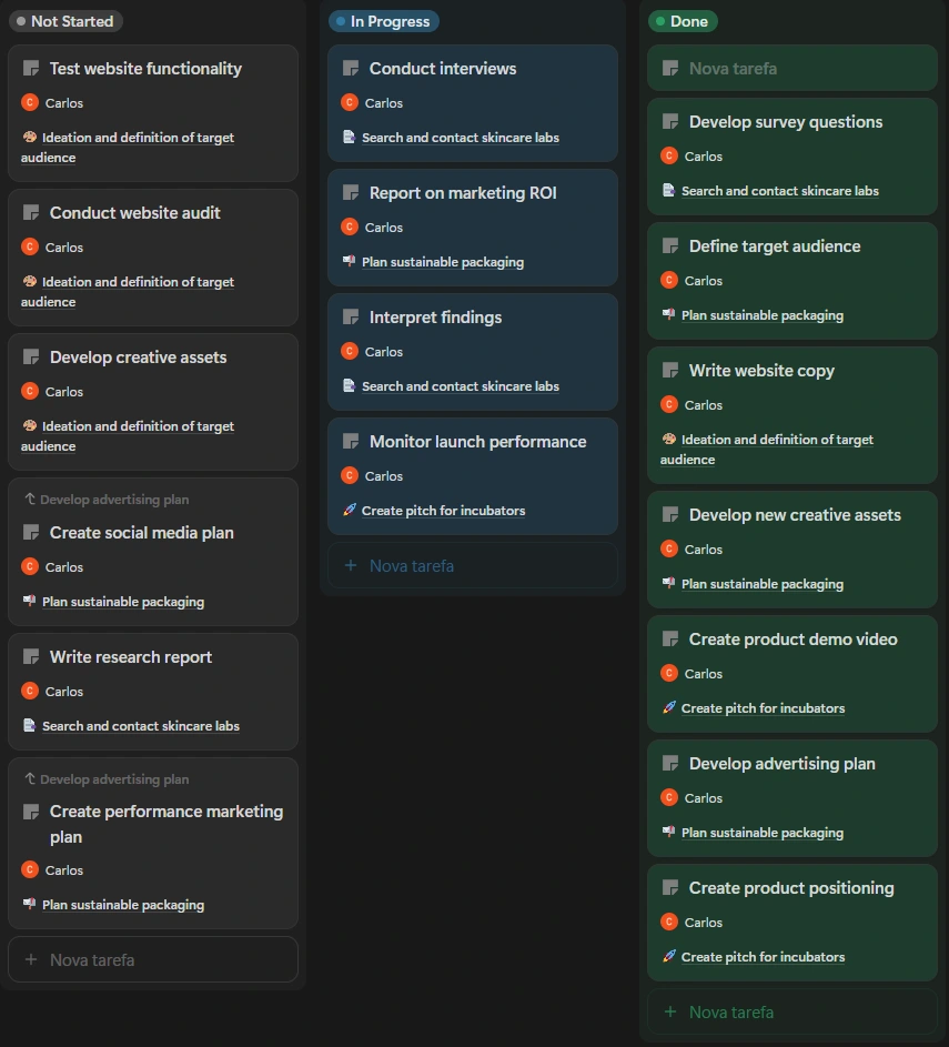 Additionally, I built a custom Kanban board to manage day-to-day execution across multiple areas — from website development and creative assets to marketing and product positioning. This system allows me to track responsibilities, stages of progress, and ensure the team stays aligned.