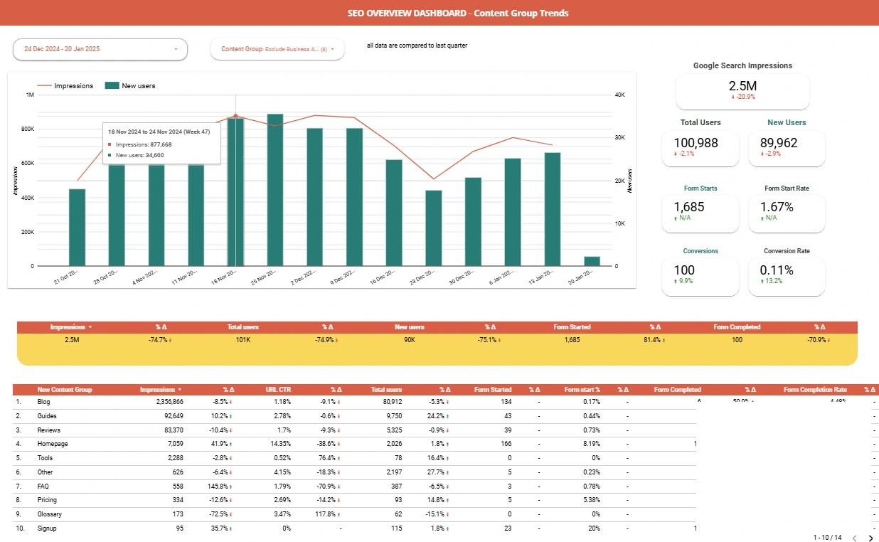 The client got a deeper insight on the performance of content across content groups in driving organic traffic and conversions.
